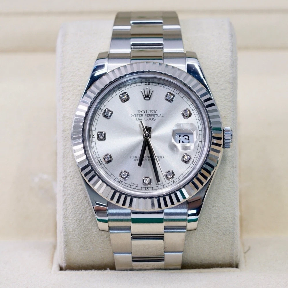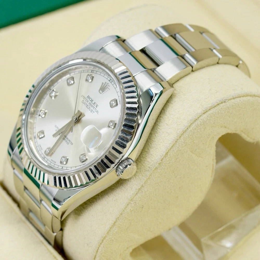 Description GENERAL DESCRIPTION The 116334 is an expression of timeless prestige. It features a silver Diamond dial that add a touch of classic sophistication. Its 41 mm stainless steel case, complemented by a white gold bezel, perfectly fuses durability and luxury. Equipped with a high-precision automatic movement, it guarantees exceptional performance and reliability. WATCH DETAILS The watch is in excellent condition. Clea crystal and bezel. If you have any additional questions regarding the condition of the watch please do not hesitate to contact us. ABOUT US We are a company dedicated to buy and sell luxury watches. We have the highest quality standards and the most detailed selection processes. Each of our pieces is previously checked by our watchmaker to authenticate the quality of the piece. DISCLAIMER 1 - We use a macro lens for professional photography, it is possible that dust or particles may be perceived in the picture. The description of the watch is given in the description 2 - When packed, the watch is handled carefully and meticulously, however, due to transportation and delivery, slight handling marks may occur. COMES WITH Box : Yes Papers : Yes