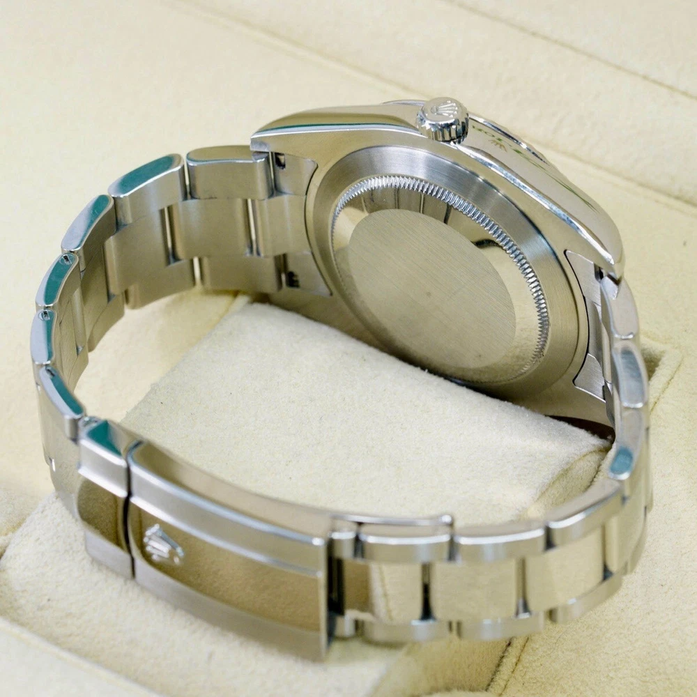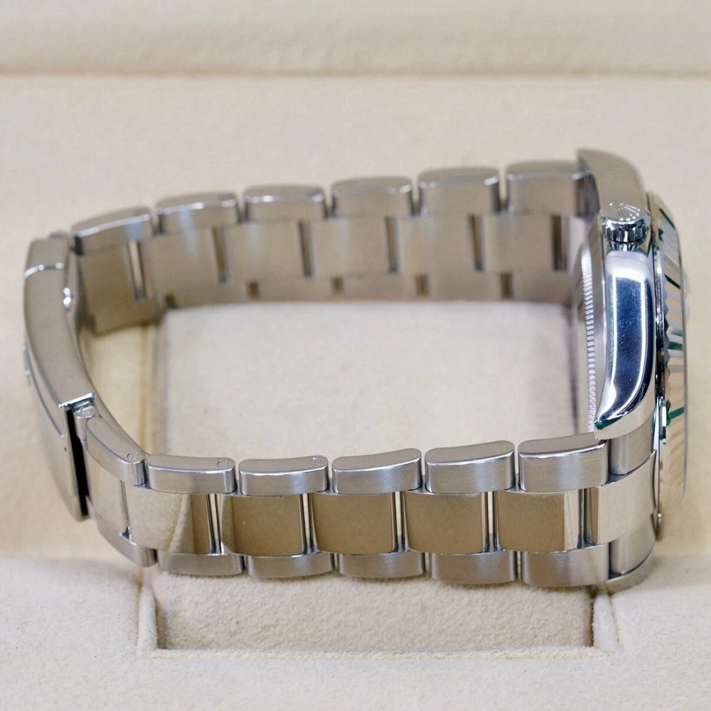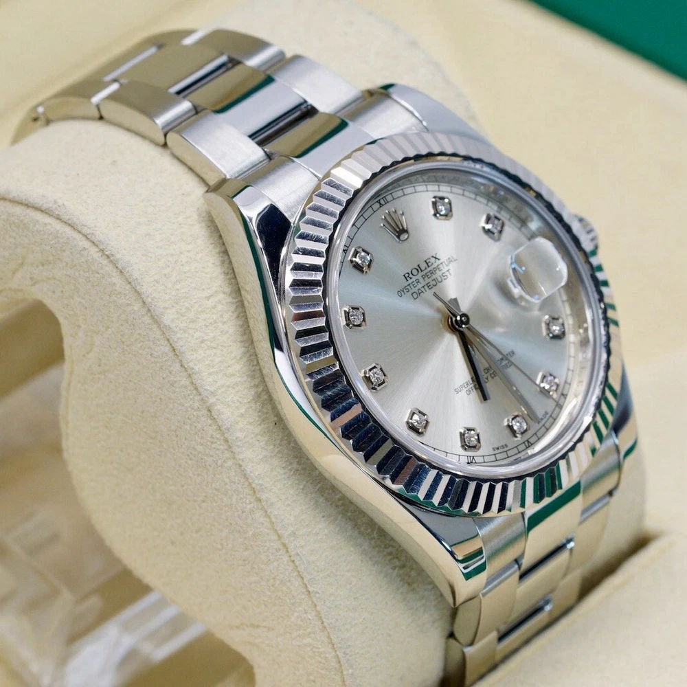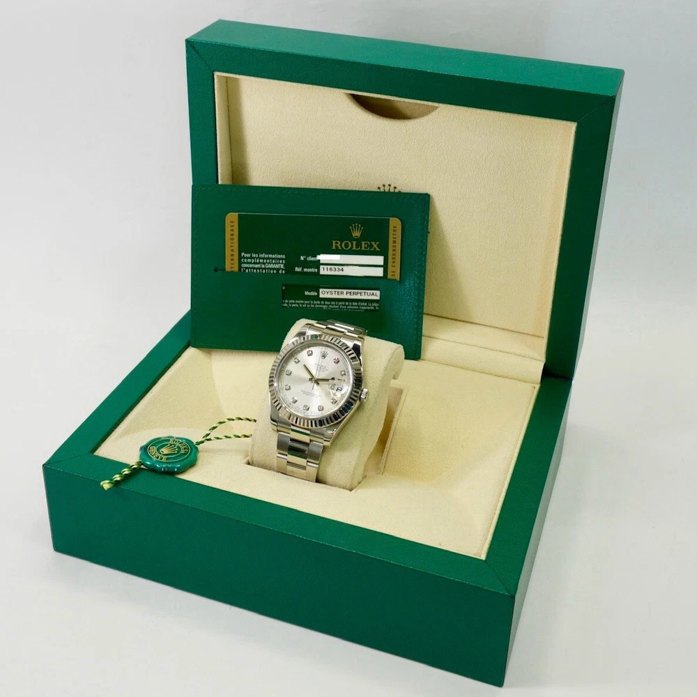 Lug Width: 20 mm Case Finish: Polished Band Material: Stainless Steel Band Color: Silver Handmade: No Brand: Rolex Country/Region of Manufacture: Switzerland Case Thickness: 12 mm Caseback: Solid Dial Color: Silver Number of Jewels: 31 Jewels Vintage: No Case Size: 41 mm Max Wrist Size: 7.26-7.5 in Display: Analog Department: Men With Service Records: No Water Resistance: 100 m (10 ATM) Customized: No Reference Number: 116334 Features: Seconds Hand, Sapphire Crystal, Water-Resistant, Diamond Accent, Self-Winding, Swiss Made, Screwdown Crown, Chronometer, Date Indicator, Swiss Movement Dial Pattern: Sunburst With Original Box/Packaging: Yes Band/Strap: Rolex Oyster Watch Shape: Round Year Manufactured: 2015 Case Color: Silver Model: Rolex Datejust With Papers: Yes Case Material: Stainless Steel, White Gold Bezel Type: Fluted Movement: Mechanical (Automatic) Bezel Color: Silver Indices: Diamond Markers With Manual/Booklet: Yes Closure: Hidden Fold Clasp Type: Wristwatch Style: Luxury, Dress/Formal Band Width: 20 mm