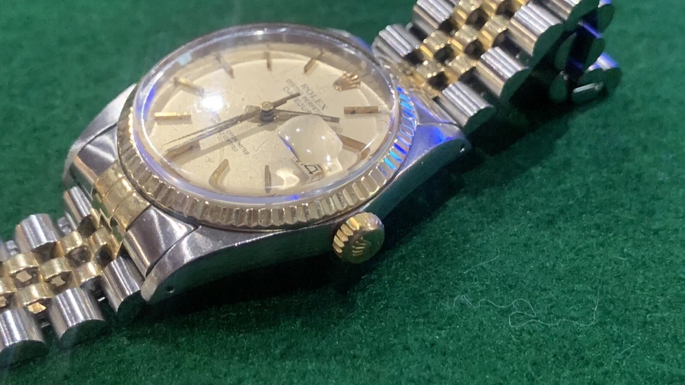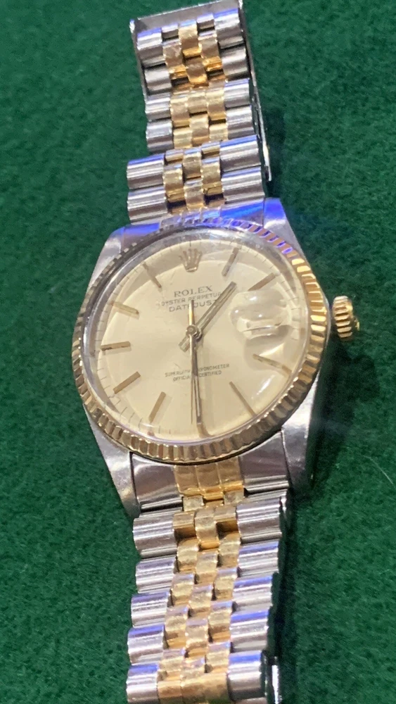 Available now is this excellent Rolex DateJust 16013 from 1979 Below are the features. • Model: Rlx Datejust 16013 . Serial #7,400,000 series . Year: 1983 • Movement: Rlx Calibre 3035 (automatic movement with quickset date) • Case: 36mm stainless steel with 18k yellow gold fluted bezel • Bezel: 18k yellow gold, fluted design • Dial: Silver dial with applied hour markers and luminous hands • Hands: Gold-tone hands with luminescent coating • Crystal: Acrylic crystal with Cyclops lens over the date • Water Resistance: 100 meters (330 feet) • Bracelet: Two-tone (Rolesor) stainless steel and 18k yellow gold Jubilee bracelet with a folding clasp • Functions: Time, date display at 3 o’clock (quickset), power reserve of approximately 48 hours • Special Features: Classic two-tone design with champagne dial, iconic fluted bezel, versatile and elegant for both formal and casual occasions This comes with No Box and papers. It looks sharp, and runs excellent. Has recently been serviced. Crystal has some small scratches, that can be buffed but is not overly noticeable. See photos measurements on bracelet I’m 7-1/2” inches and there is still room to fit larger to 8”.