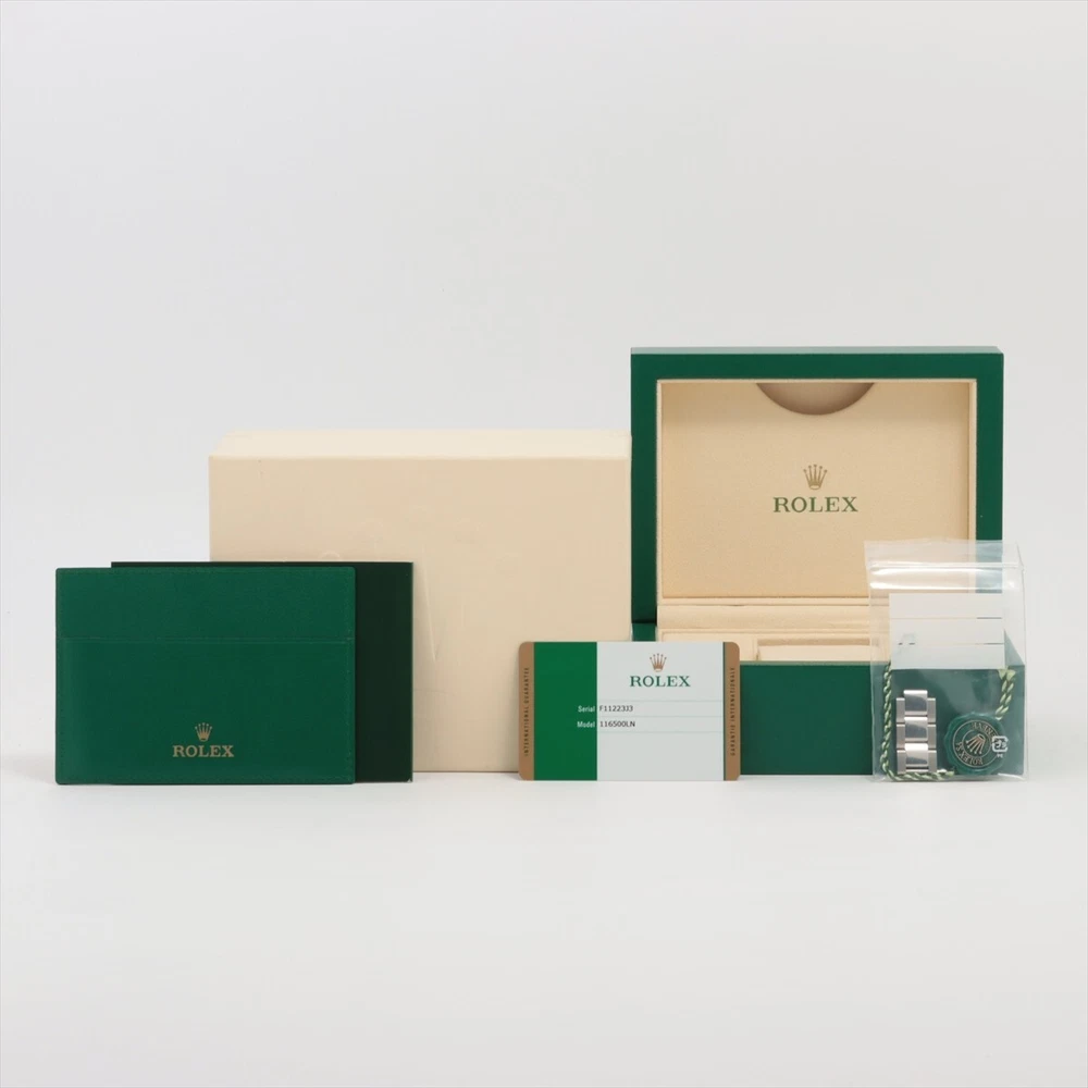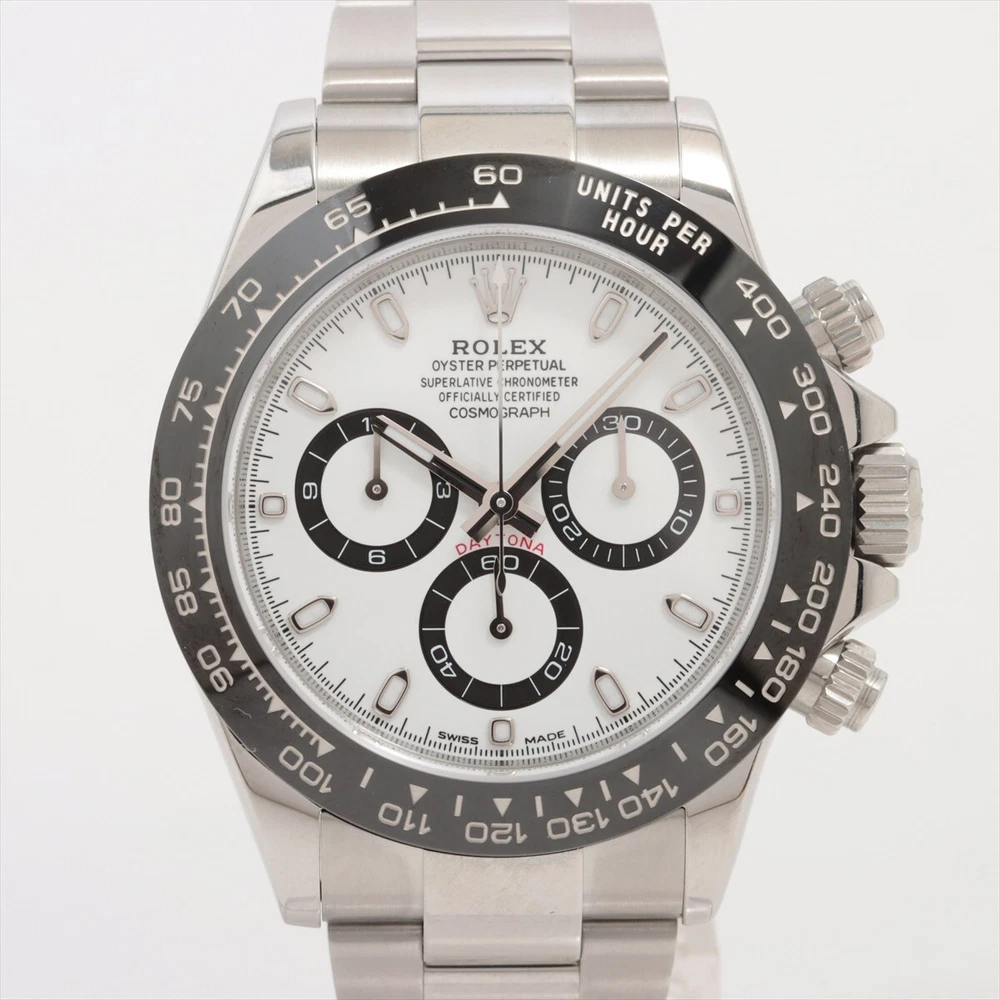 Rolex Cosmograph Daytona 116500LN "Panda" - Mint Condition - Full Set with 2017 Warranty Card Up for sale is the iconic Rolex Cosmograph Daytona 116500LN, featuring the much-desired white "Panda" dial with contrasting black sub-dials. This model is one of Rolex’s most coveted sports chronographs, combining timeless design with outstanding performance. A must-have for any serious collector. Condition: Mint Condition: Lightly worn with only minor, barely visible hairline marks. Unpolished: Retains its original factory finish. Crystal: Perfect, no scratches or chips. Bracelet: Tight with minimal wear, complete with all original links. What’s Included: Original Rolex Box Warranty Card Dated 2017 Full Set: Includes manuals, green hang tag, and warranty card holder. Key Features: Model: Rolex Cosmograph Daytona 116500LN Case Size: 40mm stainless steel Oyster case Dial: White "Panda" dial with black sub-dials Bezel: Black Cerachrom ceramic bezel with tachymeter scale Movement: Rolex Calibre 4130 automatic chronograph movement with a 72-hour power reserve Bracelet: Oyster bracelet in stainless steel with Oysterlock clasp This is a full set in mint condition, perfect for collectors or anyone looking to add a classic Daytona to their collection. The "Panda" dial is a timeless favorite and remains highly desirable on the market. Shipping: Fully insured and tracked shipping. Local pick-up available for verified buyers.