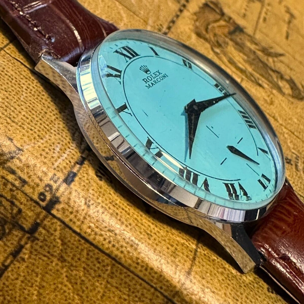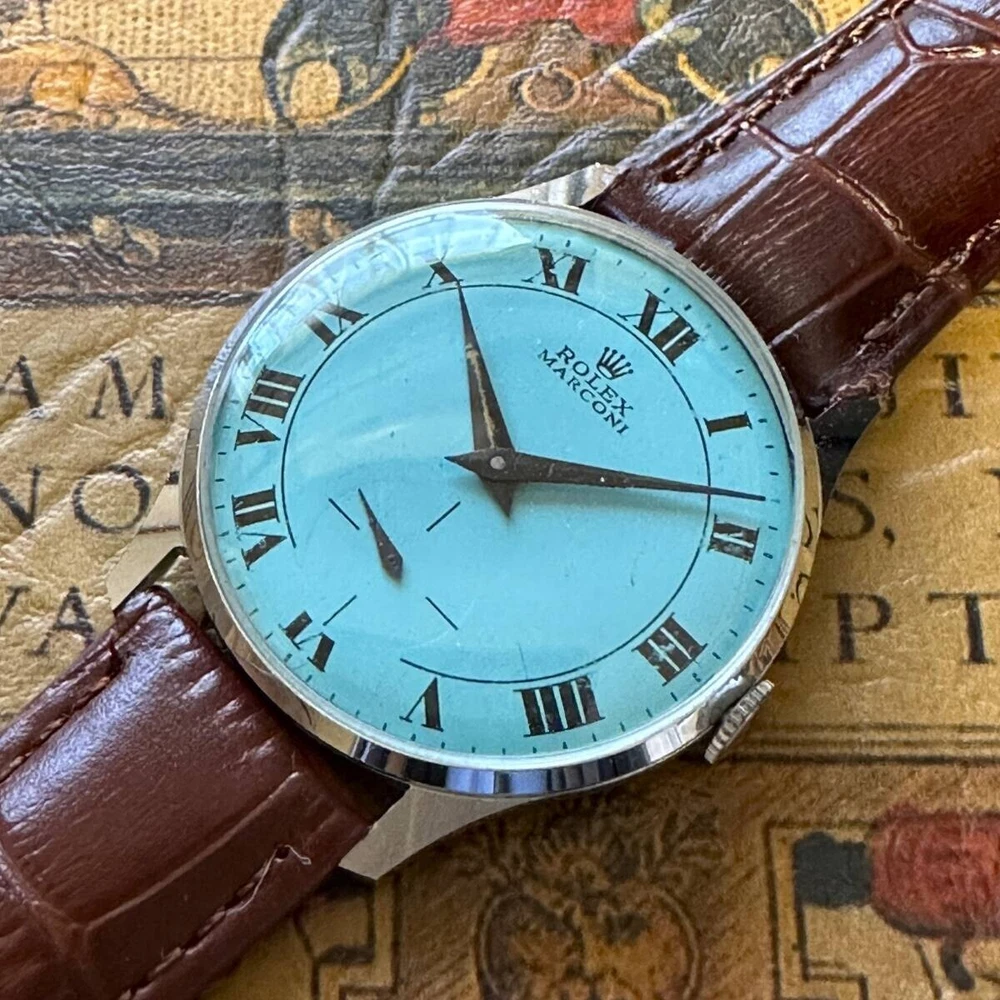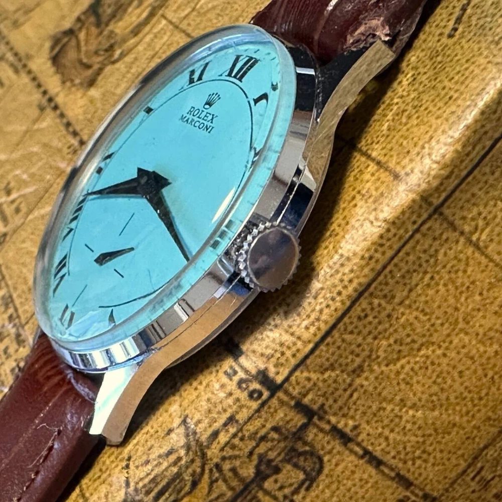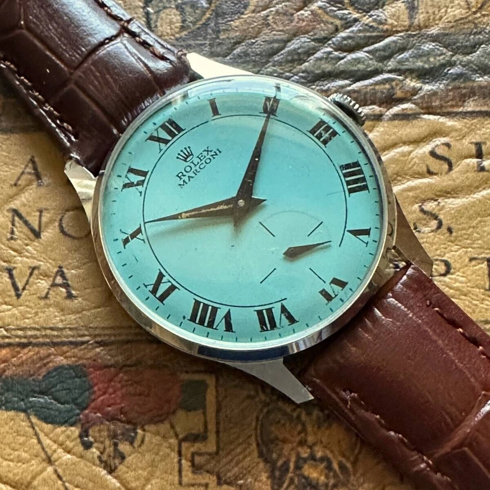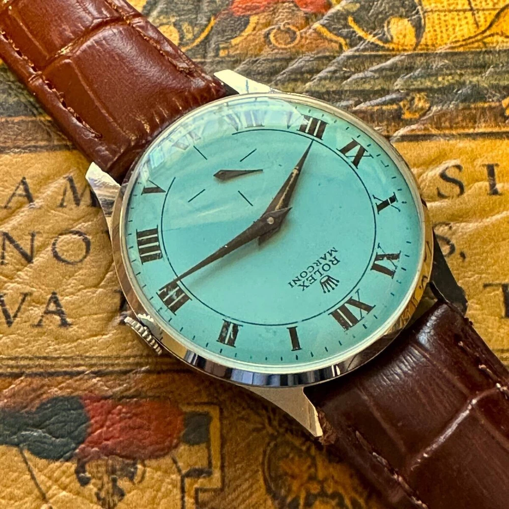 Band Color: Brown Brand: Rolex Type: Wristwatch Features: Small Second Department: Men Bezel Color: Silver Reference Number: Does not apply Case Size: 37 mm Display: Analog Case Material: Stainless Steel Style: CasualClassicDress/Formal Dial Color: Tiffany Blue Model: Rolex Marconi UPC: Does not apply gtin13: Does not apply Movement: Mechanical (Manual) Band Material: Leather Case Color: Silver