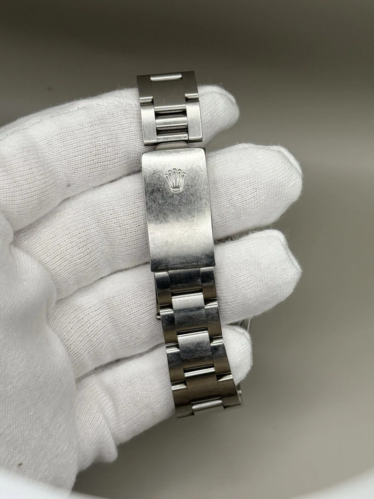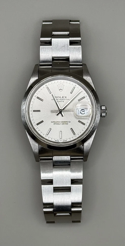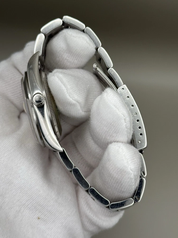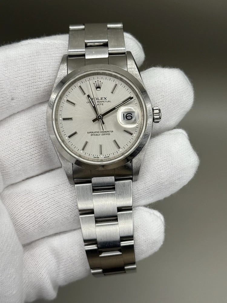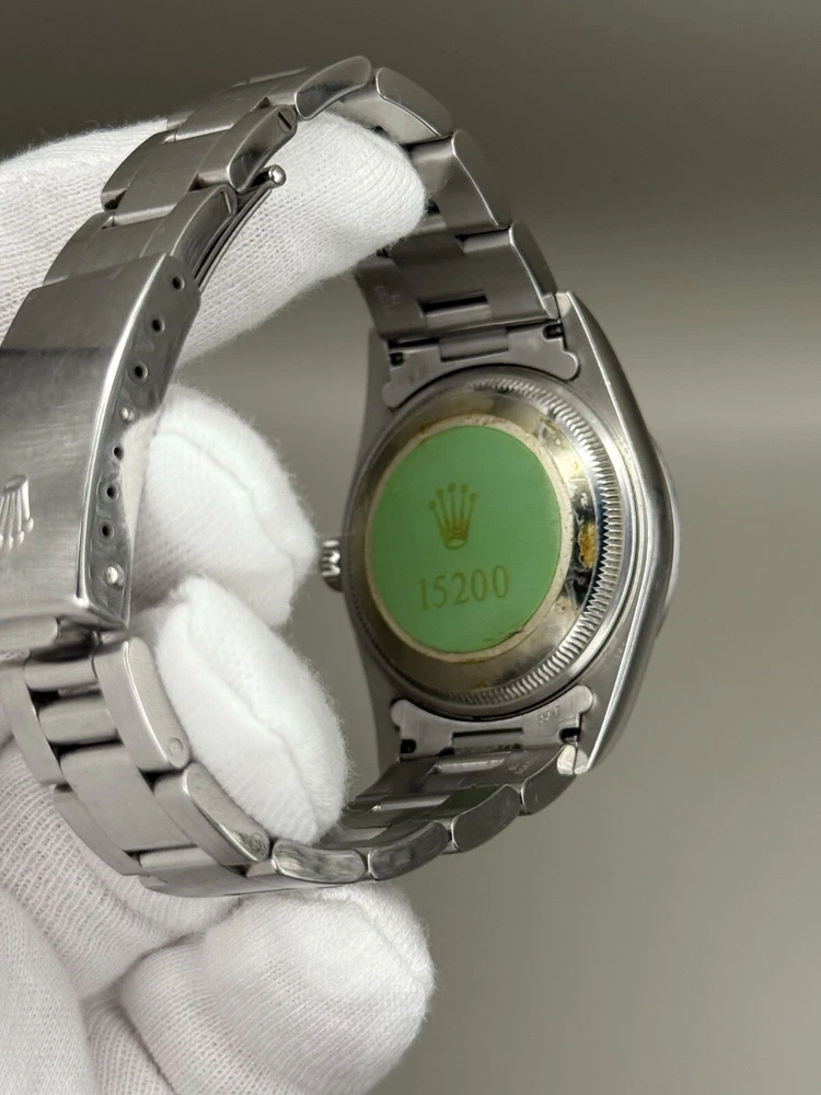 Bezel Color: Silver Dial Pattern: Silver Display: Analog Band/Strap: Rolex Oyster Case Size: 34 mm Case Color: Silver Dial Color: Silver Movement: Mechanical (Automatic) Reference Number: 15200 Max Wrist Size: 6.76-7 in Closure: Butterfly Clasp Caseback: Screwback Band Material: Stainless Steel Band Color: Silver Indices: Baton Indexes Case Material: Stainless Steel Type: Wristwatch Customized: No Bezel Type: Smooth Seller Warranty: No With Original Box/Packaging: Yes Handmade: Yes Style: Casual, Classic, Dress/Formal, Formal, Luxury, Driver, Sport, Travel, Military, Pilot/Aviator Country/Region of Manufacture: Switzerland Model: Rolex Oyster Perpetual Date Features: 12-Hour Dial, Date Indicator, Self-Winding Brand: Rolex Department: Men With Service Records: No With Papers: Yes Year Manufactured: 2000 Watch Shape: Round