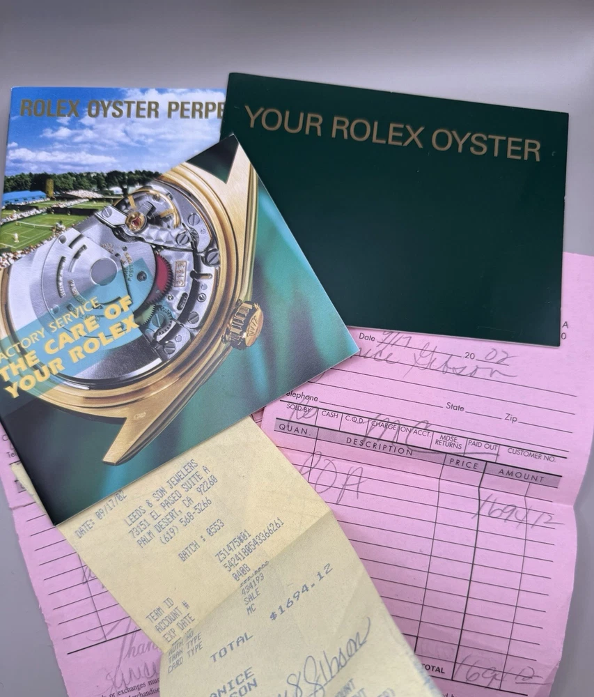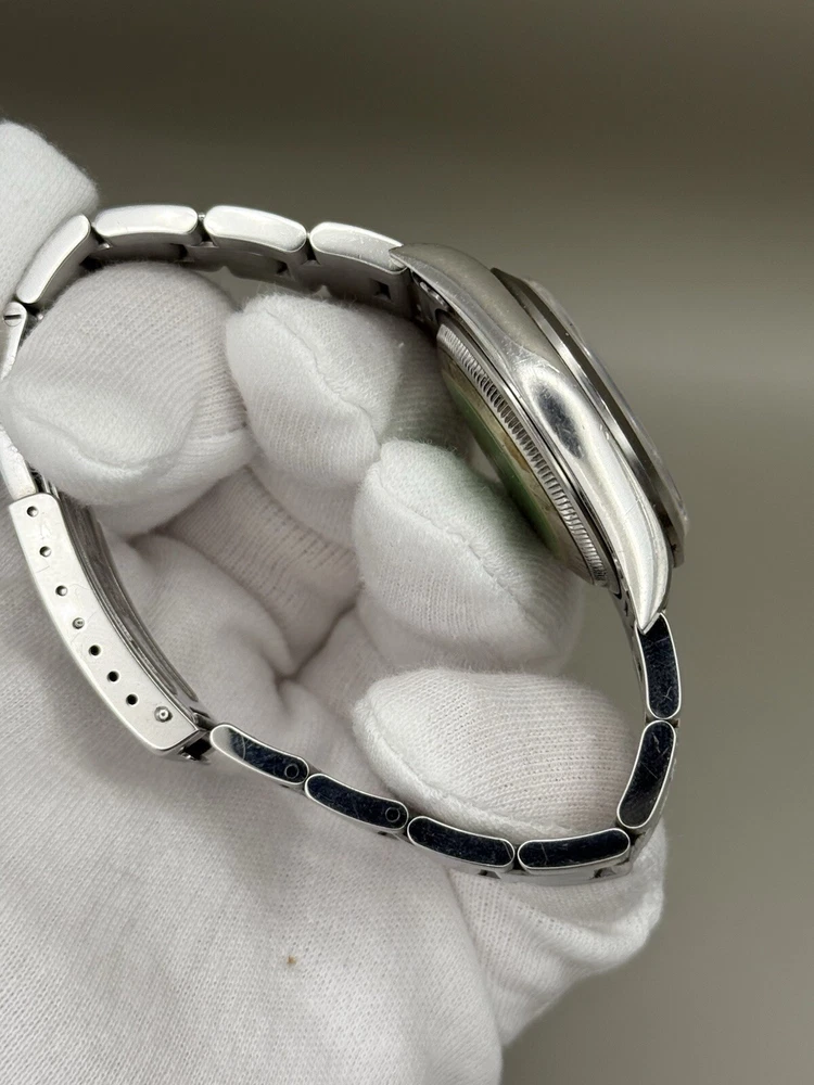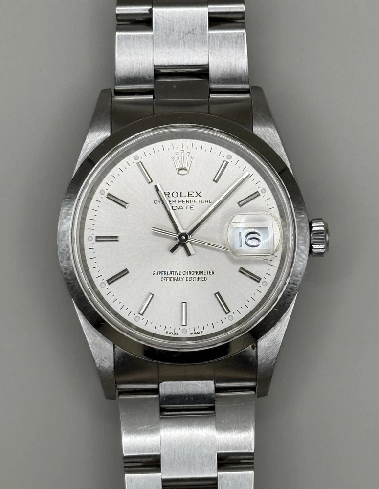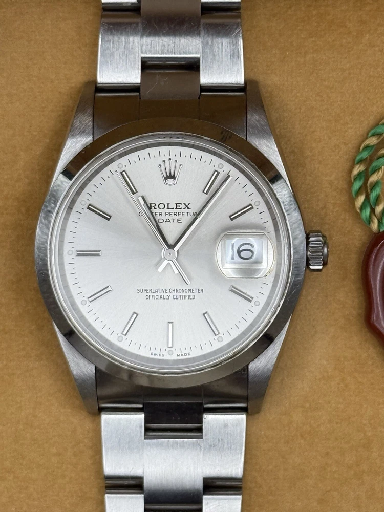 Great condition Rolex Oyster Perpetual Date. Watch comes with box and papers. Running great with sticker on case back. 12 links. Fits 6.5-7in wrist.