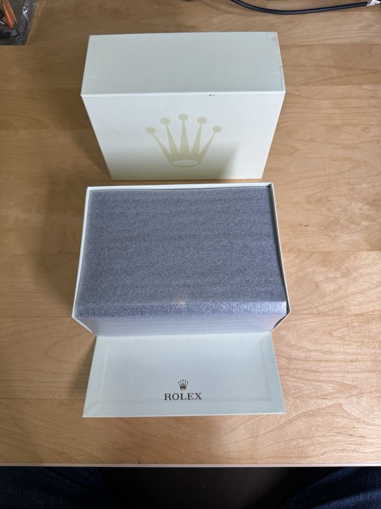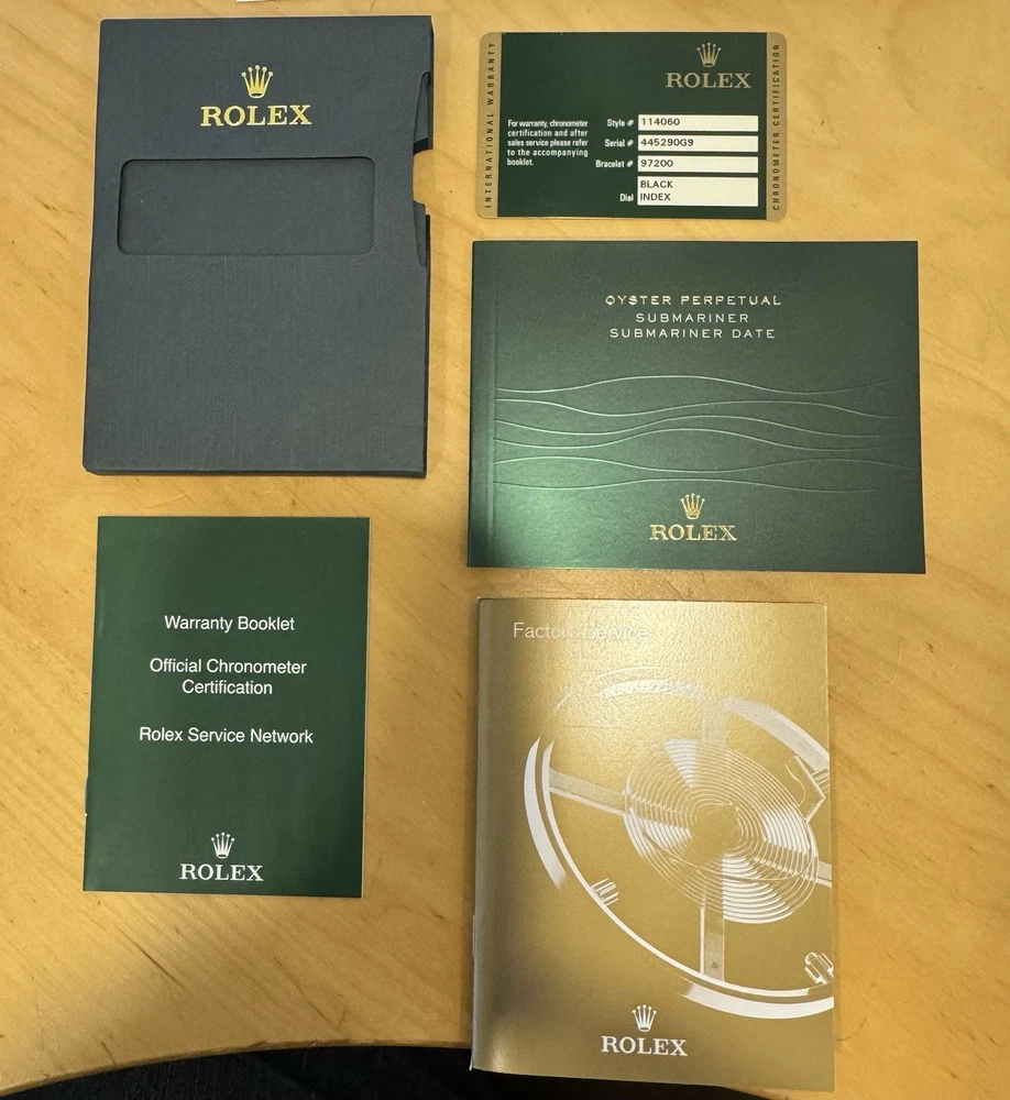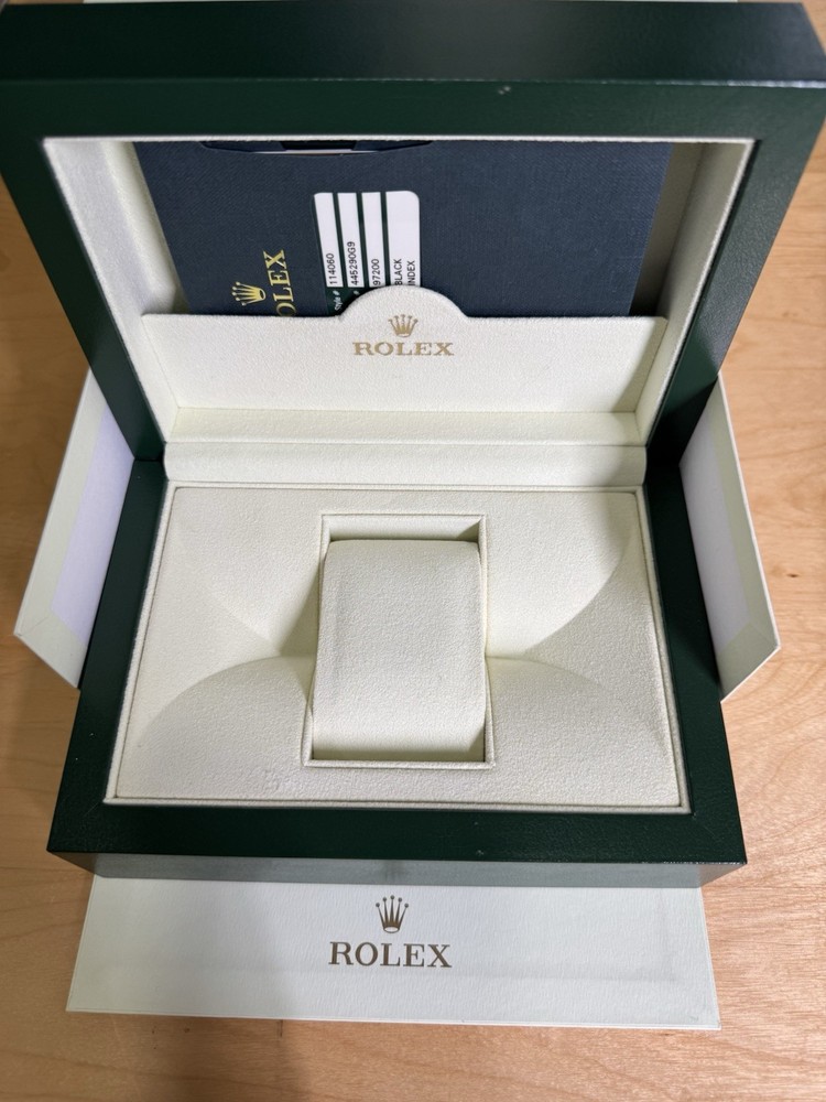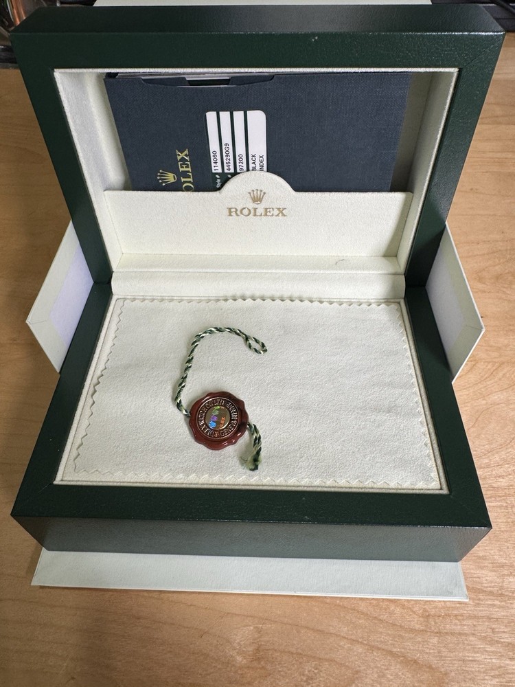 **** Please read the description carefully, examine the pics closely as they are part of the description, and ask any questions before buying! Original Rolex Box for Model 114060 Owned by a World Series of Poker player. Selling an original Rolex box for the Submariner 114060. The set includes: Genuine green Rolex presentation box Inner cushion User manual (Submariner) Card holder Tag **** Returns accepted only if I misrepresent the item, it gets damaged in shipping, or some other legitimate circumstance arises. Other frivolous returns will have the shipping both ways deducted from the return and may be subject to a 50% restocking fee. Not accepted: buyer's remorse, not reading the description, not looking at the pics, etc.