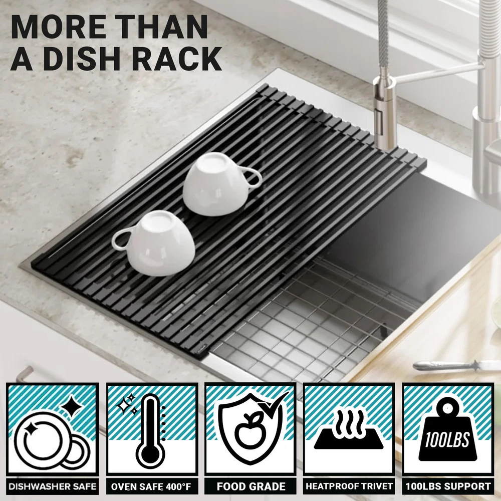 Universal and Purposeful: Traditional Dish Racks take up a lot of space. LeProMat – Over the sink roll up dish rack is designed to be a multipurpose sink accessory with minimal clutter. Our roll-up disk rack can double as a trivet or a sink cover. Made of premium stainless steel and coated entirely with food-silicone. Heat-resistant up to 400 degrees. Dimensions: 20.5 inches x 13 inches. All-in-Kitchen Accessory: Can be used as a roll-up dish rack, over the sink colander to wash fruits and veggies for meal prep. Used as a non-slip heat resistance Trivet for hot cookware to protect your counters. Replaces multiple sink accessories! Quality Materials and Craftsmanship: Made of high-quality stainless-steel rods wrapped entirely in Food-safe and Non-slip Silicone. The best stainless steel rolling rack for sink available for all users. Used on side of the sink to allow you to still have access to the sink for other uses! No Water on Your Counters: Our roll-up rack can be laid over the sink to allow water to drain directly into the sink and stay off of your counter. The perfect roll out drying rack for nearly all sink sizes. LeProMat – Roll up drying rack brings value and functionality to your kitchen. Replace clutter of the traditional sink drying rack and replace it with the LeProMat premium roll out drying rack & trivet.