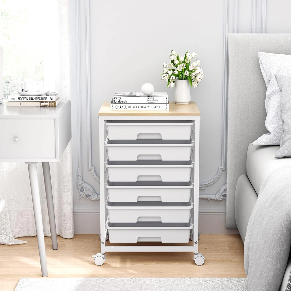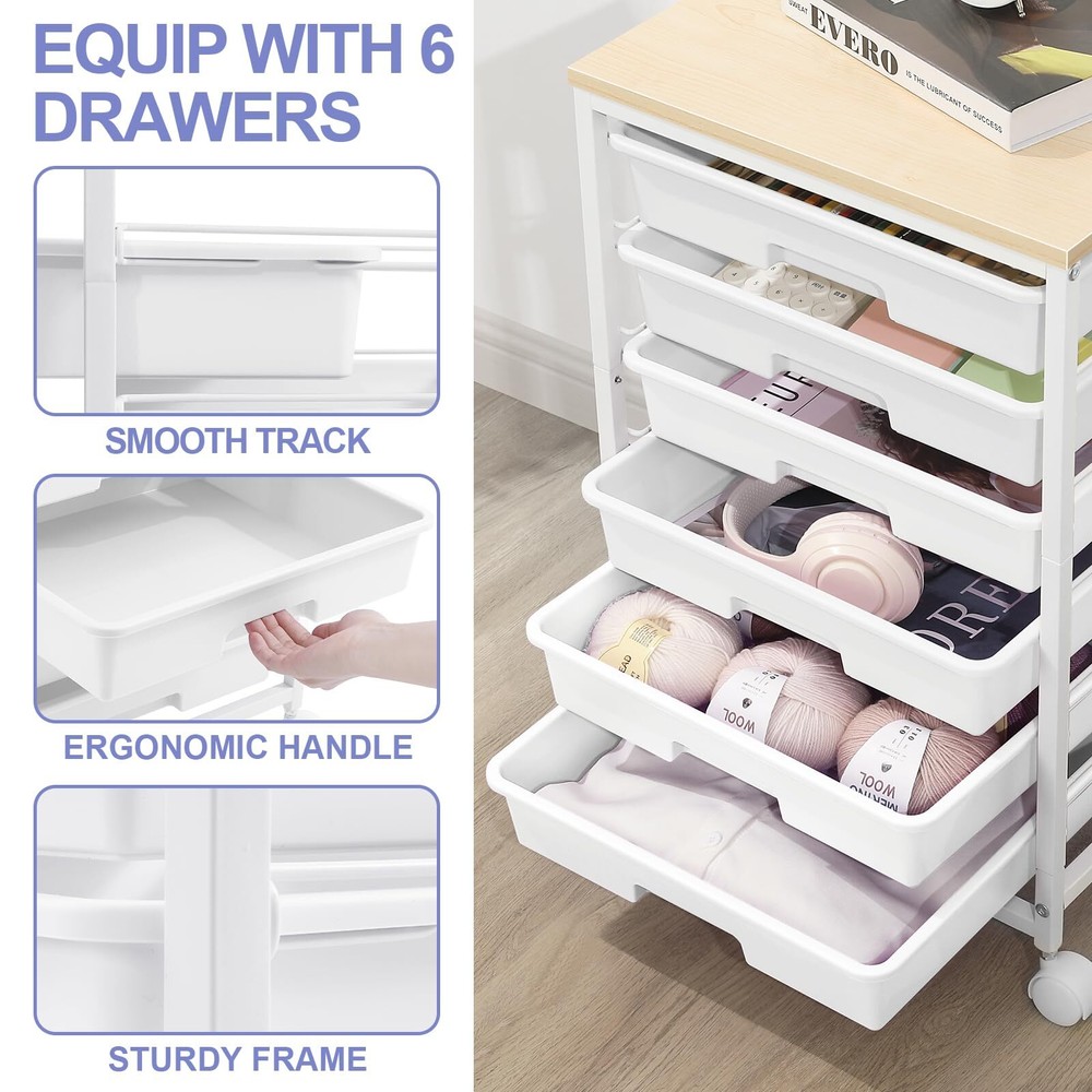 6 DRAWERS FOR LARGE STORAGE CAPACITY: Rolling cart with drawers includes 6 drawers which provide ample space for you to stuff by different categories. Moreover, you can organize these items by color, stereotype, and size to keep them tidy and clean. Slide-out drawer design, with smooth slide track and ergonomic handles, easy to open or close. WOODEN TABLETOP & THICK DRAWERS & METAL FRAME: The utility cart with drawers boasts a sturdy and durable -coated steel frame with water and rust resistance ensures a sturdy construction and built to last. Additionally, the slide-out drawers are made of durable PP material, which also boasts great durability. Holds 33 pounds on tits op plate and 11 pounds per drawer. This 6 drawers rolling storage cart will serve you for a long time. AMPLE SPACE FOR STORAGE & CLASSIFICATION: The overall size of this rolling storage cart with drawers is 15.55"D x 12.60"W x 24.49"H. Wooden tabletable top allows you to put plants, DIY cutting machine,printer and other decorations. By expanding the storage space vertically, smart solution of making full use of limited space. There are different color drawers for to and classifying your stuff. FLEXIBILITY MOBILITY & LOCKABLE WHEELS: Storage cart with drawers with four universal wheels can swivel 360 degree and help you move it easily. Locking wheels provide maneuverability and stability when needed. Smooth wheels, scratches and noise during movement can be effectively avoided. FIT YOUR DIFFERENT STORAGE NEEDS & EASILY ASSEMBLED: Whether you are a housewife,an office worker,a student or a craftsman,this practical versatile cart will be very helpful to you. Perfect for living room,bedroom, office,sewing room,craft room,classrooms,dorm,art studio or homework station. More drawers and colors great to storage tools,sewing supplies,embellishments,punches,stamps,paper,scrapbooking,school supplies,toys,stationery,office supplies,art and craft materials and beauty products.