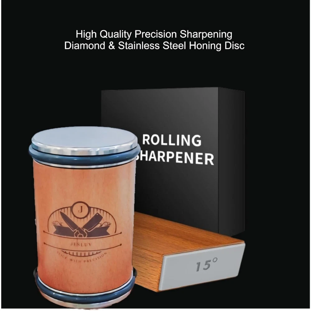 {Title} {Storehook1} Rolling Knife Sharpener Set Item Description The **Rolling Knife Sharpener Set by JESLUV** is an essential tool for keeping your knives in pristine condition. Designed for professionals and home chefs alike, this sharpening kit is equipped with a diamond-plated honing disc and a stainless-steel finishing disc that work together to deliver razor-sharp edges in minutes. The diamond-coated disc restores dull blades, while the stainless-steel disc polishes and perfects the edge for optimal sharpness. Whether you're sharpening a delicate fillet knife or a sturdy chef’s knife, this set ensures precision every time. This sharpener is not only effective but also easy to use. Simply position your knife blade against the angled magnetic holder—designed with a 15° side for specialty knives and a 20° side for general kitchen knives. Then, roll the diamond disc along the blade for about five minutes, followed by a few finishing strokes with the stainless-steel disc. In just a few minutes, you'll have knives that are as sharp as when they were new. Made from durable hardwood, the sharpener is both functional and stylish, complementing the aesthetics of any modern kitchen. The elegant wood patterns and sleek branding make this a standout piece on your countertop. Measuring 2.4"L x 2.4"W x 4.2"H, it's compact enough to store easily, but substantial enough to offer professional-grade performance. Plus, the super-fine grit ensures that your knives are sharpened without damaging the blade. This 2024 model by **Tranrich** comes packaged beautifully, making it a thoughtful gift for any cooking enthusiast. Whether for Christmas, a birthday, or a housewarming, the JESLUV Rolling Knife Sharpener Set is a practical yet stylish present that will be appreciated by any cook. Payment ALL METHODS ACCEPTED BY EBAY Shipping within 6 days of payment maximum usually we ship and deliver within 3 days. Return 30 day return policy Feedback Copyright , {storeHook1} | All rights reserved.