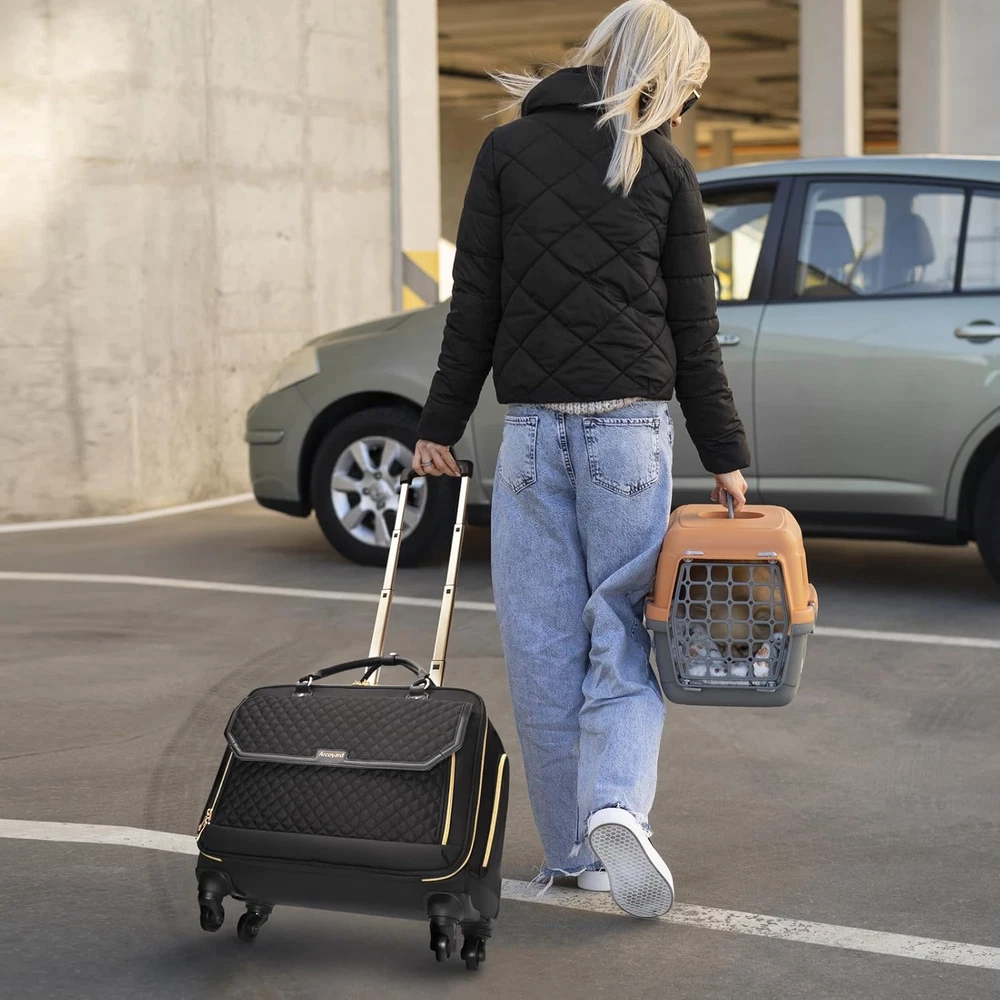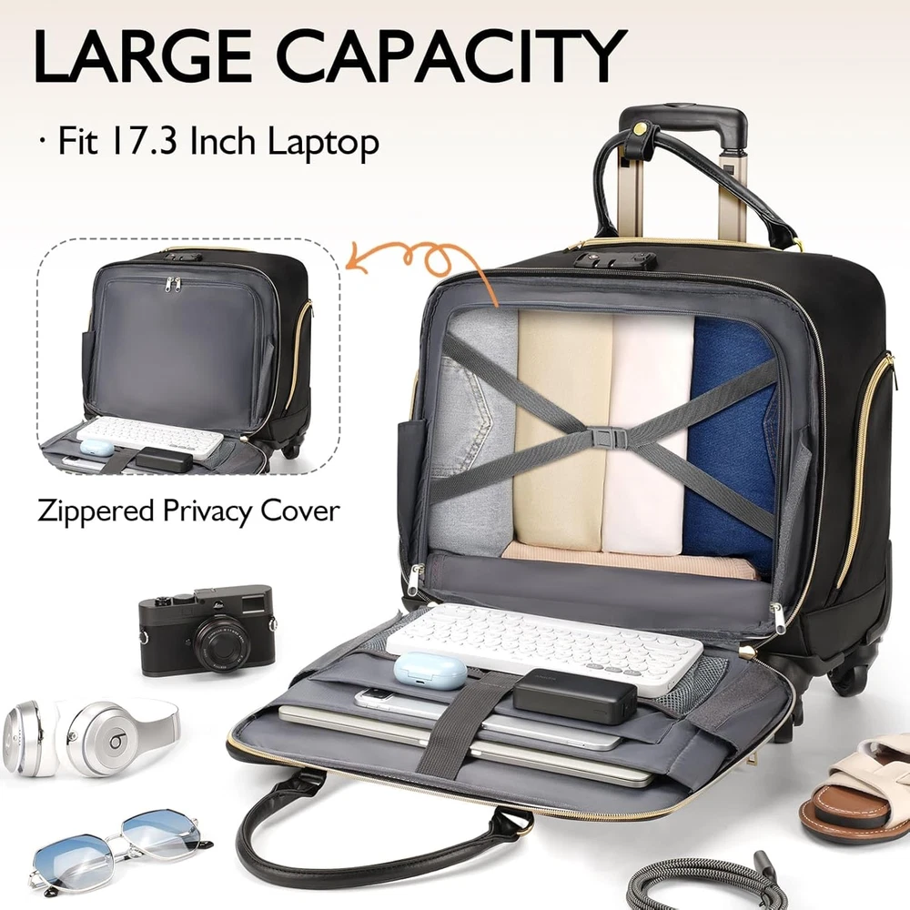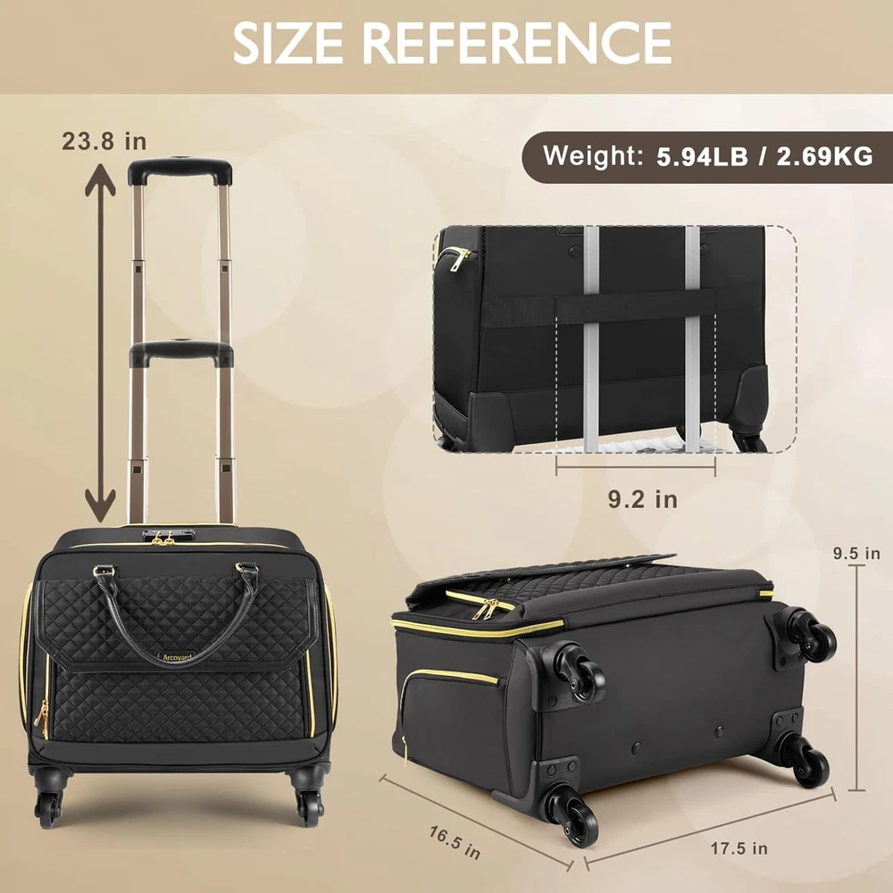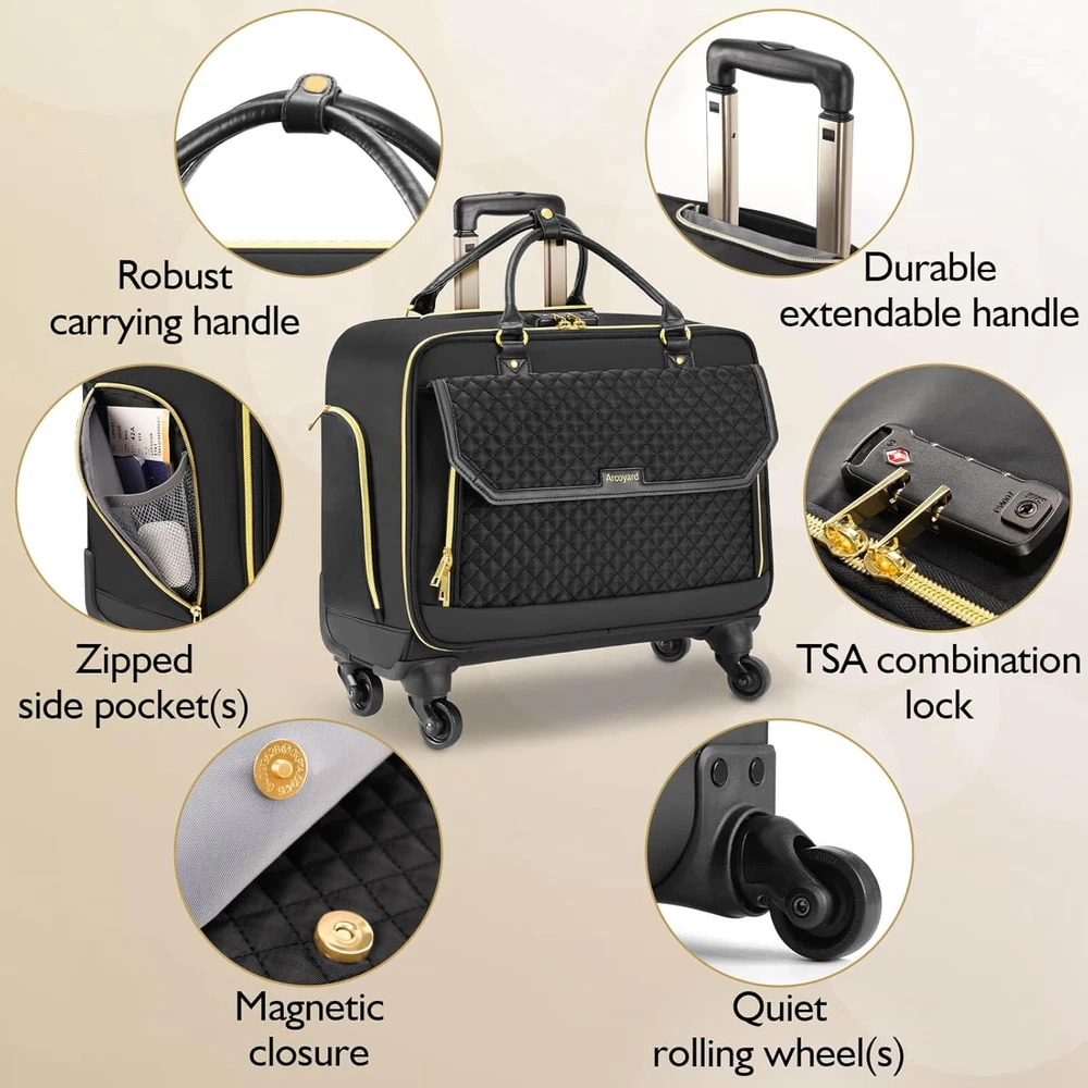 Rolling Laptop Bag, Briefcase for Women and Men with 4 Spinner Wheels and Handle, Roller Computer Bag for Work Travel Carry On, TSA Friendly Design, Black Description Design: The highlight of this briefcase with wheels lies in ensuring stability on the ground when fully loaded while also allowing for quick passage through airport security checks by being able to open 180 degrees. The bottom of our rolling laptop bag women features an integrated design, coupled with 4 swivel wheels, allowing you to maneuver your luggage from multiple angles, particularly suitable for narrow passages such as airplane aisles Reinforced Structure: Our rolling briefcase features wear-resistant and silent rubber wheels suitable for various terrains, reinforced with a steel axle and high-density engineering plastic. The bottom and sides are covered with waterproof-coated polyester to prevent damage from bumps and scratches. A sturdy, high-quality aluminum telescopic handle can reach up to 40.3 inches in height Spacious Compartments: The rolling laptop bag's main compartment features built-in elastic bands with buckles, which can accommodate clothing and personal belongings for a 2-4 day trip. The padded laptop compartment is suitable for an 18-inch laptop. There are individually designed storage spaces for pens, notebooks, tablets, Bluetooth headphones, power banks, and other items, making them easily accessible and saving you from having to search through your bag Detailed Features: The front compartment of the rolling computer bag features a magnetic snap closure design, with a hidden folder compartment inside, making it convenient to quickly access documents or other personal items. This laptop bag with wheels adopts TSA-friendly design, allowing it to open 180 degrees for quick passage through airport security checks. The rolling work bag is equipped with a TSA-approved combination lock Material: The rolling briefcase for women extensively utilizes high-density polyester fiber, which offers superior tear resistance and durability, while also being lightweight. The carry handle is made of PU material, enhancing the overall class of the briefcase; Suitable for travel and business trips Multi-Purpose: The Arcoyard rolling laptop bag is ideal for overnight stays, commuting, business trips, and spontaneous getaways. It makes a wonderful present for businessmen, family, and friends who are in need of a practical, high-quality, professional rolling work bag Product Description How to Set a Password The original number was 0-0-0. To set your personal combination, follow these steps: 1. Put the dials at its original number 0-0-0; 2. Press down the reset button (a) with a tool until you hear a "click" sound; 3. Set your combination by turning the dials (b), e.g. 8-8-8. 4. Push the button (c) towards to the direction of arrow and the reset button (a) when you hear "click" sound.