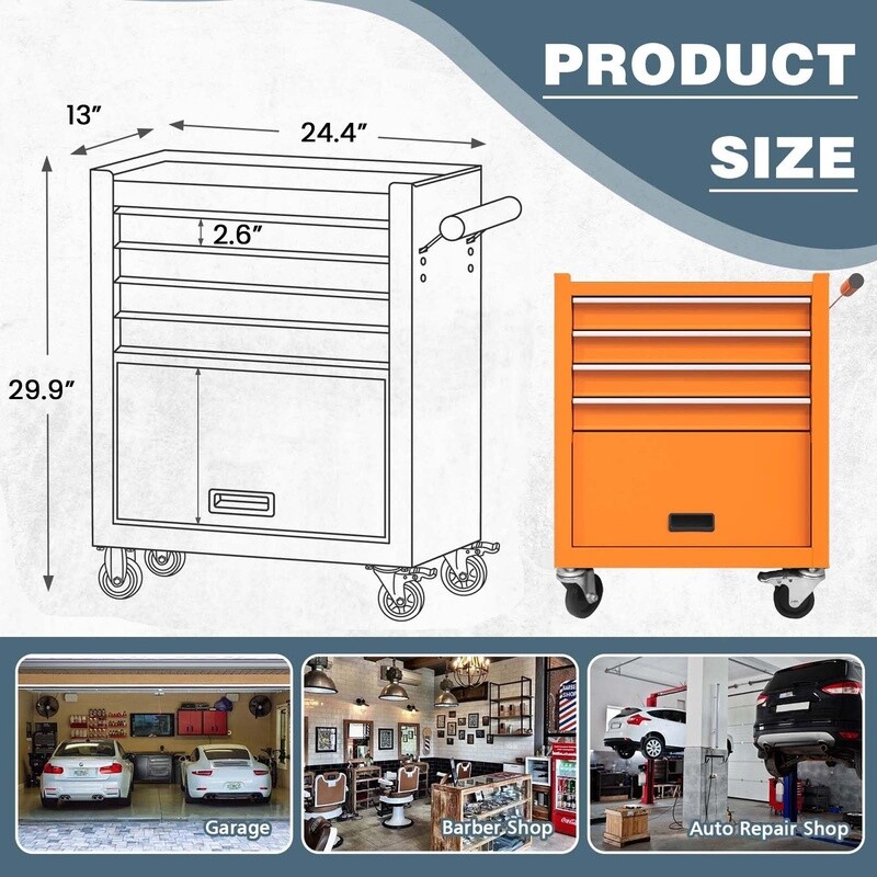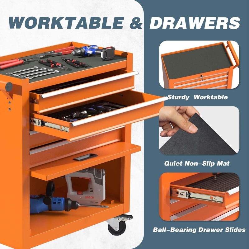 You may also like Mini Metal Tool Box with 2 Drawers and Top Storage Small Tool Chest W/PVC Liners 49.39 USD Free shipping 20-Inch 2-Drawer Tool Storage Box Tool Chest with Flip-Up Lid Garage Workshop 55.22 USD Free shipping The AK-HTS1-005 rolling tool chest is sturdy, and not easy to deform or bend. made of high-quality cold-rolled steel. And coated with an anti-corrosion paint surface which is waterproof and rustproof. Design to organize and store tools better! Perfect for any kind of project - DIY projects, home improvement, auto mechanics, and more. This tool chest has 4 drawers and 1 large bottom cabinet, which has various spaces to store various tools. Meanwhile, comfortable side handles make it easier to push or pull the tool chest, provide stability and support, and improve control and maneuverability. This rolling tool chest is great for home workshops and some professional environments and could be placed in the garage, workshop, warehouse, etc. CONVENIENT STORAGE SOLUTION - Our AK-HTS1-005 rolling tool chest offers ample space to organize and store your tools, ensuring easy access and efficient workflow in your garage or workshop. ANTI-RUST MATERIAL - This tool box is made of high quality metal steel material, has a stable construction, prevents scratching, denting, and chipping, more durable; adopts a powder coat, classic neutral color, beautiful and anti-rust. LARGE HIGH CAPACITY - The rolling toolbox has 4 sliding drawers and 1 bottom cabinet, to store different size tools and meet your needs. Each drawer is designed with a liner to prevent scratches. EASY MOVING & SECURE STORING - Our general tool cart can be easily moved and stored because there are 4 universal casters, 2 of which are braked. Also, the side with handles, helps you to move forward. MUTI-PURPOSE GIFT - It is a Christmas gift, and it is a holiday tool organizer for husbands and women. With classic color and unique appearance, lockable tool chests can be furniture for your home, garage, warehouse, shop, etc. PRODUCT INFORMATION Overall: 24. 2” L x 13” D x 29. 9” H Overall Product Weight: 41. 9 lb Box Size: 29” L x 26. 9” W x 15" H;52. 2 lb Features Product Type: Rolling Tool Box Primary Material: Steel Locking System: Yes Drawers Included: Yes Number of Drawers: 4 Ball-Bearing Drawer Glides: Yes Color: Orange Drawer Liner Included: Yes Soft Close or Self Close Drawer Glides: Yes Wheels Included: Yes Locking Casters/Wheels: Yes Cabinet: Yes Legs Included: No Side Push Handles: Yes Supplier Intended and Approved Use: Residential Use Weight Capacity: 300 lbs Powder Coated: Yes Drawer Slide: Soft Close; Ball Bearing Worktop Material: Steel Assembly Assembly Required: Yes Installation Location: Wheels;Side Push Handles You may also like 7-Qt. Slow Cooker 3 Heat Settings Removable Ceramic Pot Led Power Indicator Blue 59.79 USD Free shipping Indoor & Outdoor Wood Flooring 12" x 12" Tiles for Patio Garden 27 Pieces Black 96.59 USD Free shipping 8-Pack Wall-Mount Storage Hooks Heavy-duty Steel Vinyl Coating Garage Organizer 29.42 USD Free shipping 12.5-Amp Variable-Temperature compact Heat Gun w/ Adjustable Air Flow 2 speeds 35.0 USD Free shipping 100W CD Stereo W/USB & BT Connectivity Bluetooth Wireless Tray-loading CD Player 97.75 USD Free shipping Full Size Garment Steamer with Telescopic Pole Foldable Hanger 70 Oz. Water Tank 83.99 USD Free shipping 12 Can Capacity Welded Cooler Heavy Duty Waterproof Adjustable Shoulder Strap 55.96 USD Free shipping 8-Person Family Camping Instant Cabin Tent with LED Lights Bluetooth Speaker 202.92 USD Free shipping Set of 4 Glass Food Storage Containers Leak-proof Seal Airtight W/ Latching Lids 55.99 USD Free shipping 37" Small Animal Cage for Ferret Large Rat Guinea Pig and Mouse W/ Pull Out Tray 96.02 USD Free shipping 74" H 5 Shelf Plastic Garage Shelves Rack Pack of 2 Storage Shelving Unit Black 109.14 USD Free shipping Portable Charcoal Grill Heavy-gauge Steel Removable Dual Adjustable Air Dampers 111.55 USD Free shipping