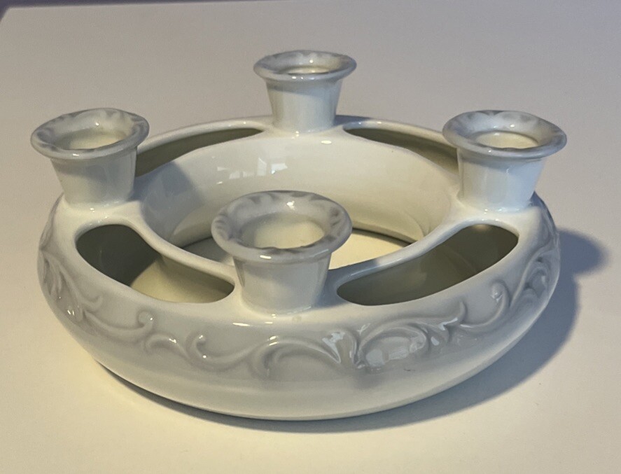 R.R. Roman Blue & White Porcelain Candle Holder Ring 4 Tapers w/Flower Trough - 6" Diameter Please review all pictures carefully as they are part of the description. Questions are welcome.