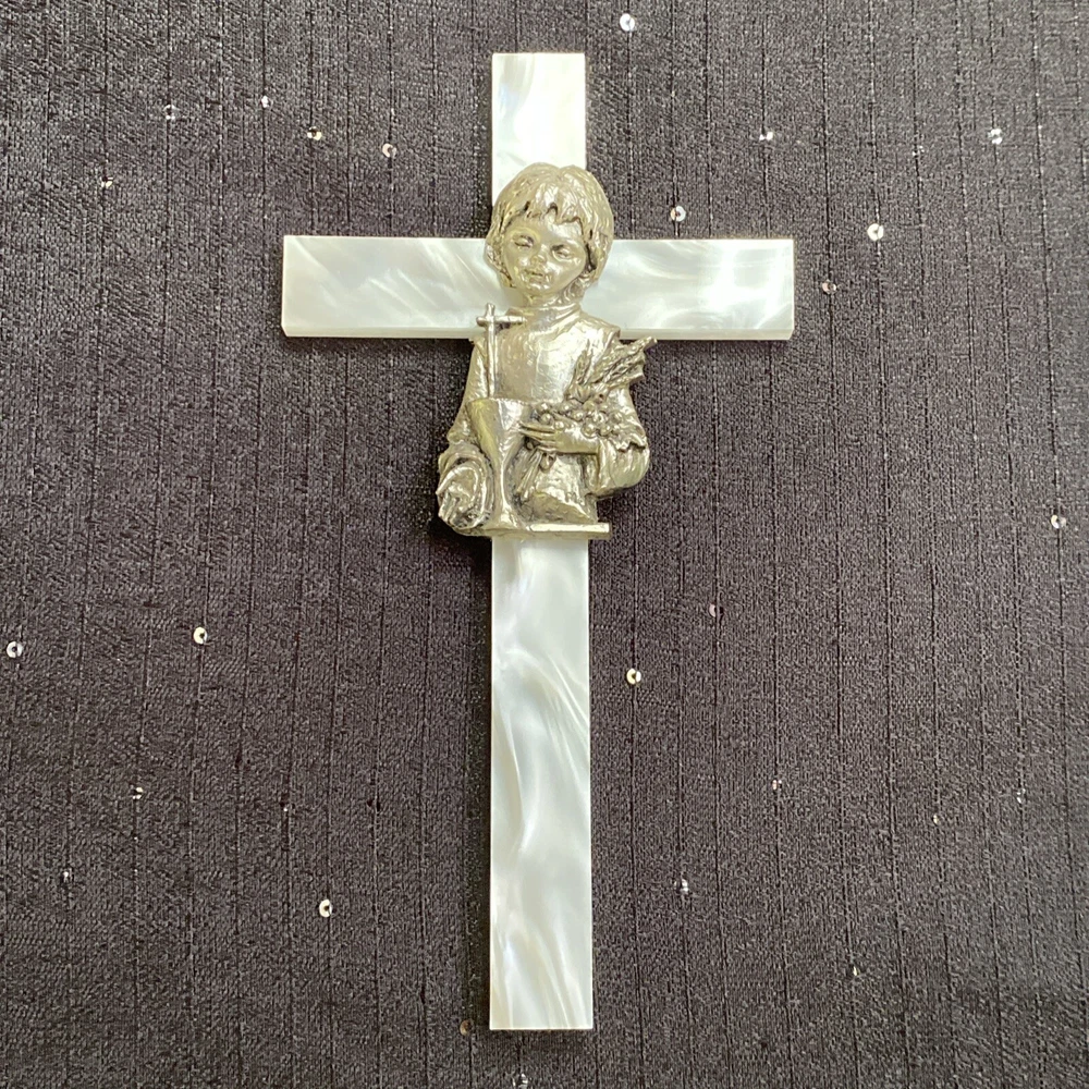 This is a beautiful piece! The cross appears to be made of wood with a mother of pearl finish, and the ornament appears to be silver. Made in Italy. This item is secondhand and sold as is. It is in wonderful condition. No blemishes or scratches. Feel free to make offer! xm-051