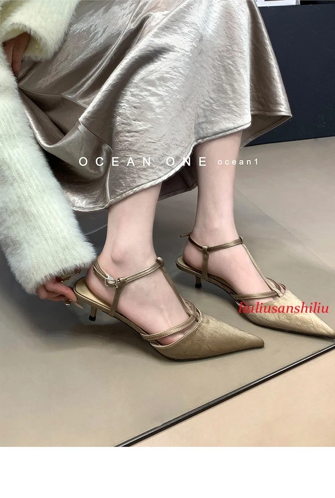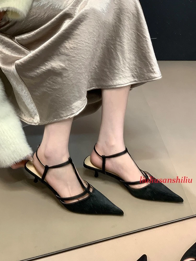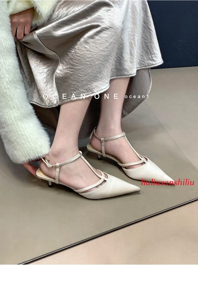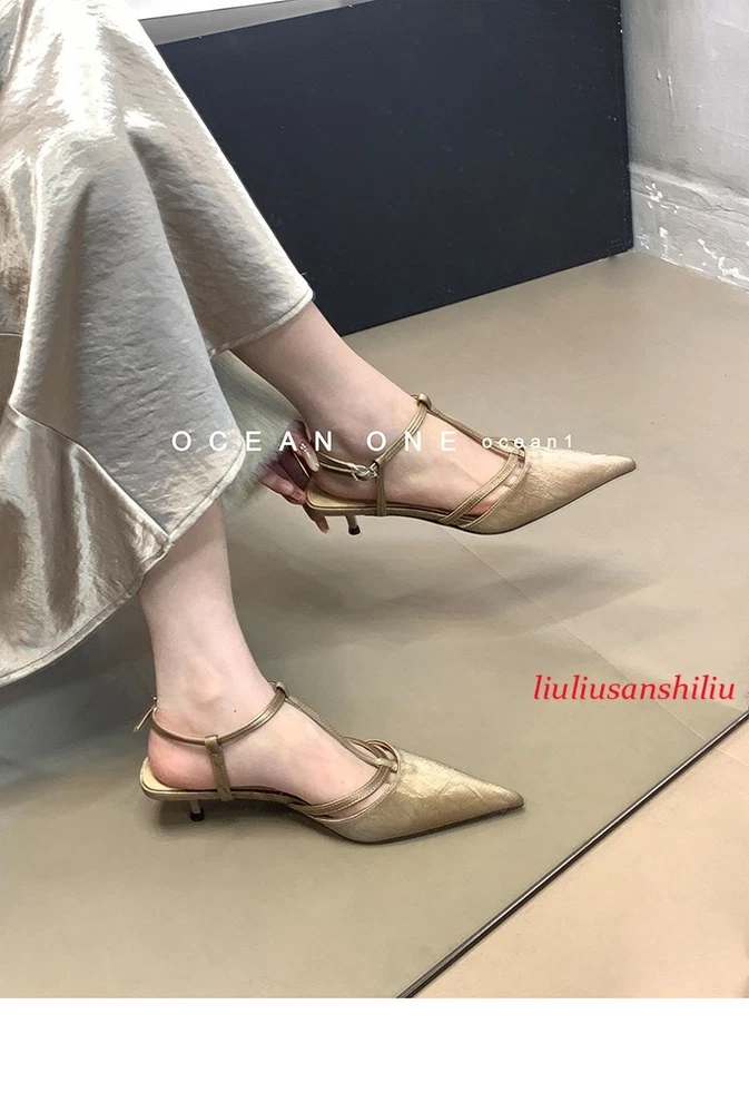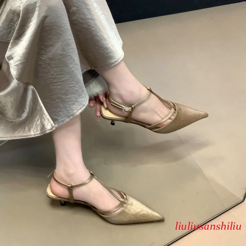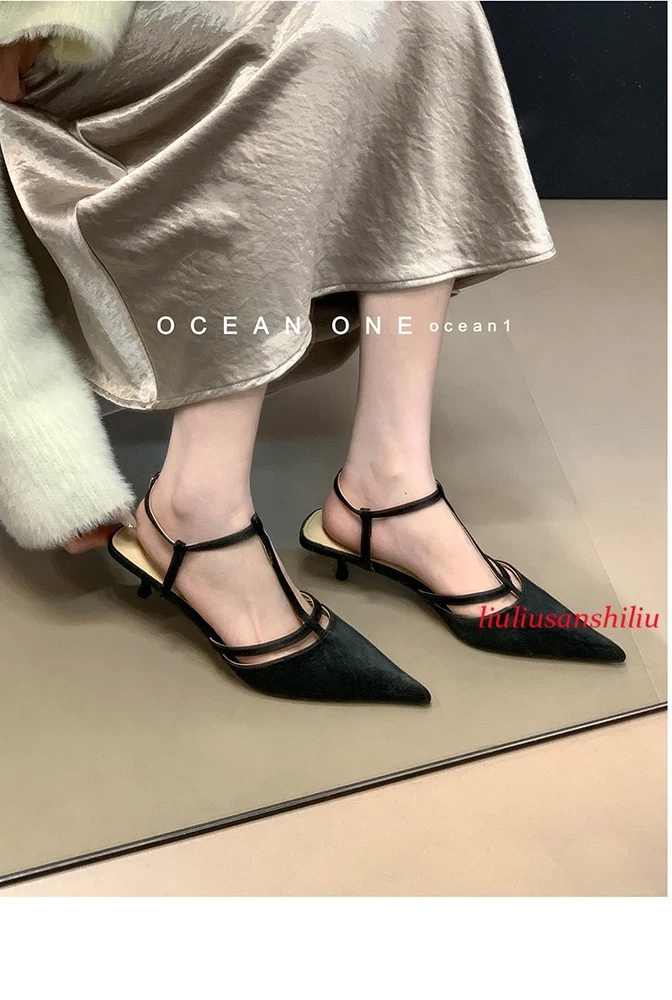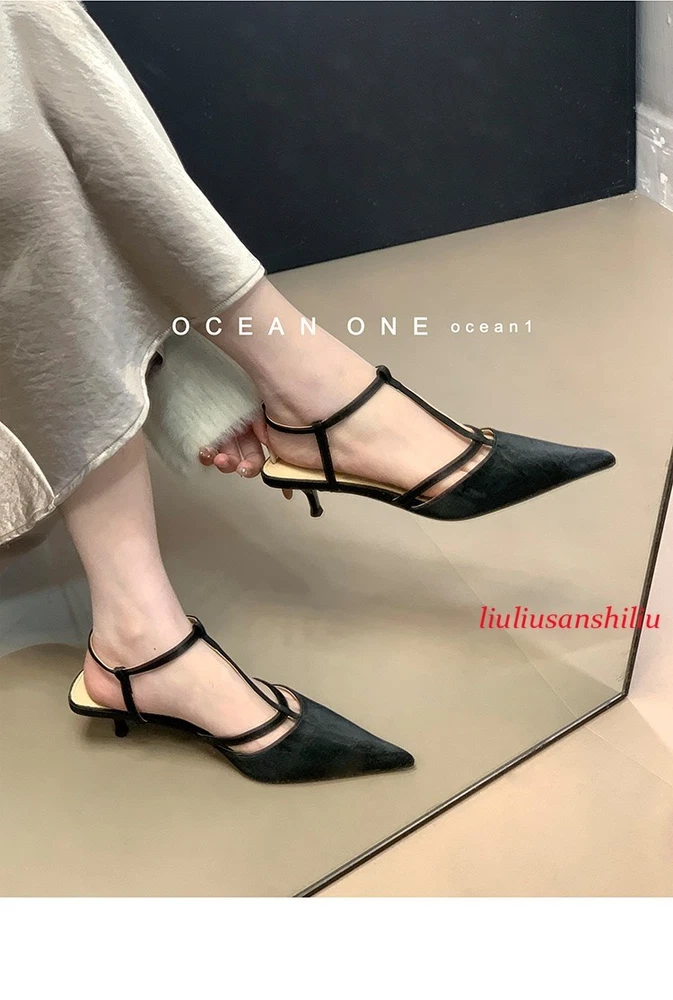 Roman Womens Kitten Heel Sandals Summer Pointed Toe T Buckle Pumps Dress Shoes