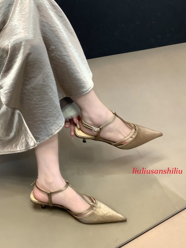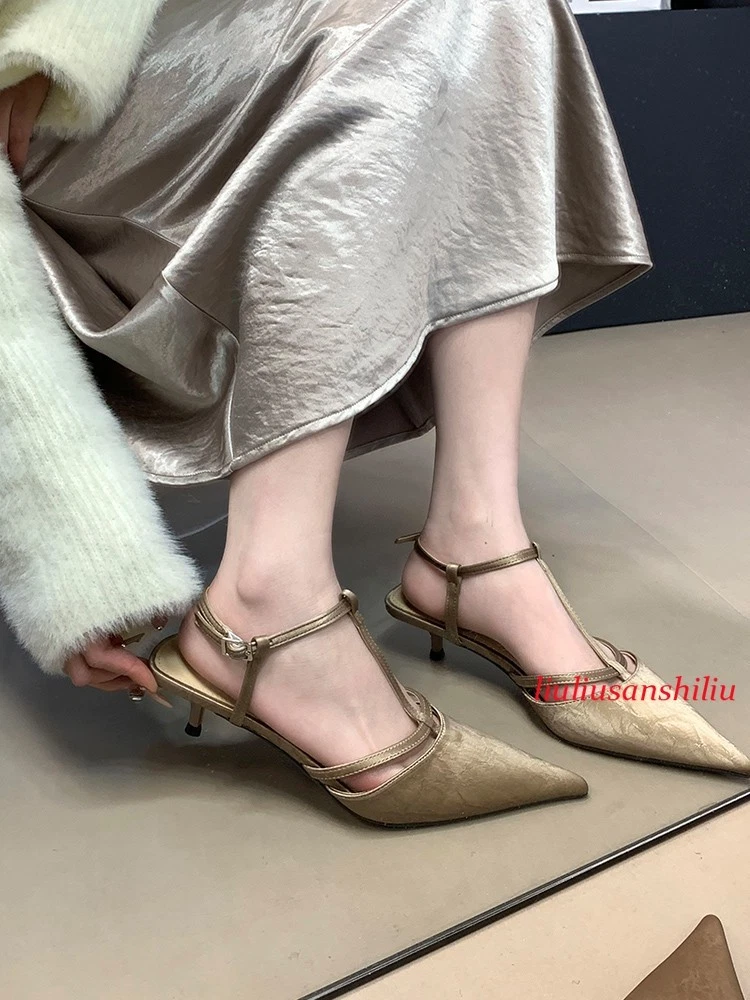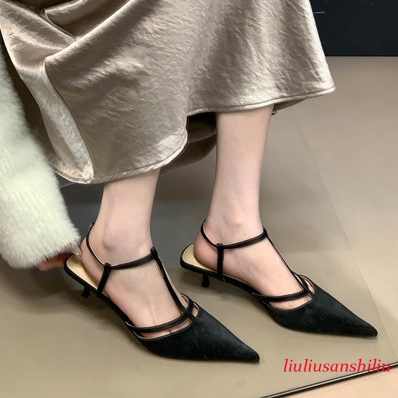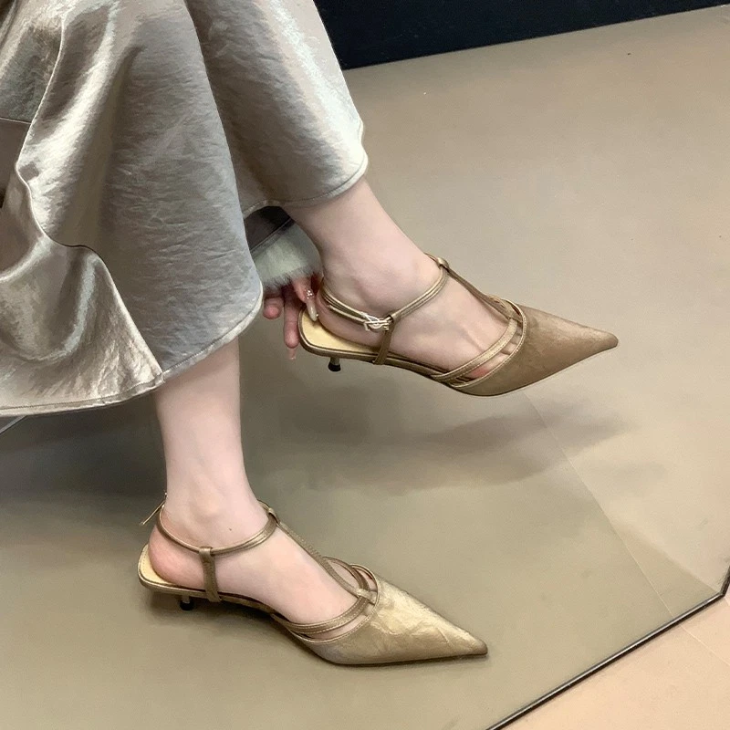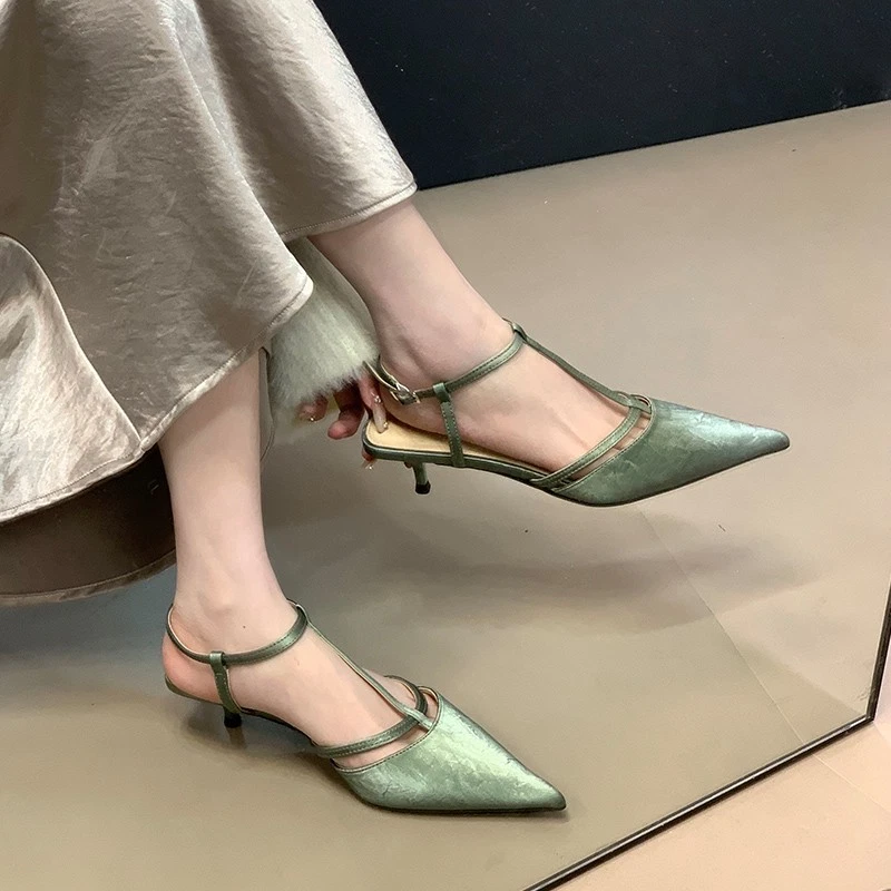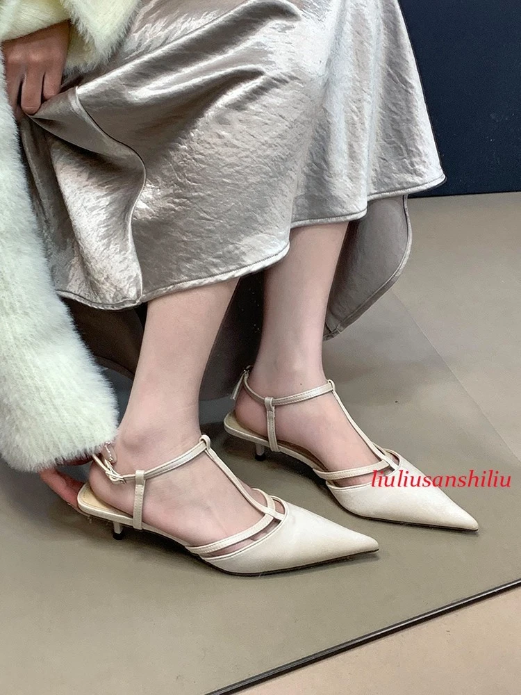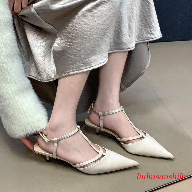 Roman Womens Kitten Heel Sandals Summer Pointed Toe T Buckle Pumps Dress Shoes