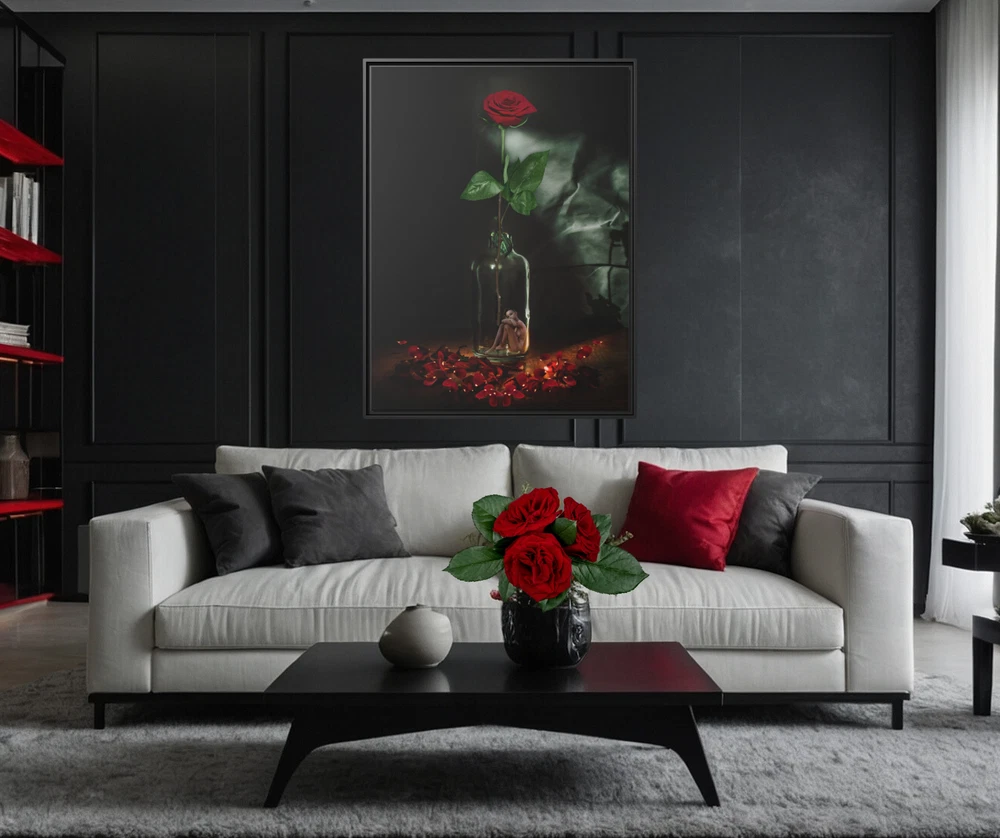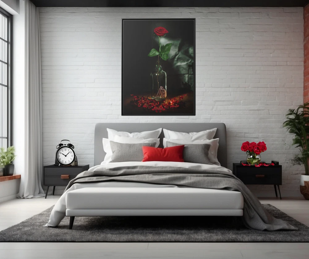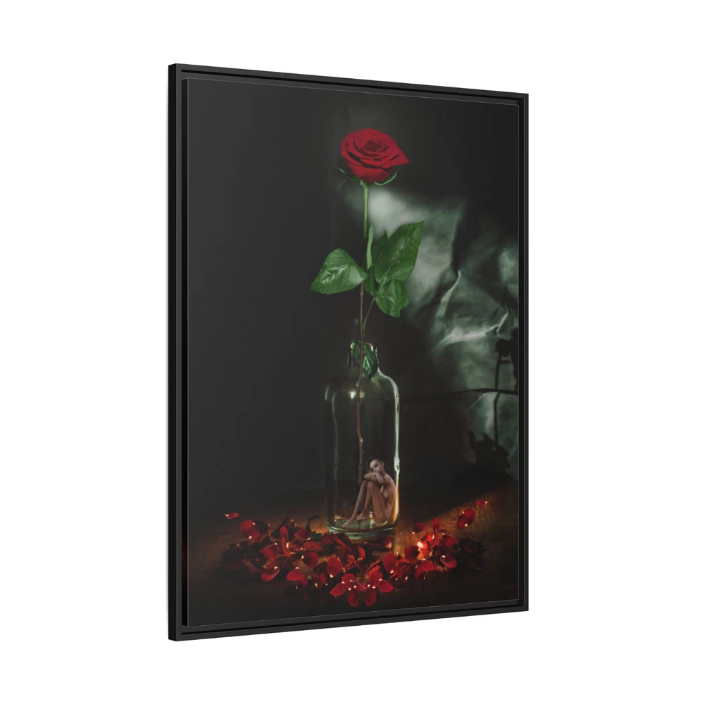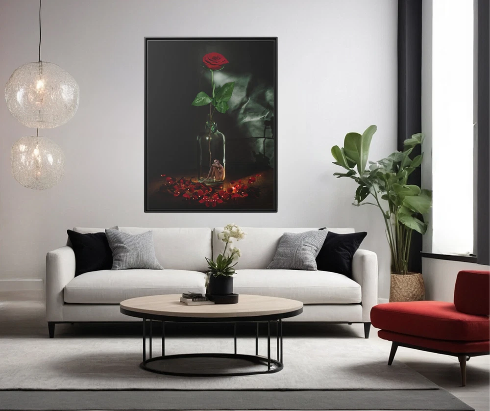 "Girl in a Vase" Abstract Illustrative Art | Framed Gallery Wrapped Canvas Transform your space with the enchanting and thought-provoking " Girl in a Vase " abstract illustrative art piece. This captivating artwork portrays a nude girl elegantly seated inside a delicate rose vase, surrounded by a tall, single-stemmed rose and scattered rose petals. The fusion of human form and floral elements evokes a sense of beauty, vulnerability, and artistic curiosity. Expertly printed on high-resolution, museum-quality canvas, this artwork showcases vibrant colors, intricate details, and a stunning interplay of light and shadow. The black-framed gallery-wrapped canvas adds depth and a modern aesthetic, making it a perfect centerpiece for any room. Key Features: Design: Abstract illustrative depiction of a girl and rose vase, blending elegance with surrealism. Material: High-resolution printing on heavy-duty gallery-quality canvas for exceptional clarity and color fidelity. Framing: Sleek black frame enhances the artwork's sophisticated look while providing a ready-to-hang solution. Durability: Fade-resistant inks and sturdy construction ensure long-lasting beauty. Versatile Size Options: Available in various sizes to suit your decor needs. Ideal for living rooms, bedrooms, or creative spaces, " Girl in a Vase " is more than just wall art—it’s a conversation starter and a piece of art that invites interpretation. Perfect for art lovers seeking a bold yet graceful addition to their collection. Product Description: Crafted with state-of-the-art technology, this gallery-wrapped canvas print elevates traditional art, embodying exceptional quality and craftsmanship. Each reproduction is elegantly framed in sleek black pinewood, designed to effortlessly enhance any interior decor. Printed on premium cotton-polyester canvas with a specialized coating, these prints maintain their vibrant colors for decades. Utilizing UL-certified Greengard Gold inks, they ensure superior image fidelity while adhering to sustainable practices certified by the Forest Stewardship Council. Available exclusively in three sizes—18x24, 24x32, and 30x40—each print includes sawtooth hanging hardware and wall bumpers. Stretched on a custom radial pine profile crafted from FSC-certified renewable forests, these prints ensure both environmental responsibility and lasting quality. Offered only here, these art prints provide a perfect blend of tradition and modern craftsmanship. Prices include production costs, shipping and handling, and artist license fees.