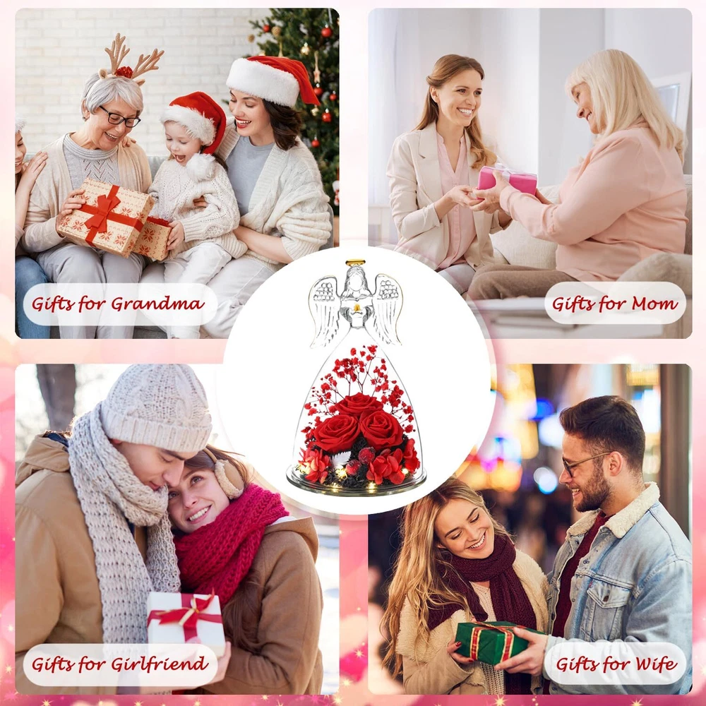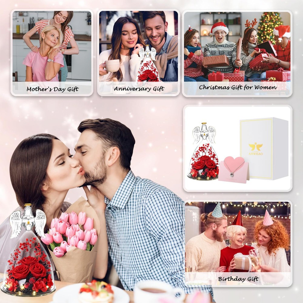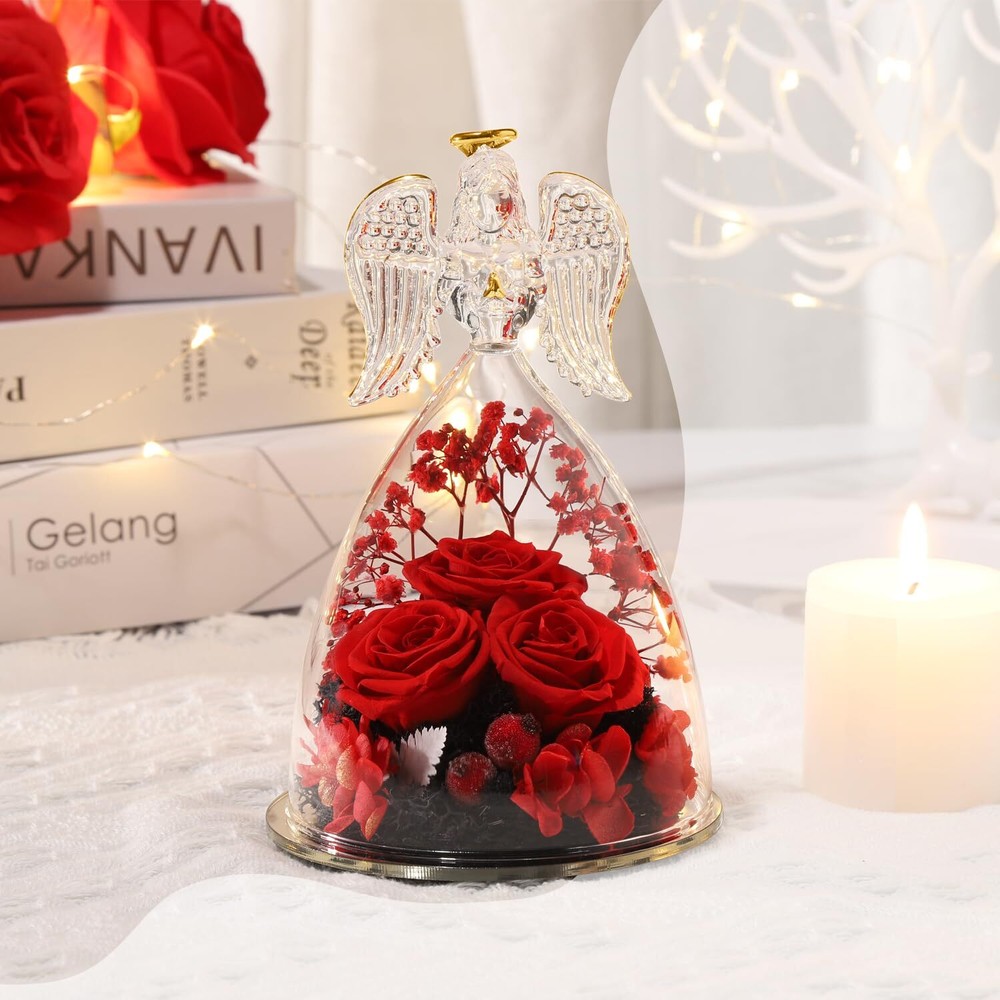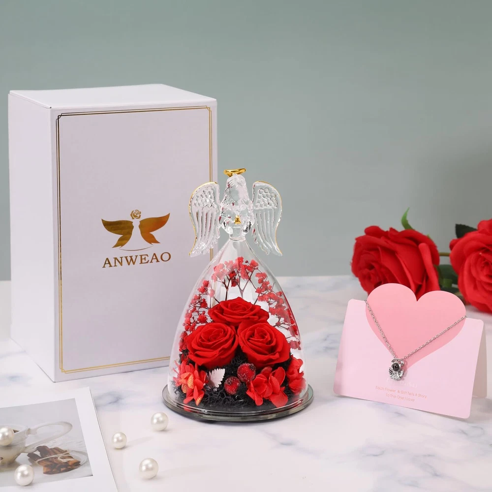 Valentines Day Flowers Glass Angels Figurines with Preserved Rose - Angel statue made of clear glass with golden outline drawing wings, halo and folded palms. Preserved Rose flower is made of natural rose with unique preservation process, most keep the same color, shape and feeling of fresh cut flower, which can last 3-5 year. Angel Gifts for Women, Unique Preserved Rose Flower Valentines Day Gifts For Mom, - The upgraded angel rose has an LED light embedded in the center of the rose, full of a romantic atmosphere. Our angel figure preserved flowers are handmade, with a variety of flowers, combined with the unique appearance of angels, delicate and surprise.It is the perfect decoration for candlelight dinners, weddings, parties, living rooms, bedrooms, offices, coffee shops. Gifts for women,mom,wife,her or friends. Making the person feel special and meaningful at birthday Christmas Thanksgiving Valentines day Mother’s day or any other important days. Valentines Day Gifts Ideas for Women, Large Angel Figurines,Exquisite packaging - The diameter of the angel is 4.10 inches and the height is 6.40 inches. The packaging contained a glass angel figurine, a angel i Love You Necklace, a beautiful gift box, and a great greeting card.guardian angel figurines with three Preserved roses come with everything needed to present it as a gift, you don't have to buy wrapping paper or a card.Preserved Real Rose great fit inside the glass angel, a beautiful way to make a person feel special and meaningful. Perfect Christmas Gifts for Women/Mom/Wife/Her/Best Friend. Valentines Day Gifts for Her - I Love You Angel Pendant Necklace - The projection necklace uses the latest nano-projection technology to express "I love you" in 100 different languages, illuminating the angel pendant with light, mapping out 100 languages of I love you.This Angel necklace is exquisite and elegant, fit for any occasions, and will make you more eye-catching and charming in the crowd. Absolutely a great gift to express your love for your mother, girlfriend, fiancee, wife, valentine, family or friends, etc. Great gifts on Mother 's Day, Wedding, Anniversary, Valentine’s Day, Christmas,birthday. Flowers Fresh Bouquet Angels Gifts For Women,Lasting Keepsake And Memory: Romantic Roses flower for Her,gifts for Mom,Grandma, Wife,Girlfriend,Christmas gift for moms from daughter son.Angel birthday gift for Mom gifts.The preserved flower rose angel is about 6.4 H x 4 W Inch,a wonderful and touching mom gifts, sympathy gift.Unique glass rose flower Angel gifts for her valentine's day, birthday gifts for women, wife, girl, girlfriend,mother, grandma,father, daughter, family, teacher, colleague, etc.Adding to memorable memories collection! Unique Birthday Gift Ideas for Women,Birthday Gifts for mom - Beautifully Packaged. Arrives completely assembled in a high quality, reusable gift box, with a Delicate heart greeting card. You do not have to worry about a thing! We make gift giving fun and easy! Elegantly designed and filled with thoughtful gifts! Make Her Feel Pampered on Mothers day, her birthday, or anniversary with this three roses guardian angel figurines luxury gift box for women! Angel Gifts for Women,Mom birthday Gifts,Birthday Gifts for her,Angel figurines for Women, birthday Gifts for Mom, gifts for grandma,gifts for her,gifts for wife,gifts for girlfriend