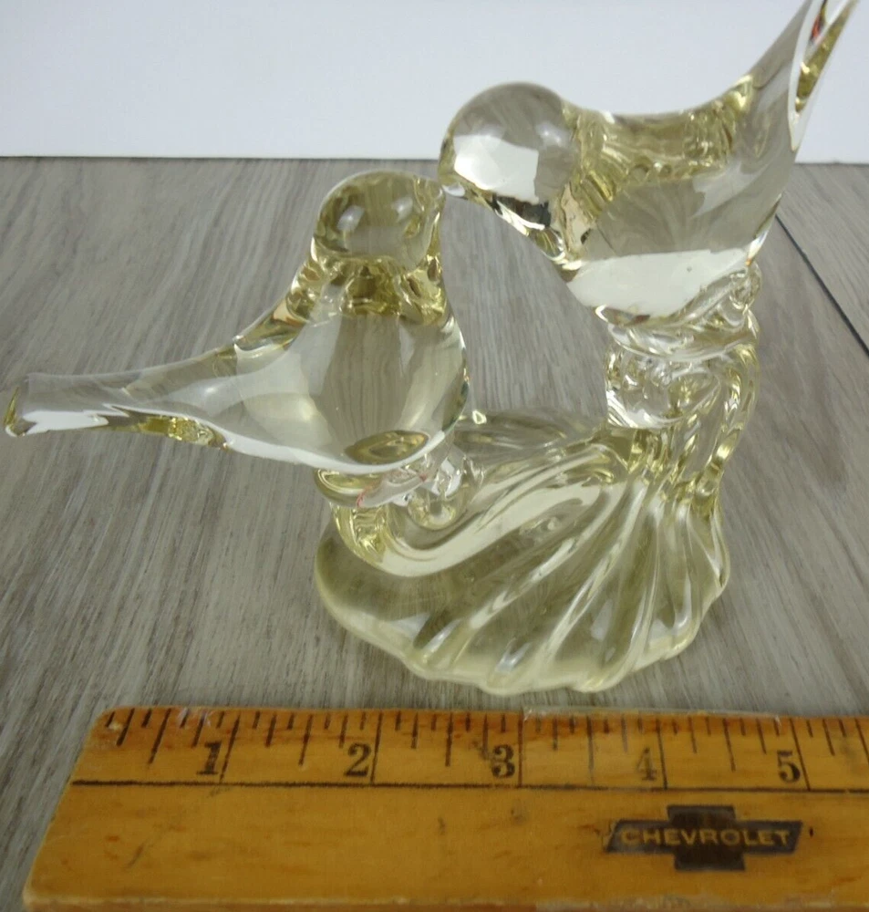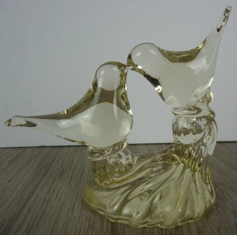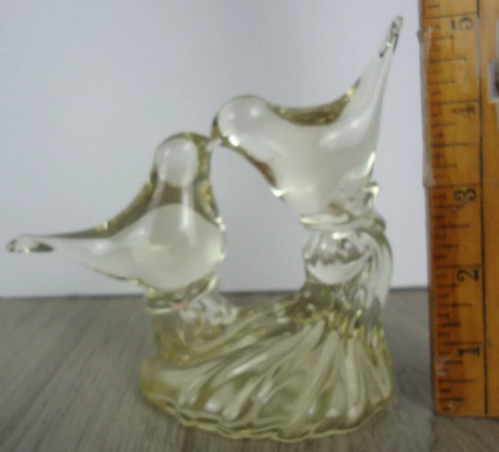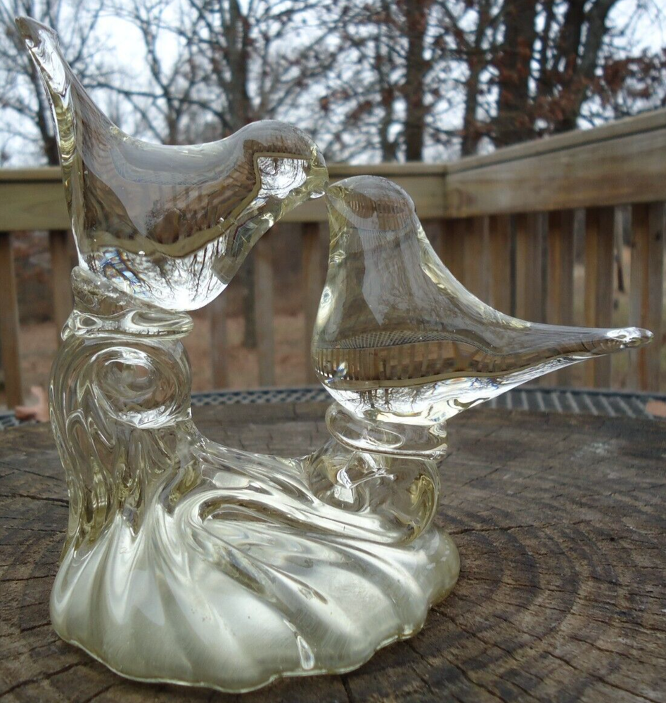 Kissing Love Birds Art Glass Sculpture Happiness Pair Signed Taug '85. Great City Traders San Francisco Made in Taiwan. Preowned excellent condition. There are some imperfections in the base but no chips or cracks. This is a slightly yellow tinted clear glass so I have shown it in multiple lighting situations. Please see all pictures for measurements. D3