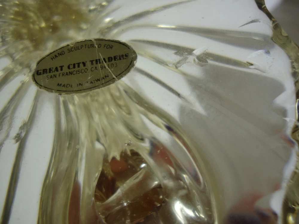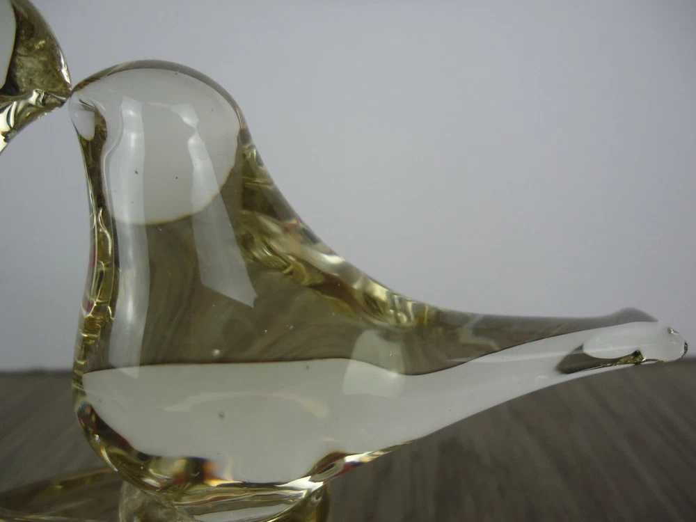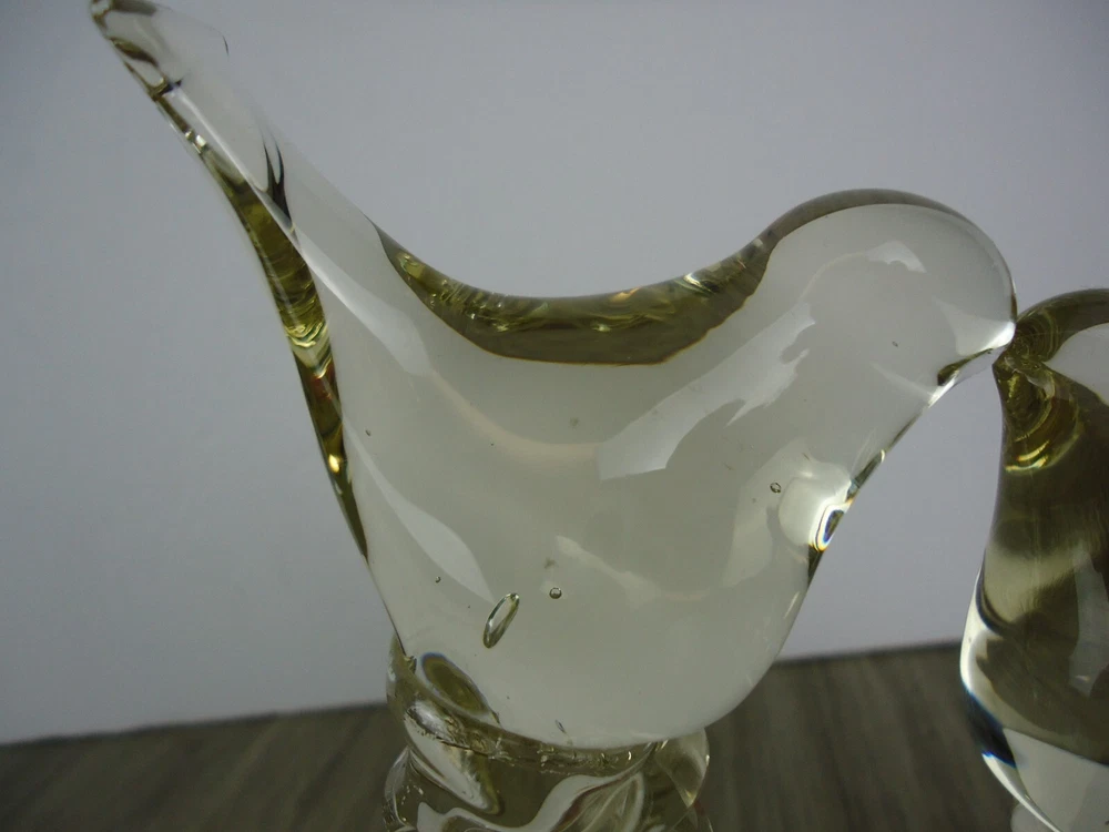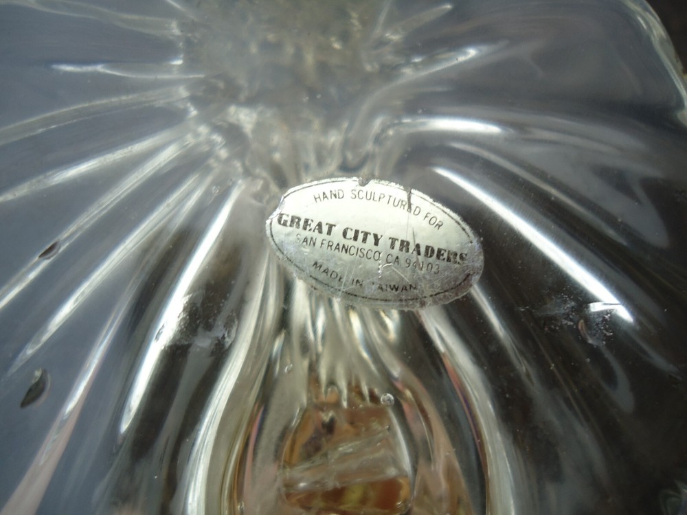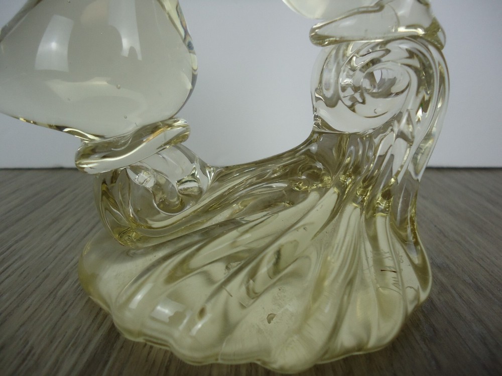Kissing Love Birds Art Glass Sculpture Happiness Pair Signed Taug '85. Great City Traders San Francisco Made in Taiwan. Preowned excellent condition. There are some imperfections in the base but no chips or cracks. This is a slightly yellow tinted clear glass so I have shown it in multiple lighting situations. Please see all pictures for measurements. D3
