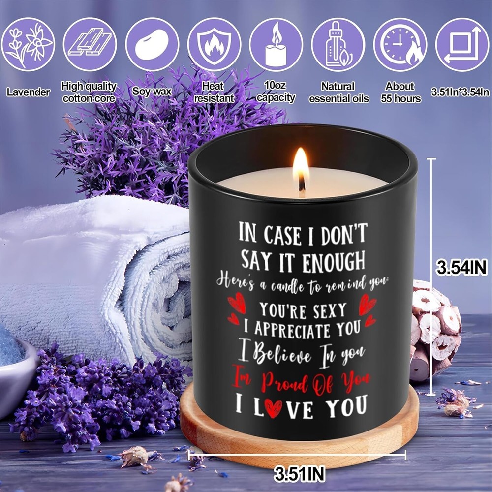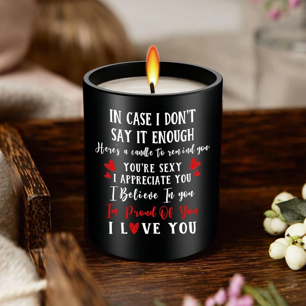 Valentines Day Gift Candles, Wife Romantic Valentine Present For Her I Love You Product Details: ROMANTIC COUPLES GIFTS Liven up your relationship with your loved ones with our stunning couple candle gifts. It will be a surprise to give this romantic birthday gift and show your love for your loved ones! Moreover, these are also Christmas, Valentine, Mother, Anniversary, birthday gifts for couples to symbolize their love. WIFE, GIRLFRIEND, HUSBAND, BOYFRIEND BIRTHDAY GIFTS OR ON ANY OCCASION: The special one in your life will undoubtedly be filled with joy and happiness. A bright, heartwarming smile will illuminate their face as they open it, their eyes sparkling with anticipation and excitement. Used for wife husband birthday gift, birthday gifts for girlfriend boyfriend, birthday gifts for him her, ... UNIQUE ANNIVERSARY GIFTS Look no further than our vanilla candle, whether you are looking for anniversary, valentines day gifts for husband and wife or an couple gift with a sentimental message. Ideal gift for boyfriend, husband, romantic I love you gifts for her, or even a date night gift for couples. BIRTHDAY GIFT IDEAS These stunning candles make ideal gifts for couples, men, women, suitable for any occasion you want to spread your love. A simple warm and heartfelt candle girlfriend ideas gifts suitable for anniversary, birthday, valentine's day, Mother's Day, thanksgiving, Christmas, wedding, thank you gifts, holiday. ECO-FRIENDLY And REUSABLE The candle is handmade with high quality natural soy wax and Lemongrass fragrance oils. Our soy wax burns nice and clean and Eco-friendly that perfect for aromatherapy, meditation, yoga, etc. Wax can easily be cleaned out of the jar with hot soapy water and the jar can be reused or recycled.. 55 HOURS BURNING TIME Crafted with soy wax, this Candle for Him Her allows a clean, even burn for approximately. 55 hours. The lead-free wick, which has been specifically designed to ensure a continuous and steady burn, makes the wax melt evenly and consistently. After full use, this glass jar can be used for home decor and is also suitable for placing your small objects..