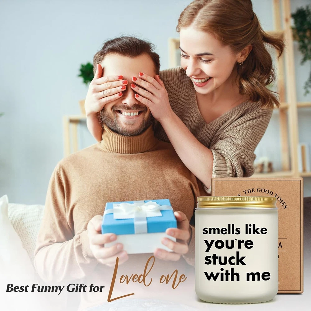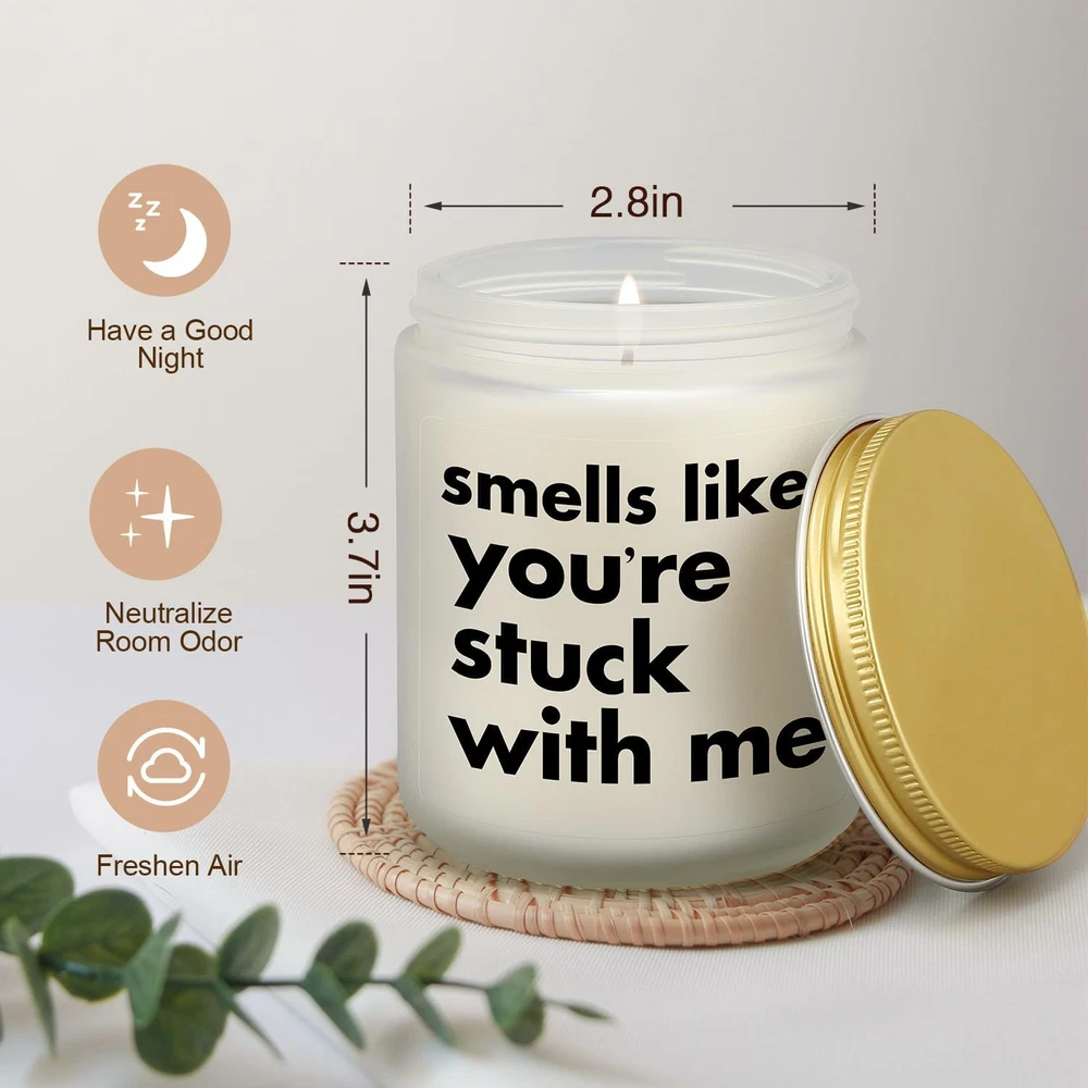 Romantic Valentines Day Gift: Best funny gift for loved woman man on coming valentine's day! With a funny label "smells like you're stucking with me" the candle can be a humorous gift for girlfriend, boyfriend, wife, husband, future wife, future husband, newly engaged lovers couples, fiance, fiancee, missing you gift for girlfriend boyfriend long distance, gag gift for pregnant wife or new mom new dad... CINGUE candle is a good surprise for loved one and saying I love you in a funny way. Unique Romantic Gifts for any Occassion: A scented candle with such funny message can be a meaningful and gag gift as valentine's day gift, birthday gift for boyfriend/girlfriend, christmas gift, Xmas gift, easter gift wedding day gift for husband/wife, engagement gift for fiance/fiancee, funny months anniversary gift, 1st 2nd 3rd ...wedding anniversary gift, dating anniversary gifts. The receiver would burst heartfelt laghter for the hilarious message and form closer relationship with you. Natural Soy Wax & 50 Hours Burn Time: This candle chooses environmentally friendly soy-based wax to provide a clean, natural, safe and smokeless burning experience. A lead-free centered cotton wick promises evenly burning and prolongs the burning time up to 50 hours. High-quality ingredients enable a sweet relaxing fragrance to spread around the room, creating a warm and calming ambiance for reading books, practicing yoga, aromatherapy, bath and sleeping. Refreshing & Relaxing Lavender Scent: Natural nervous relieving prosperity, pairing calming lavender with comforting eucalyptus essential oil, this candle disperses a warm peaceful scent, creating a cozy and calming atmosphere for a space and soothing the nerve, releasing homesick, recalling sweet memory, relaxing mind and body and helping fall asleep faster. Bringing the scented candle also brings a healing and calming nervous release for loved ones. Giftable Package & Dimensions: 1 package contains 1 scented candle weighing 14oz(7oz wax) which enables plenty of time to enjoy its relaxing effects. The candle is 2.8*2.8*3.7 inches making it a nice addition for home in daily life. CINGUE candle will be carefully packaged with pearl cotton to avoid breaking in transportation. Giftable packaging offers a sense of ritual when the receiver opens it which makes the candle a cool and awesome gift that expresses heartfelt loves. Product Description A funny and practical gift Hope to win his or hers heartfelt laugh Get closer with loved one