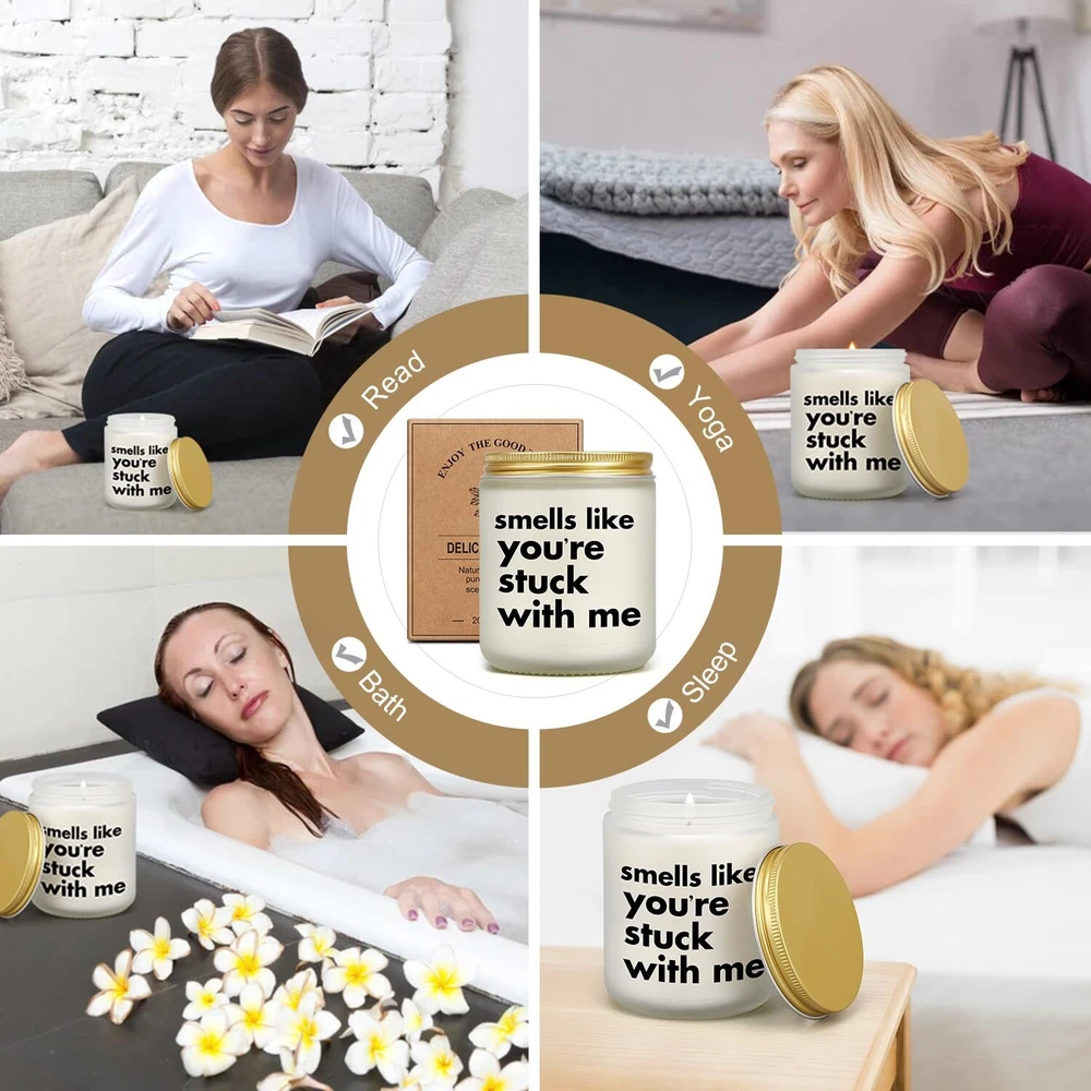 We offer Free Shipping on all order!! Welcome to my stores, The Smart of your choice and satisfaction guarantee. Romantic Valentines Day Gift Valentine's Day Gift for Women Men Funny Candle ... Gallery Product Description Features Romantic Valentines Day Gift: Best funny gift for loved woman man on coming valentine's day! With a funny label "smells like you're stucking with me" the candle can be a humorous gift for girlfriend, boyfriend, wife, husband, future wife, future husband, newly engaged lovers couples, fiance, fiancee, missing you gift for girlfriend boyfriend long distance, gag gift for pregnant wife or new mom new dad... CINGUE candle is a good surprise for loved one and saying I love you in a funny way. Unique Romantic Gifts for any Occassion: A scented candle with such funny message can be a meaningful and gag gift as valentine's day gift, birthday gift for boyfriend/girlfriend, christmas gift, Xmas gift, easter gift wedding day gift for husband/wife, engagement gift for fiance/fiancee, funny months anniversary gift, 1st 2nd 3rd ...wedding anniversary gift, dating anniversary gifts. The receiver would burst heartfelt laghter for the hilarious message and form closer relationship with you. Natural Soy Wax & 50 Hours Burn Time: This candle chooses environmentally friendly soy-based wax to provide a clean, natural, safe and smokeless burning experience. A lead-free centered cotton wick promises evenly burning and prolongs the burning time up to 50 hours. High-quality ingredients enable a sweet relaxing fragrance to spread around the room, creating a warm and calming ambiance for reading books, practicing yoga, aromatherapy, bath and sleeping. Refreshing & Relaxing Lavender Scent: Natural nervous relieving prosperity, pairing calming lavender with comforting eucalyptus essential oil, this candle disperses a warm peaceful scent, creating a cozy and calming atmosphere for a space and soothing the nerve, releasing homesick, recalling sweet memory, relaxing mind and body and helping fall asleep faster. Bringing the scented candle also brings a healing and calming nervous release for loved ones. Giftable Package & Dimensions: 1 package contains 1 scented candle weighing 14oz(7oz wax) which enables plenty of time to enjoy its relaxing effects. The candle is 2.8*2.8*3.7 inches making it a nice addition for home in daily life. CINGUE candle will be carefully packaged with pearl cotton to avoid breaking in transportation. Giftable packaging offers a sense of ritual when the receiver opens it which makes the candle a cool and awesome gift that expresses heartfelt loves. Thank you for your business, your trust and your confidence. It is our pleasure to work with our customers. Delivery ☎ If you have any question. Please do not hesitate to contact us. Please send us a message via eBay system. We reply every message within 24 hours. If you did not receive our reply. We think maybe we did not receive your message. Please send us message again. Payment Policy ❤ Payment managed by eBay. We accept payment via PayPal, credit cards, and other payment methods supported by eBay. Please ensure your payment method is correct and updated to avoid any delays in processing your order. Shipping Policy We only send the item according to the address on eBay, the address can't be changed once we pack the item. Please double check your shipping address before you send the payment. It should take 3-5 business days for the product to reach your destination. If the product doesn't reach your destination within the time limit, please give it an additional 1-2 business days in case of postal delays and/or possible technical issues. We use a selection of shipping services such as UPS, FedEx, USPS etc. We ship only to the 48 contiguous states of America. We do not ship to Hawaii, Alaska, US Protectorates, APO/FPO addresses and PO Boxes. Local pickups are not offered. If it takes any longer than that, please do not hesitate to contact us to resolve the issues. Feedback ❤ We take our reputation seriously, we buy and sell online, so we understand the value of trust. If you are unsatisfied with your order, please contact us and we will work with you to resolve it to your satisfaction. Return Policy - This product comes with 30-Days Money Back Guarantee. - If you receive an item and it doesn't work properly or you don't like it because of any reason at all. - We have a 100% refund/return policy. We will ship you a new item or refund your money for the full sale amount. - For all returned products, buyers MUST contact us for the returning address.