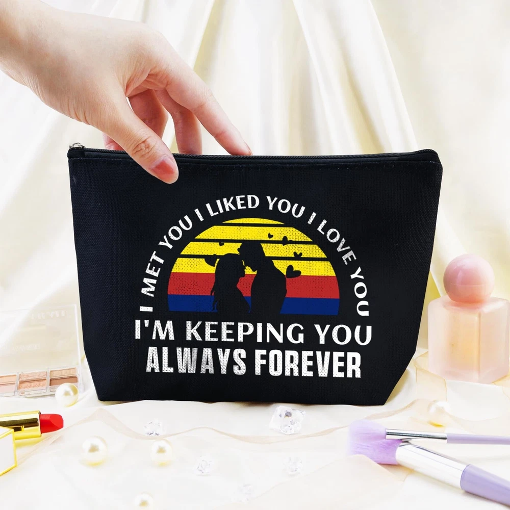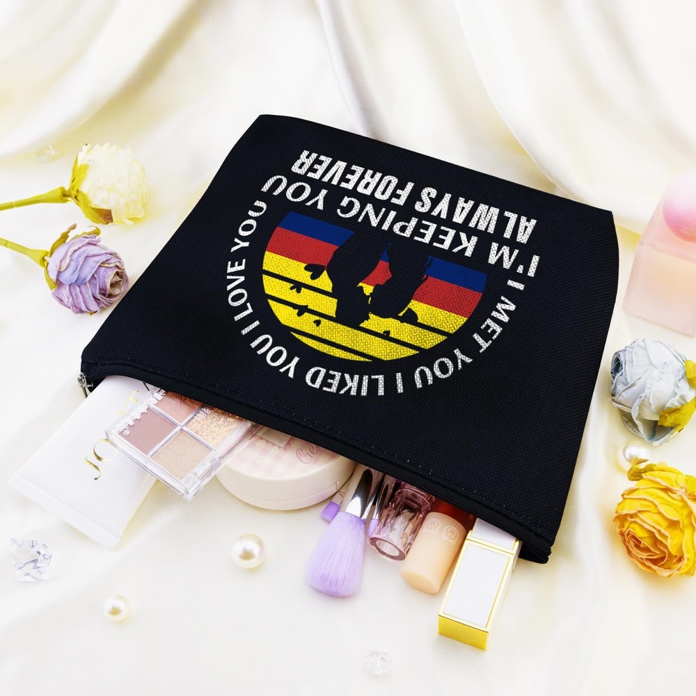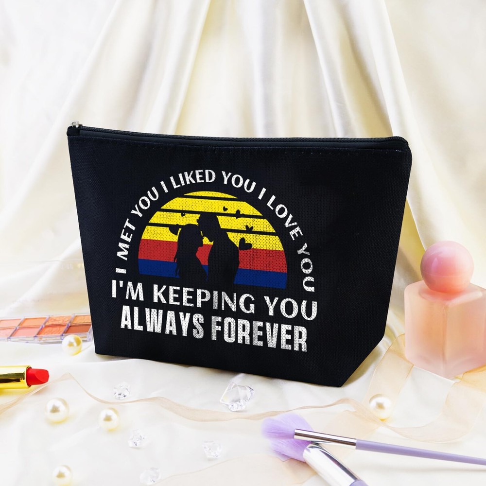 Romantic Valentines Day Gifts for Her Valentines Makeup Gift Valentines Day Gifts for Her Valentine Makeup Bag Couples Lovers for Wife Girlfriend Birthday Gifts for Gf Travel Zipper Pouch Product Details Color: black-forever Brand: Yoxiumi MPN: Does not apply UPC: Does not apply EAN: Does not apply Product Dimensions: 2 x 0.5 x 0.5 inches Item Weight: 0.018 ounces Department: Women Country of Origin: China 1.Valentines Day Gifts for Her: Surprise your special someone with this chic and romantic "I met you, I liked you, I love you, I'm keeping you, Always Forever makeup bag, the perfect sentimental Valentines Day gifts for girlfriend 2.Valentines Gifts for Gf: Ideal for girlfriends, wives, moms, sisters, and daughters, this cute and funny makeup pouch is a delightful choice for birthdays, Mother's Day, Christmas gift bags, or as a graduation present 3.I Love You Gifts for Her: This girlfriend/wife makeup bags is double-sided printed, made from natural linen, soft, hardy & durable, collapsible, easy to compress and store, the cosmetic bag is very high quality and waterproof. The sliver zipper is high quality with an anti-slip function flimsy 4.Valentine Bags Female: Measuring 10.2 x 6.6 inches, It's great as a travel toiletry bag, for organizing cosmetics, or as a handy clutch for small essentials. Wonderful girlfriend/wife gift ideas 5.Valentines Gift Bags: These romantic gifts for girlfriend, wife are the anniversary couple gift, long distance relationship gift. It also makes heartfelt gifts for her, him, a gift for husband and wife, a date night gift idea Inspired by the timeless phrase "I met you, I liked you, I love you, I'm keeping you, Always Forever," this bag captures the essence of your love story. The adorable penguin couple design adds a charming and whimsical touch to her beauty routine, making it a joy to use every day.Crafted from high- quality, durable fabric, this bag is built to last. The sturdy zipper ensures easy and secure access to her makeup, skincare products, and toiletries, while the spacious interior offers plenty of room for all her essentials. Multiple compartments keep everything organized and easy to find.Whether she's traveling for business or pleasure, heading to the gym, or just needs a stylish way to carry her daily essentials, this penguin makeup bag is perfect for any occasion. It's not just a bag; it's a symbol of your love and commitment to her.Surprise her with this heartfelt and romantic gift. Our Makeup Cosmetic Bag is a keepsake she'll cherish forever. Order now and make her feel special on Valentine's Day, an anniversary, birthday, or any special occasion. Show her how much you love her with this charming and practical gift!