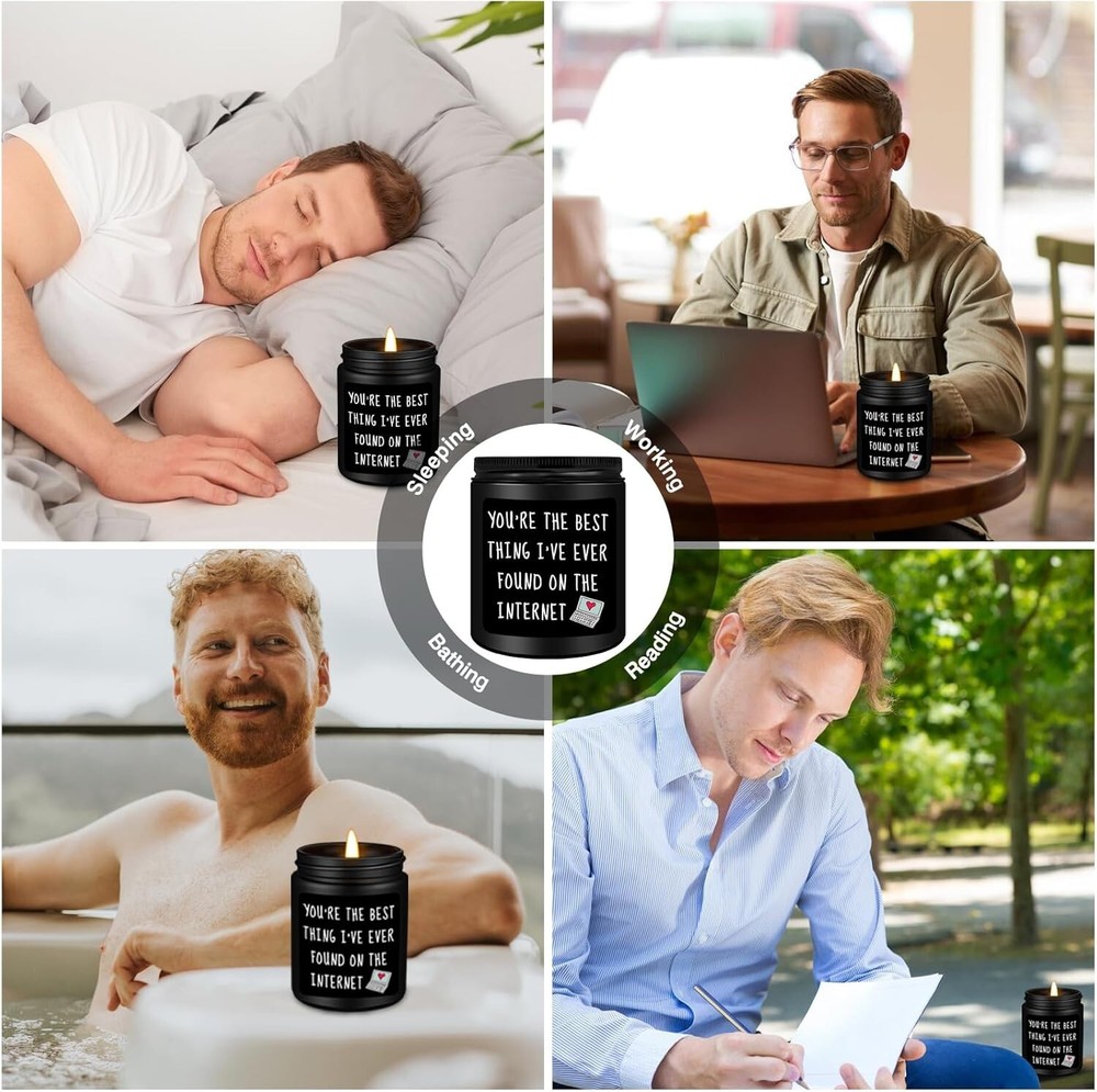 Valentine's Day Gifts for Him: Premium quality black cedar juniper sandalwood scented candles make great gifts for men. This funny scented candle features a witty and meaningful phrase to make him smile: "You're the best thing I've ever found on the internet!" Gifts for men, gifts for him, best friends, boyfriends, husband, fiancé, couples, teacher, coworker, boss, neighbor, classmate, brother, dad, or anyone else. Warm and humorous candles have a unique way of making him laugh. Relaxing Gift for Men: A premium black cedar juniper sandalwood scented candle is great for sleep promotion and relief from anxiety, depression, and stress. A good addition to the bathroom, bedroom, kitchen, living room, office, etc. Funny gifts for men in your life to create a stress-free, relaxed, and comfortable environment. Funny Valentine's Day Gifts for All Occasions: This candle is a great gift for most occasions, including birthdays, Valentine's Day, new jobs, housewarming, graduations, weddings, Christmas, Thanksgiving, anniversaries, funny stocking stuffers, secret Santa exchanges, quarantine gifts, and holidays. Warm and humorous candle gifts have a unique way of making him laugh, and they will love them very much. All-Natural Scented Candle: This funny scented candle is made of all-natural wax, a cotton wick, and natural essential oils, which burn for a long time, sufficiently, and cleanly, with no black smoke. Helps you fully relax your body and enjoy downtime, work, reading, meditation, bathing, yoga, or date nights. Valentine's Day Birthday Gifts for Men: This candle is a funny birthday, anniversary, or Christmas gift for best friends, boyfriend, husband, fiancé, coworker, employee, boss, buddy, partner, men, your guy, couple, lover, forever friends, separated friends, new friends, old friends, or anyone else to show them how much you care and tell them how much you love them.