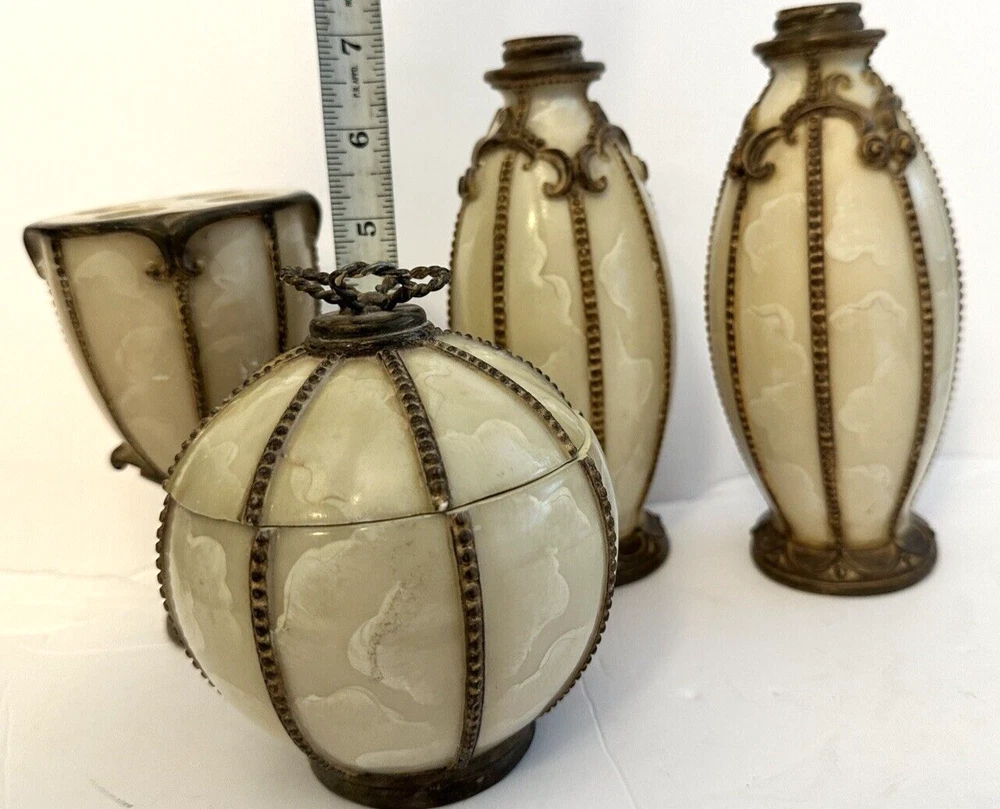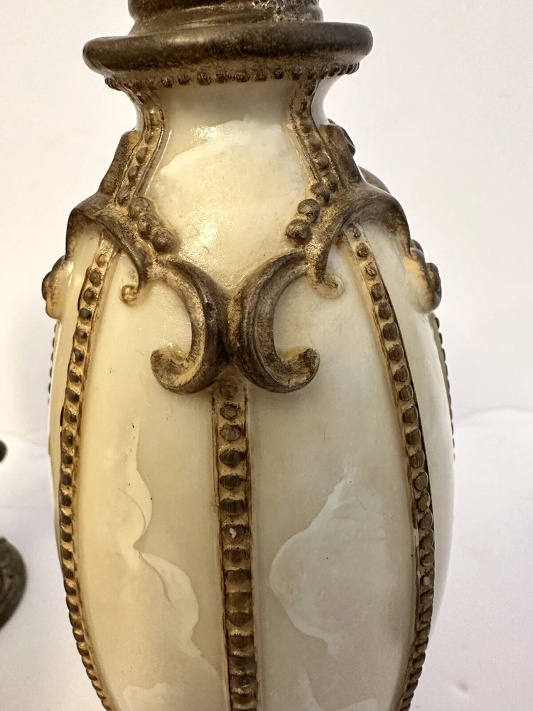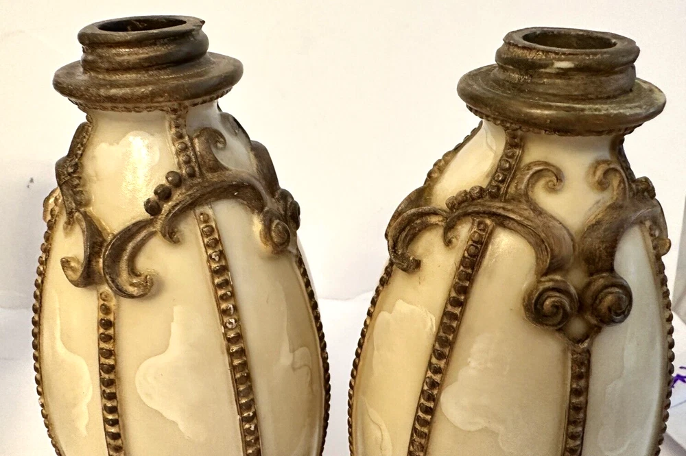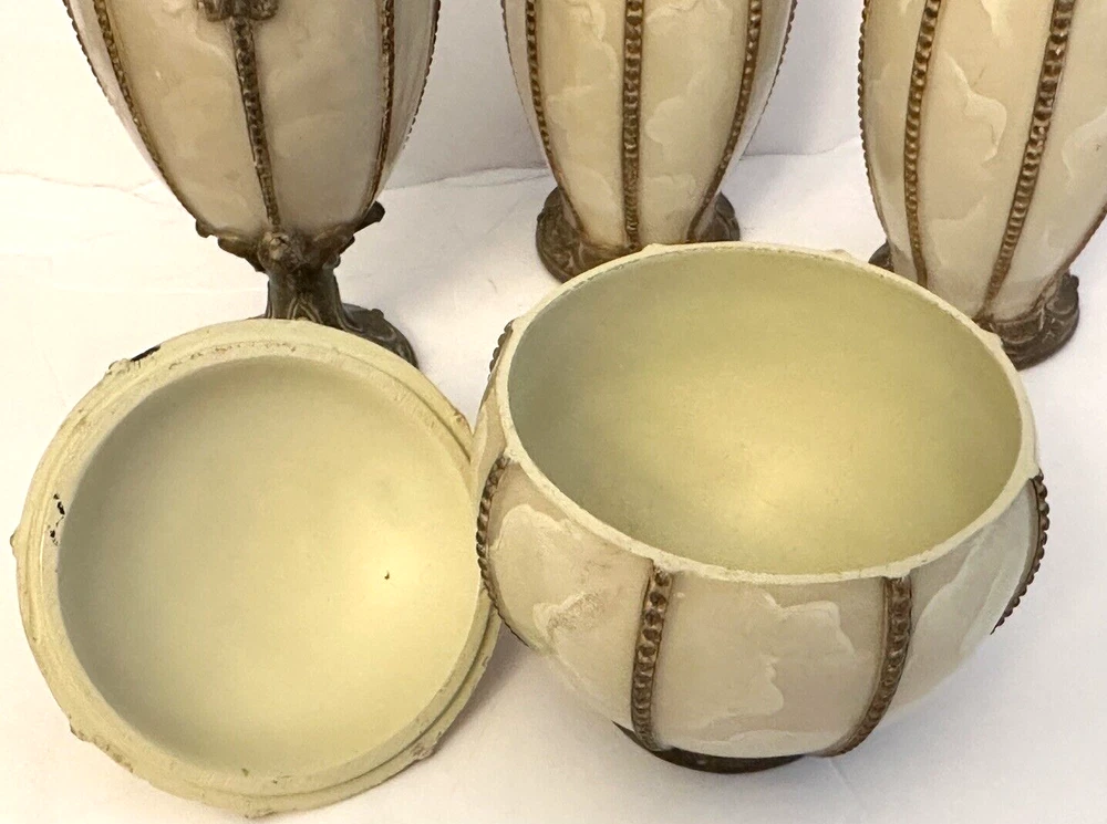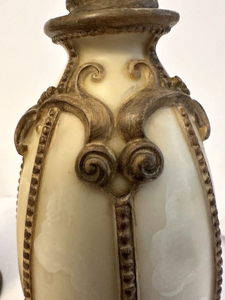 1- Romanza vanity potpourri, or trinket jar / dish with lid cover, hand painted bronze color metal rope and faux marble finish. Measurements: Diameter 4.5” Height 5” Weight 14.9 oz * Excellent condition 1 - Romanza toothbrush holder with ornate base and bronze metal rope accents. Height 5.5” Diameter 3” Weight 11 Oz 2 - Romanza lotion or soap dispensers (pumps are missing but generic pumps can be used instead or they can be used as bud vases) Height 7” Diameter 2.5” Weight each 11 oz