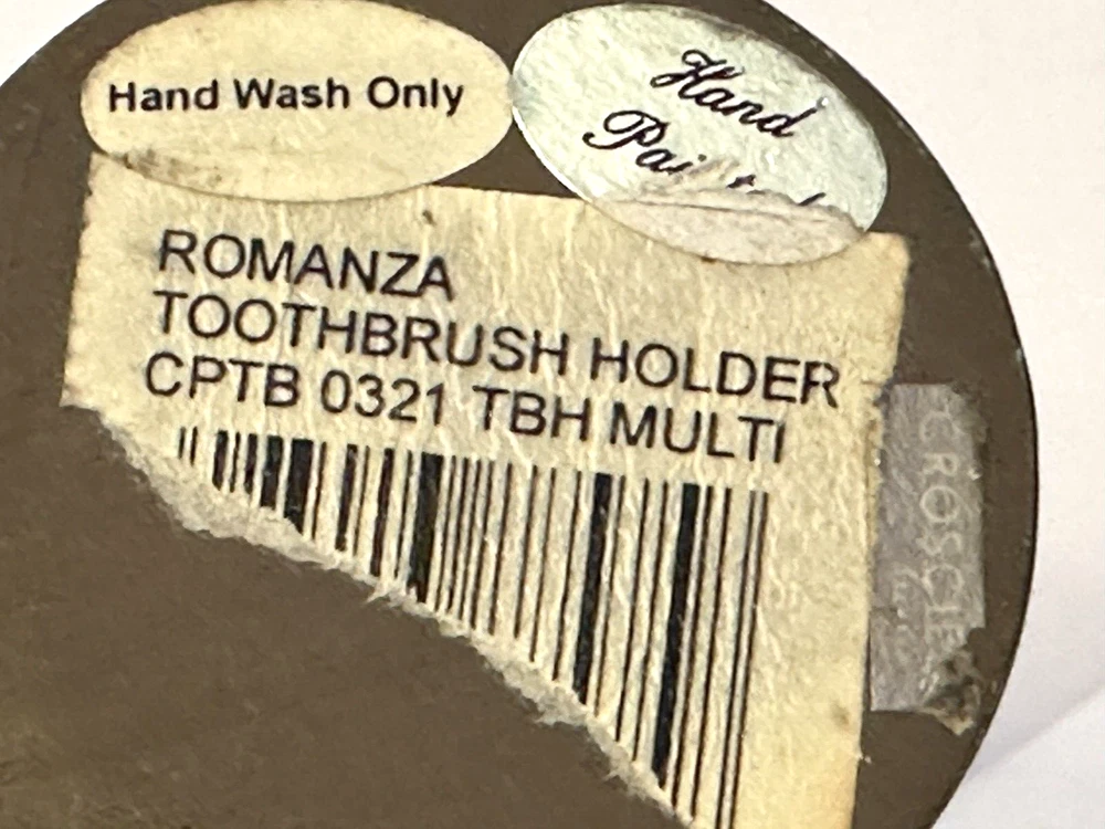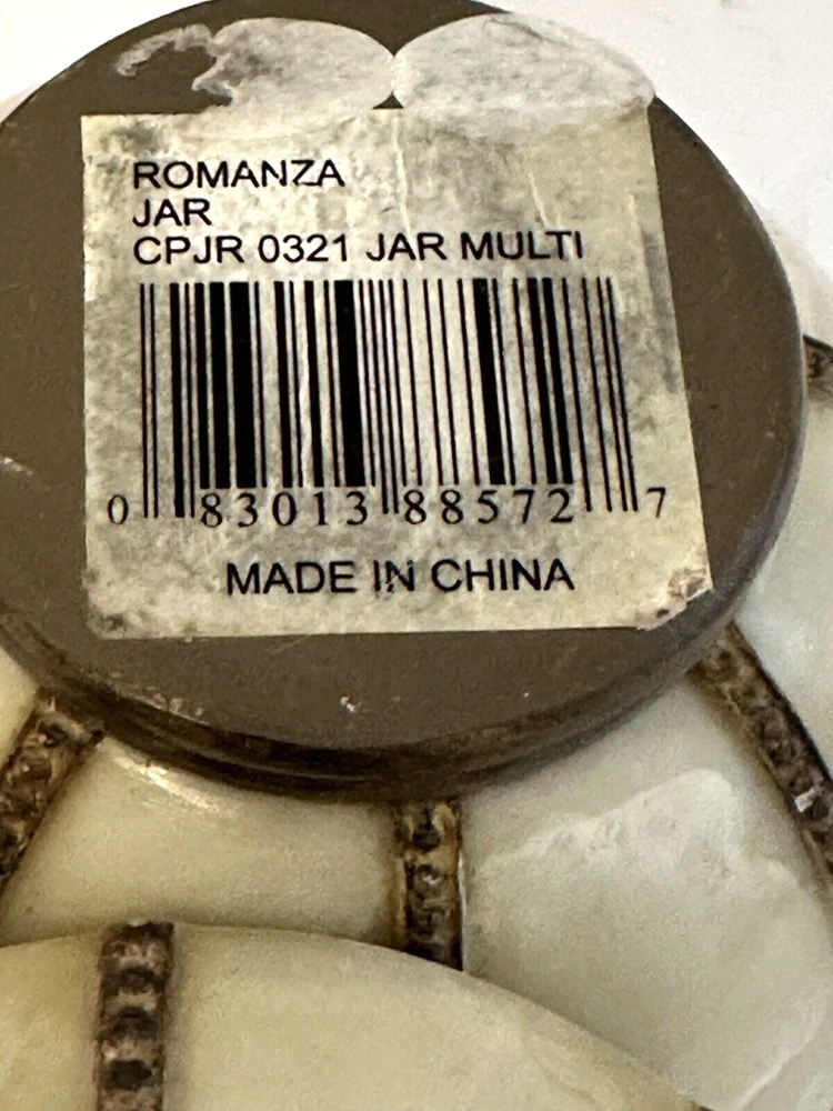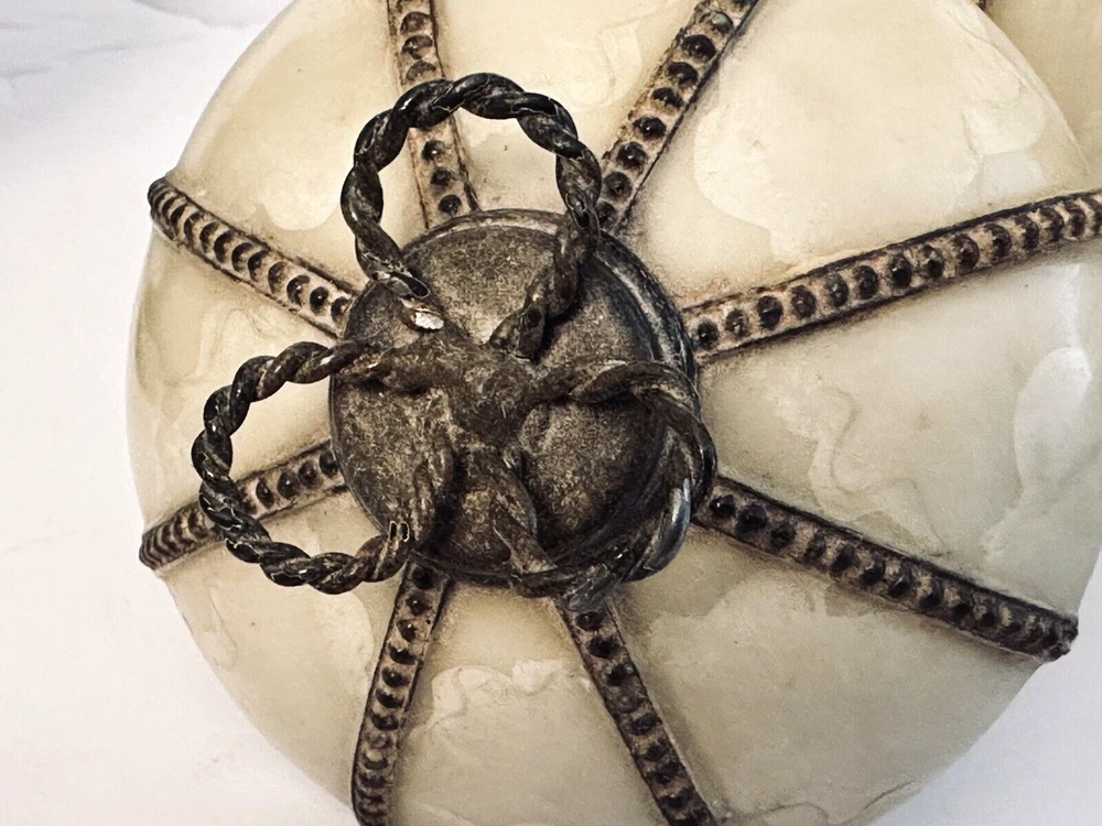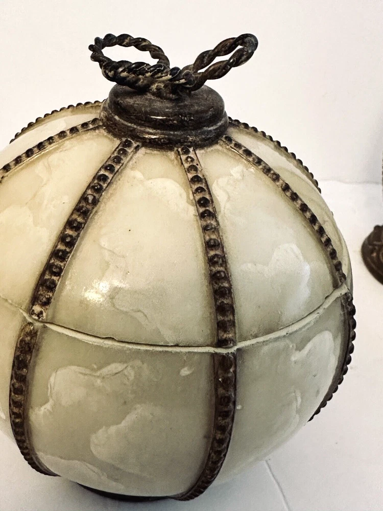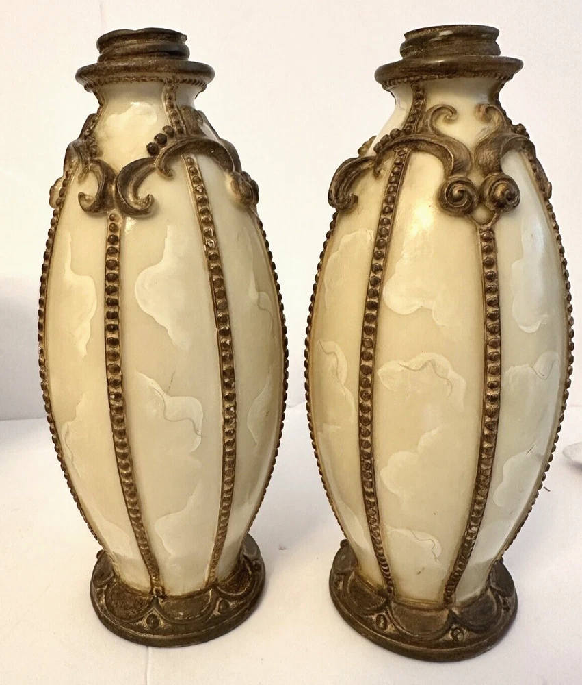 1- Romanza vanity potpourri, or trinket jar / dish with lid cover, hand painted bronze color metal rope and faux marble finish. Measurements: Diameter 4.5” Height 5” Weight 14.9 oz * Excellent condition 1 - Romanza toothbrush holder with ornate base and bronze metal rope accents. Height 5.5” Diameter 3” Weight 11 Oz 2 - Romanza lotion or soap dispensers (pumps are missing but generic pumps can be used instead or they can be used as bud vases) Height 7” Diameter 2.5” Weight each 11 oz