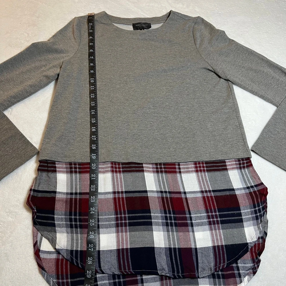 Romeo & Juliet Couture Crewneck Plaid Flannel Tunic Top Size Small 90s Preppy CONDITION: Pre-Owned. Excellent Used Condition. FLAWS/ALTERATIONS: No flaws. COLOR: Grey/White/Red/Blue SIZE: Women’s Size Small DETAILS: Crewneck Long sleeve Pull over Mixed media Sweatshirt bodice/Plaid lightweight flannel attached Faux layered look (fabric is sewn together to make 1 piece) Tunic length Slight high low hem MEASUREMENTS: Chest: 19.5" Front Length: 29" Back Length: 31.5" **All measurements are approximate and are taken flat** MATERIAL: **NO MATERIAL TAG** Bundle 2 OR MORE items to save more! Reasonable offers are welcomed! TAGS: Casual Comfy Fall Winter Maximalist Preppy Academia Boho Bohemian 90s Y2K 2000s Punk Grunge