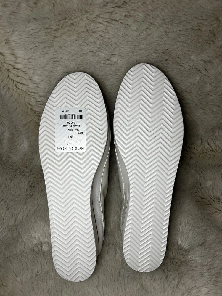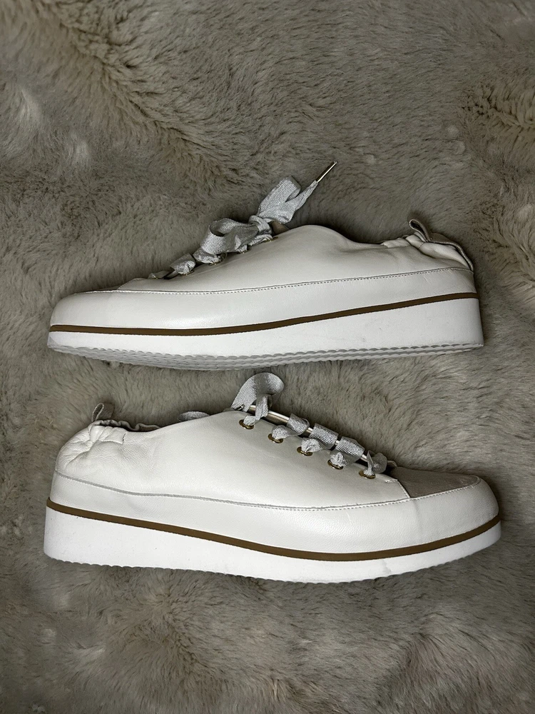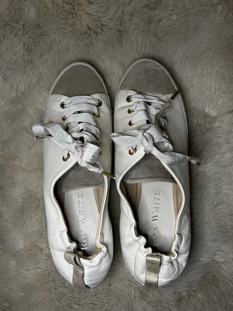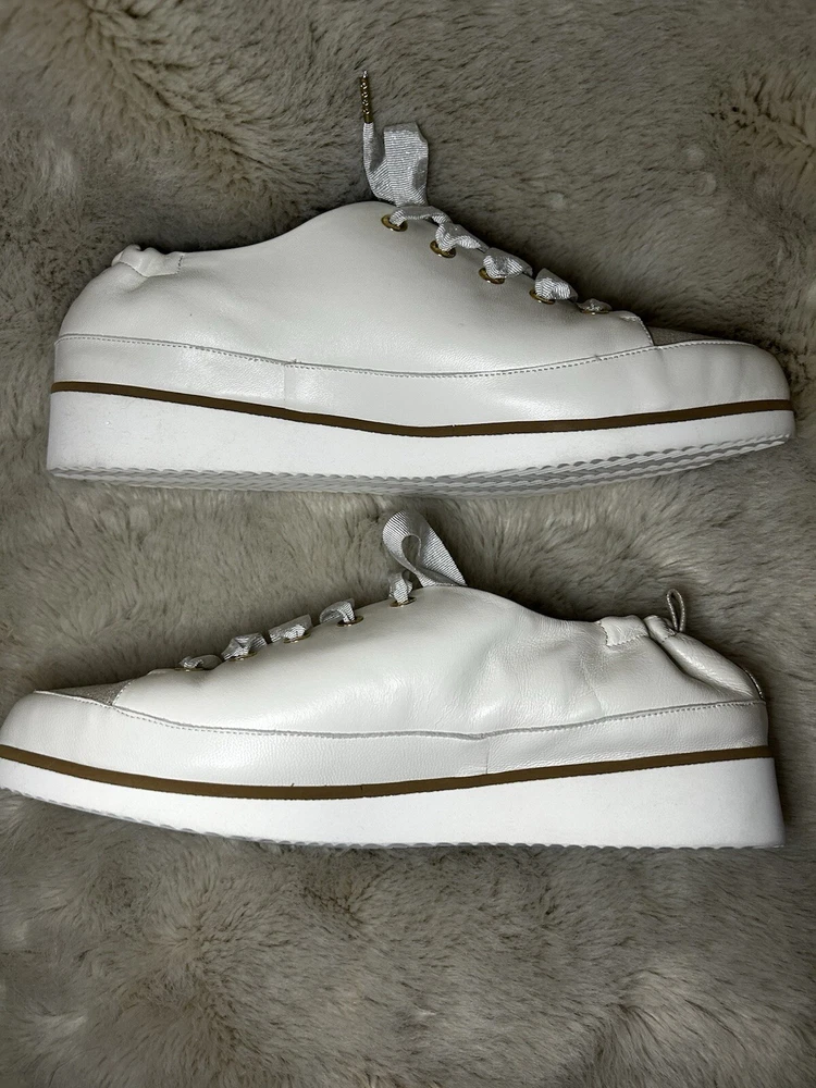 Elevate your sneaker game with these stunning Ron White Nova Ice Platino Leather Sneakers. Designed for women, these lace-up sneakers feature a solid pattern with glitter accents and a low-top shoe shaft style. Perfect for activewear, casual outings, or workwear, these sneakers come in a white color and are made of high-quality leather from Italy. These Nova Sneakers provide arch support and are available in EU Shoe Size 39.5 and US Shoe Size 8.5. The insole is also made of leather, ensuring maximum comfort for all-day wear. With a retail price of $395, these designer sneakers are a steal. Don't miss out on the chance to add these stylish sneakers to your collection.