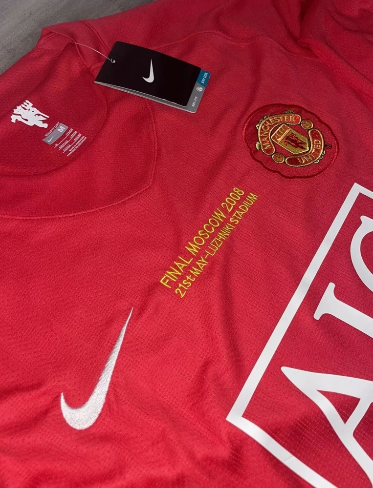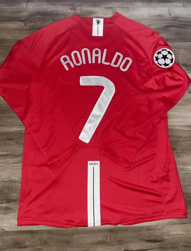 Show your support for Manchester United and one of their greatest players of all time, Cristiano Ronaldo, with this 2008 UCL home red jersey. The jersey features Ronaldo's iconic #7 and is made by Nike. It is perfect for any soccer fan or collector of sports memorabilia. The jersey is a size medium and made in Indonesia. It is great for wearing to games or displaying in your collection. Get this piece of soccer history today!