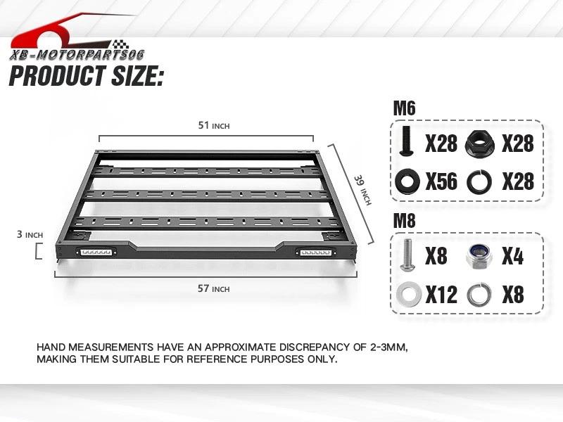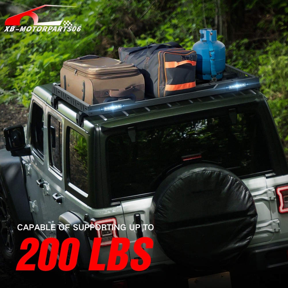 Roof Rack Cargo Basket For 2007-2026 Jeep Wrangler JK JL & 2020-2026 JT Hardtop For safety reasons, we strongly recommend that you seek professional installation services; Regularly check the rack's hardware for any loosening and ensure that the cargo is securely fastened before driving. Suitable Models : Compatible with 2007-2026 Jeep Wrangler JK JL Unlimited & Gladiator JT 2/4 Door Hardtop Package Includes : One set of Roof Rack Cargo Basket, 2 × LED Lights, installation screws, bolts. Product Information : Package Dimensions: 54.33'' x 9.84'' x 4.72'' Installation mode : Bolt-On Load Capacity : 2 0 0 LBS Mounting Type : Easy Snap Placement on Vehicle : Upper Item Weight : 52.14 Pounds Material : Carbon Steel Color : Black (hand measurements may have an error of 2-3 mm/0.078-0.118 in) Feature : ① Provides additional cargo space for your vehicle with a load capacity of 200 pounds, catering to various carrying needs such as camping gear, off-road equipment, bicycles, travel cargo, and more; ② Features an aerodynamic and streamlined front-end design, effectively reducing wind resistance and noise. The overall design is sleek and minimalistic, enhancing the overall appearance of your vehicle with an off-road look; ③ The overall surface is coated with black powder for durability, while the interior utilizes advanced electroplating technology for waterproofing and rust resistance. The metal parts are made of heavy-duty steel, ensuring sturdiness and durability; ④ Roof Rack Cargo Basket can be easily installed using simple bolt-on mounting. No drilling or modifications are required. Simply assemble the components and connect the mounting brackets to the cargo basket and rain gutters. We recommend ensuring a secure installation before driving and regularly checking for any loosening of the installed parts; Warranty Period : 1 year Standard Shipping (FedEx Ground or FedEx Home Delivery) Will usually ship within 3 business days of receiving cleared payment For safety reasons, we strongly recommend that you seek professional installation services; Regularly check the rack's hardware for any loosening and ensure that the cargo is securely fastened before driving. Suitable Models : Compatible with 2007-2026 Jeep Wrangler JK JL Unlimited & Gladiator JT 2/4 Door Hardtop Package Includes : One set of Roof Rack Cargo Basket, 2 × LED Lights, installation screws, bolts. Product Information : Package Dimensions: 54.33'' x 9.84'' x 4.72'' Installation mode : Bolt-On Load Capacity : 2 0 0 LBS Mounting Type : Easy Snap Placement on Vehicle : Upper Item Weight : 52.14 Pounds Material : Carbon Steel Color : Black (hand measurements may have an error of 2-3 mm/0.078-0.118 in) Feature : ① Provides additional cargo space for your vehicle with a load capacity of 200 pounds, catering to various carrying needs such as camping gear, off-road equipment, bicycles, travel cargo, and more; ② Features an aerodynamic and streamlined front-end design, effectively reducing wind resistance and noise. The overall design is sleek and minimalistic, enhancing the overall appearance of your vehicle with an off-road look; ③ The overall surface is coated with black powder for durability, while the interior utilizes advanced electroplating technology for waterproofing and rust resistance. The metal parts are made of heavy-duty steel, ensuring sturdiness and durability; ④ Roof Rack Cargo Basket can be easily installed using simple bolt-on mounting. No drilling or modifications are required. Simply assemble the components and connect the mounting brackets to the cargo basket and rain gutters. We recommend ensuring a secure installation before driving and regularly checking for any loosening of the installed parts; Warranty Period : 1 year On Dec 10, 2025 at 05:13:51 PST, seller added the following information: