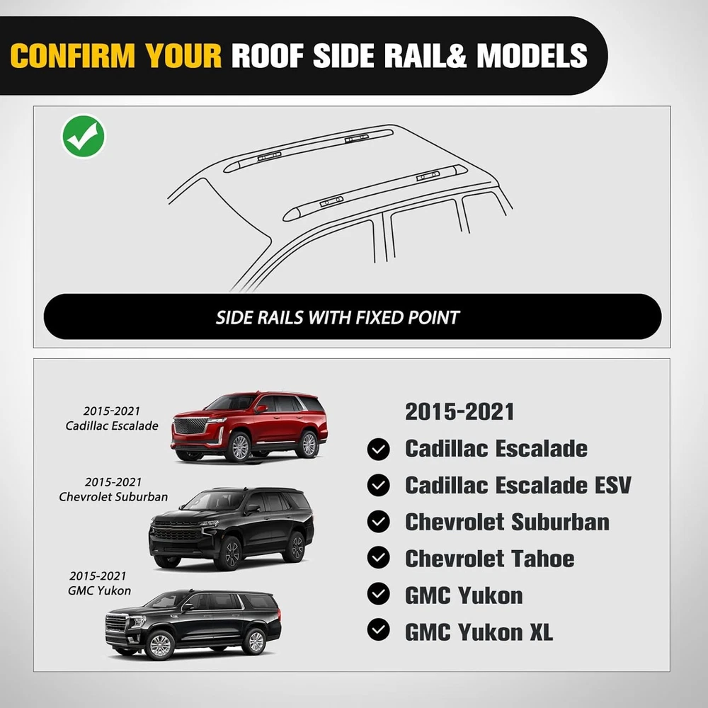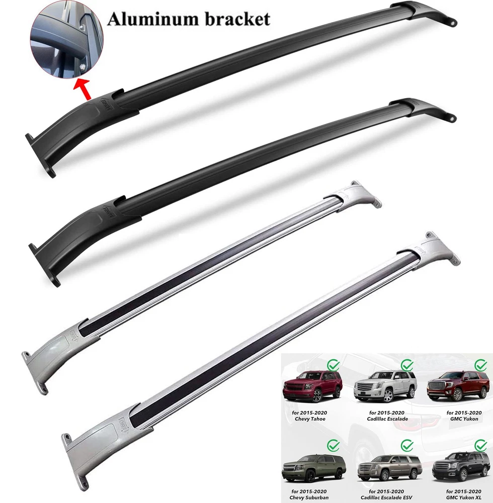 Features: 【Premium Quality】- Made from high-quality aluminum alloy ONLY, our cross bars are durable and can withstand a load capacity of up to 220lbs (99kg) when evenly distributed. 【Easy Installation】 - Assembly and disassembly is a breeze, requiring no drilling or cutting. We provide all necessary tools, hardware, and instructions for a quick installation. Our tech support is also available to answer any questions you may have. Fitment: For Cadillac Escalade 2015-2020 For Cadillac Escalade ESV 2015-2020 For Chevy Suburban 2015-2020 For Chevy Tahoe 2015-2020 For GMC Yukon 2015-2020 For GMC Yukon XL 2015-2020 This is after-market, NOT OEM ONE. Package: 2pcs Cross Bars Install hardware Roof Rack Cross Bar For Chevy Tahoe Suburban GMC Yukon XL Escalade 2015-2020 Business & Industrial ATV & UTV Parts Windshields Doors&Door Panel Roof Bumper&Grab Bars&Guards Fenders & Mud Flaps Skid Plate & A-Arms Guards Nerf Bars Other Car & Truck Parts& Accessories Interior Exterior Lighting & Lamps Bumpers & Reinforcements Grilles Seats & Seats Cover Racks Body Moldings & Trims Exhaust System Suspension & Steering Radiators Fenders & Mud Flaps Dash Parts Body Kits Snow Plows & Parts Mirrors Other Golf Cart Parts & Accessories Home & Garden Lawn Mower Parts Refrigerator & Freezer Parts Tools Ladders&Holders Rack Other Sporting Goods Electric Bicycles Others Motorcycle Accessories Backrests & Sissy Bars Fairings & Body Work Foot Pegs & Pedal Pads Intake Ducts & Scoops Seat Parts Saddlebags & Accessories Windshields Crash Bar&Racks Other Other Product Description Fit 15-20 Chevy Tahoe Suburban GMC Yukon XL Escalade Black Roof Rack Cross Bar Feature Condition: 100% Brand New Model: AT-64 Surface Finish: Black Adds style and carrying capacity to your vehicle Good Maintenance Practices Before purchasing and installing a roof rack, roof carrier cross or side rails, make sure they are the correct size and fit for your vehicle. It is also important to check the required items your vehicle needs to attach it. Make sure that all rails are properly and securely attached to your vehicle before use. WARNING/LIMITATION : The load you are carrying plus the weight of the rack must not exceed the maximum weight limitation of 220 lbs.of the rails. Fits 2015 2016 2017 2018 2019 2020 Chevrolet Tahoe. 2015 2016 2017 2018 2019 2020 Chevrolet Suburban. 2015 2016 2017 2018 2019 2020 GMC Yukon & Yukon XL. 2015 2016 2017 2018 2019 2020 Cadillac Escalade & Escalade ESV. Package Include 1 Set Roof Rack Cross Rail (As pics show) Shipping Policy Contact us Shipping Policy All items will be shipped out in 1 business day,no expedited service available. We ship our items to USA only(Does NOT include Hawaii,Alaska or Puerto Rico, PO Boxes/APO's ). Contact us Any Questions,Just feel free to contact us on eBay.We will reply you in 24 hours. Features : 【Premium Quality】- Made from high-quality aluminum alloy ONLY, our cross bars are durable and can withstand a load capacity of up to 220lbs (99kg) when evenly distributed. 【Easy Installation】 - Assembly and disassembly is a breeze, requiring no drilling or cutting. We provide all necessary tools, hardware, and instructions for a quick installation. Our tech support is also available to answer any questions you may have. 【Style and Design】- Our roof rack for your car is sleek and aerodynamic, complementing the lines of your vehicle. It's available in a range of finishes to match your vehicle's color or add a unique touch of personalization. 【Versatile Usage】- Ideal for weekend getaways or long-distance cross-country adventures, this rack provides ample storage space for skis, bicycles, sails, and other sports gear. Enjoy your sports while confidently facing any challenge. Fitment : For Cadillac Escalade 2015-2020 For Cadillac Escalade ESV 2015-2020 For Chevy Suburban 2015-2020 For Chevy Tahoe 2015-2020 For GMC Yukon 2015-2020 For GMC Yukon XL 2015-2020 This is after-market, NOT OEM ONE. Package: 2pcs Cross Bars Install hardware Payment Delivery details Terms of sales About us Contact us Payment We accept major credit card payments via Paypal. Payment must be received within 7 days of auction closing date. If you do not contact us or respond to our email within 7 days of auction closing date, we do not guarantee the item availability. We reserve the right to cancel any unwanted bids. Delivery details Flat rate shipping charge will be applied to the 48 continental USA States. Extra shipping fee will be charged to ship item(s) to HI, AK, PR, GU, VI, APO, FPO . Item(s) will be shipped via UPS Ground or USPS or Fedex within 3 Business days after payment is received. A Tracking Number will be upload on platform as soon as item(s) is shipped. International buyers please note, we are not responsible for any custom duties, taxes and brokerage fees. For some oversize packages, we may not be able to ship via USPS. Terms of sales All of our items are professionally made and guaranteed to fit. A professional installation is always recommended. Please send a message over eBay if you have any questions. We accept returns within 30 or 60 days after you received the item(s). All returned items must be new and in original package. The buyer will pay return shipping fees. No refund will be made for damaged parts. Shipping and handling fees and insurance fee are not refundable. About us Our warehouses are located in CA and NJ The transportation time is approximately 3-5 working days Contact us Your satisfaction is our top priority. We stand behind all products that we sell. If you have a problem with any of our listings, please allow us to work it out. Our business times are Monday-Friday 9:00- 5:00 Pacific Time. Office closes on weekends and holidays. We are striving to earn a 5- star rating with every purchase. Please take a moment to leave us a positive feedback when you receive your order. If you are not satisfied, please let us know before you leaving feedback. Please always include you