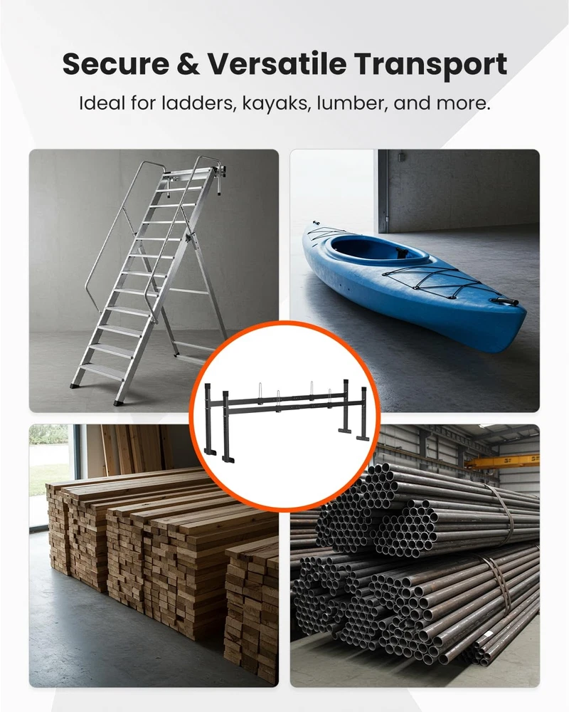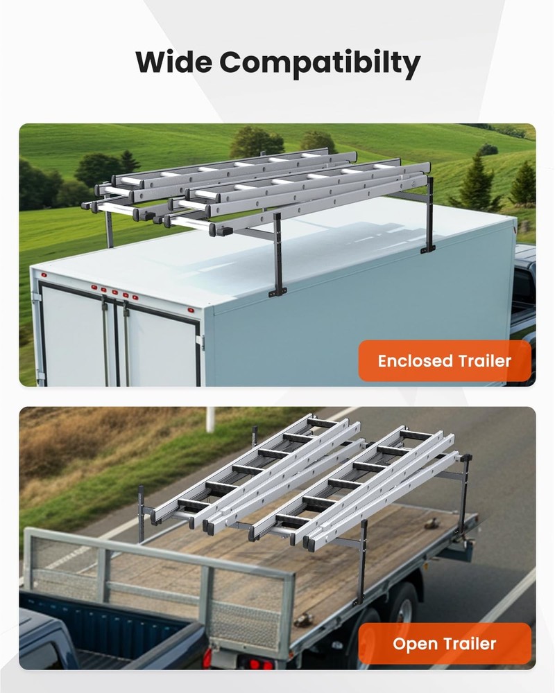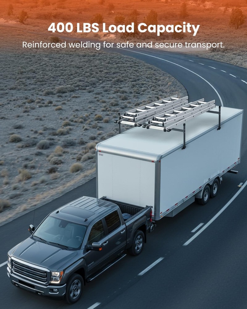 π Product Description Upgrade your trailer with this heavy-duty adjustable ladder rack designed for secure, stable, and versatile transport. Built for contractors, movers, homeowners, and anyone needing reliable hauling support, this rack fits most enclosed and open trailers with ease. πͺ Heavy-Duty Steel Construction Built from thick, heavy-duty steel for superior strength and durability Black powder-coated finish protects against rust, corrosion, and harsh outdoor use Designed for long-lasting performance on the road or at the job site π¦ 400 LBS Load Capacity Dual-rack structure with reinforced welding for added stability Supports up to 400 lbs of evenly distributed weight Ideal for transporting ladders, lumber, pipes, panels, kayaks, and more π§ Adjustable Width & Height Width adjustable from 5.77 ft to 8.65 ft to fit a wide range of trailers Height adjustable from 16.5 inch to 24.5 inch Easy to cut or trim crossbars to achieve a perfect custom fit Compatible with most enclosed trailers, open trailers, and utility trailers π Easy Installation Includes all necessary mounting hardware Self-tapping screws & heavy-duty bolts ensure a firm and secure attachment Clear instructions guide you through a fast, simple setup π Secure & Versatile Transport Built-in ladder stoppers keep items from shifting during transit Excellent for hauling: ladders, kayaks, lumber, construction materials, oversized cargo Keeps cargo stable and protected while you drive π¦ Package Includes 2Γ Ladder Rack Uprights 2Γ Adjustable Crossbars Mounting Hardware Set Installation Instructions π Notes Trailer not included Ensure proper measurement before installation Weight capacity applies to evenly-distributed loads On Nov 19, 2025 at 15:07:27 PST, seller added the following information: