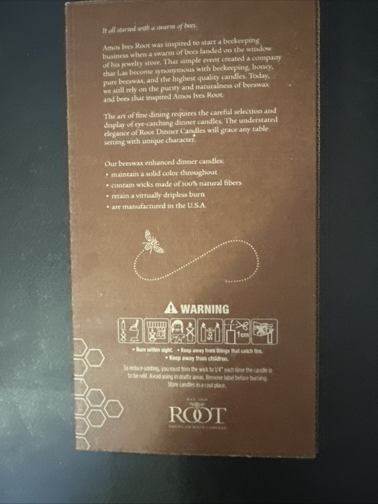 Enhance the ambiance of your dining experience with these beautiful Root Grecian Collenette Candles. Crafted from a blend of beeswax, these tapered/dinner candles come in a pack of four and burn for 2.5 hours per inch. The autumn color adds a warm and inviting touch to any space while the unscented smell ensures that your guests can focus on the food and conversation. Made in the United States, these candles have a size of 1.25" x 9" and a shape that is sure to impress. The brand, A.I. Root, is known for their quality and reliability. Add these candles to your home and take your dining experience to the next level.