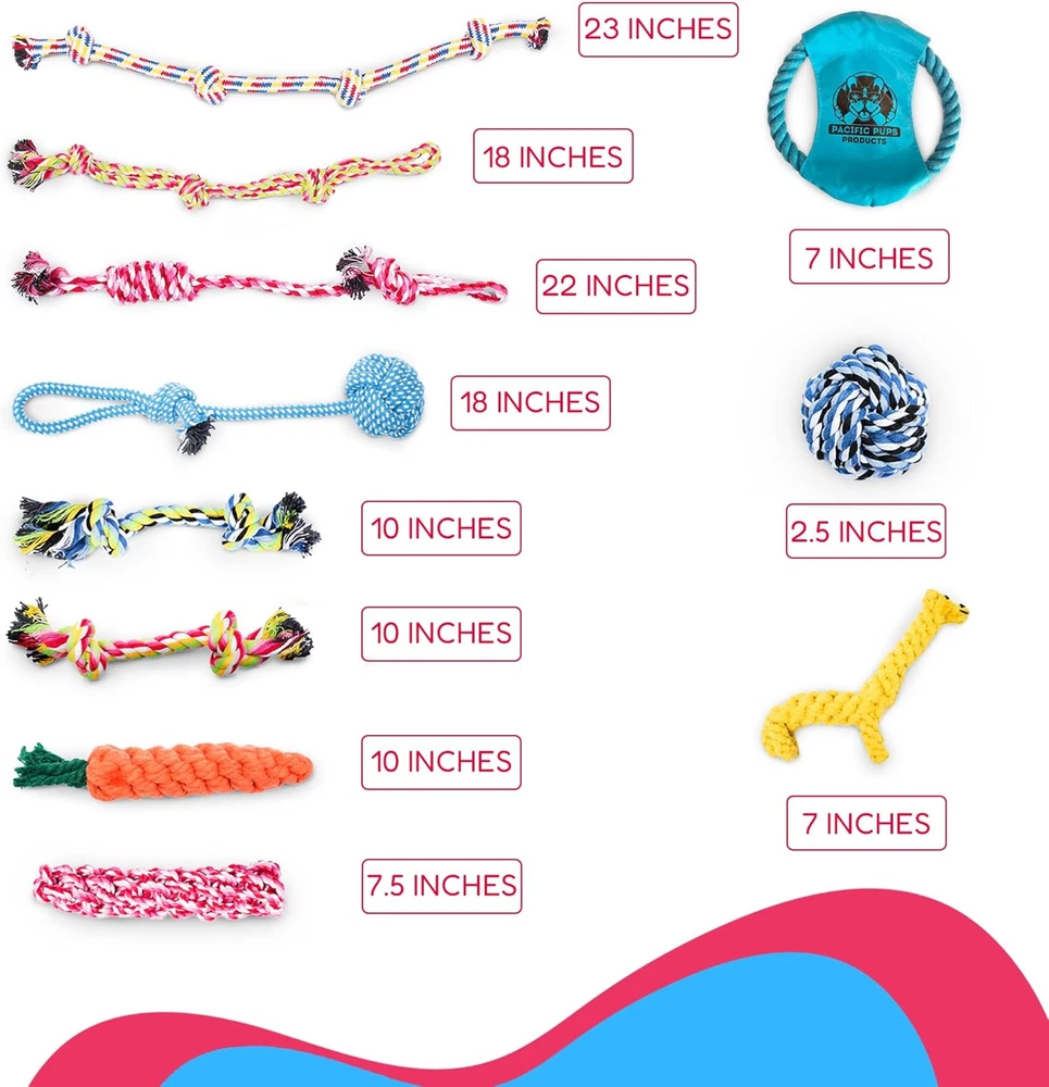 A Variety of Heavy Duty Dog Rope Toys for Dogs: Come in this 11-piece dog toy pack, dog rope toys include: dog tug of war toys, flossie dental toys for dogs (giraffe & carrot), dog rope toys for small dogs, Dog rope toys for large dogs & medium dogs, and these are all interactive toys for dogs that will entertain your dog for hours. There are durable dog toy ropes for all-size pups in this dog toy pack Durable Dog Toys for Aggressive Chewers of All Life Stages- Our strong dog ropes for aggressive chewers are great for all ages and sizes from puppy rope toys, and puppy teething toys to super chewer dog toy ropes and adult dog tug of war toys While these are best suited as dog rope toys for medium dogs, they also make great big dog toys ropes toys for small dogs, and dog toys for large dogs. See measurements of all rope toys in the photo for more detail Our Dog Tug of War Toy Ropes are all Safety Tested - Puppy chew toy ropes have all passed rigorous safety testing and are made from only safe materials. No plastic dog toy ropes in this dog toy set! Our dog ropes toys are made of Cotton Dog Toys Benefit Our Non-Profit Animal Rescue - Pacific Pups Products dog toys are made to support Pacific Pups Rescue, our dog rescue in California. Every purchase of our dog toys helps save the life of a homeless dog Interactive Dog Toys Help to Reduce Anxiety in Dogs - These pet toys for dogs will help keep your aggressive chewer busy, so they do not become destructive in the home. Your dog can enjoy playtime with other dogs with the dog tug toy; play tug of war with their human; or use the dog rope toys as a dog chew toy to fight boredom when home alone. All of the dog rope toys are durable dog toys and can withstand hours of chewing, shaking and tugging Product Description Your Dog's Favorite Rope Toys! with 11 Stunning Dog Ropes to Choose From Your pup will have 11 different dog rope toys to choose from in this pack of interactive dog toys! Which one will be your pup's top rope toy for dogs? Keep your small or medium dog entertained with our rope toys for aggressive chewers dog rope toys for medium dogs and small aggressive dogs Check this video of 11pcs Dog Rope Toys Unboxing! by Consumer Quest The video showcases the product in use. The video guides you through product setup. The video compares multiple products. The video shows the product being unpacked. Check out this video by Consumer Quest for Pacific Pups exploring every toy in the 11pcs Dog Rope Toy set: Showing why choosing 11pcs Dog Rope Toy Pack is the better choice for your dog, for unmatched fun time and quality! Supporting Pacific Pups Rescue. #ChooseToSupport #PacificPups Rescue Noble Cause over Paws! Every Purchase Supports Pacific Pups Rescue Every purchase you make echoes the wagging tail of another dog. How? Your every purchase contributes to Pacific Pups Rescue, which benefits in the rescue of our dogs in distress. Feel good knowing that your purchase benefits in rescuing dogs in need. Celebrate in style and make a difference! Variety of Flossy Tug Toys for Dogs! Flossy Dog Rope Toys for Dogs Comes with Numbers of Dog Toy Ropes to Choose from We know its hard to find rope dog toys for aggressive chewers! We have given our toys to the toughest chewers in our rescue to try the durability of these tough dog toys. They hold up to the toughest of chewers! 11-Piece Pacific Pups Products for dogs, Dog Toy Ropes for Aggressive Chewers These Dog Toy Ropes are made with durable & and high-quality materials. Popular dog toys for Christmas gifts for dogs: a complete set of toys for large breeds and dog chew toys for aggressive chewers medium breeds. Our 11 pc bulk dog toys ropes promote dental health and reduce destructive behavior. Please Consider adding these Products from Pacific Pups, Supporting Dog Rescue Add to Cart Add to Cart Add to Cart Add to Cart Add to Cart Add to Cart Add to Cart Customer Reviews 4.6 out of 5 stars 23 4.5 out of 5 stars 38 4.5 out of 5 stars 38 4.5 out of 5 stars 38 4.5 out of 5 stars 38 4.3 out of 5 stars 10,024 4.4 out of 5 stars 60 Price $11.99 $ 11 . 99 $12.99 $ 12 . 99 $12.99 $ 12 . 99 $12.99 $ 12 . 99 $12.99 $ 12 . 99 — $13.98 $ 13 . 98 Purpose For Pet Cleaning and hygiene Celebration dog party supplies Celebration dog party supplies Celebration dog party supplies Celebration dog party supplies Dog dental care toys Small dogs tennis balls toys Support Pacific Pups Rescue ✔ ✔ ✔ ✔ ✔ ✔ ✔ Recommended Age/Size For All Pet Size For All Dog Size For All Dog Size For All Dog Size For All Dog Size For All Dog Size For small dogs Made of Pet Friendly Material ✔ ✔ ✔ ✔ ✔ ✔ ✔ Variety Pet Wipes for different uses Birthday-themed toys and items Birthday-themed toys and items Birthday-themed toys and items Birthday-themed toys and items 18 different types of dog toys 6 Squeaky dog ball Safety Tested Material ✔ ✔ ✔ ✔ ✔ ✔ ✔ Durability Tested ✔ ✔ ✔ ✔ ✔ ✔ ✔ Pet Friendly ✔ ✔ ✔ ✔ ✔ ✔ ✔ Indoor & Outdoor Use ✔ ✔ ✔ ✔ ✔ ✔ ✔ Helps Homeless Dogs ✔ ✔ ✔ ✔ ✔ ✔ ✔ Help with Boredom ✔ ✔ ✔ ✔ ✔ ✔ ✔ Value for money ✔ ✔ ✔ ✔ ✔ ✔ ✔ Please Also Consider These Products from Pacific Pups Products - Supporting Dogs Add to Cart Add to Cart Add to Cart Add to Cart Add to Cart Add to Cart Customer Reviews 4.3 out of 5 stars 14,904 4.5 out of 5 stars 3,036 4.2 out of 5 stars 3,594 4.5 out of 5 stars 1,127 4.3 out of 5 stars 3,855 4.2 out of 5 stars 3,594 4.3 out of 5 stars 3,855 Price $21.99 $ 21 . 99 $15.99 $ 15 . 99 $10.99 $ 10 . 99 — $15.99 $ 15 . 99 $10.99 $ 10 . 99 $12.99 $ 12 . 99 Durability Tested ✔ ✔ ✔ ✔ ✔ ✔ ✔ Support Pacific Pups Rescue ✔ ✔ ✔ ✔ ✔ ✔ ✔ Recommended Age/Size For All Dog Size For XL Dogs For Medium, Large, XL Dogs For Small Dogs For Medium, Large, XL Dogs For Medium, Large, XL Dogs For Medium, Large, XL Dogs Safety Tested ✔ ✔ ✔ ✔ ✔ ✔ ✔ Number of Dog Toys 11pcs 1pc 1