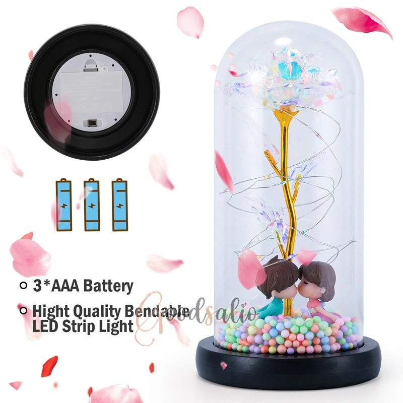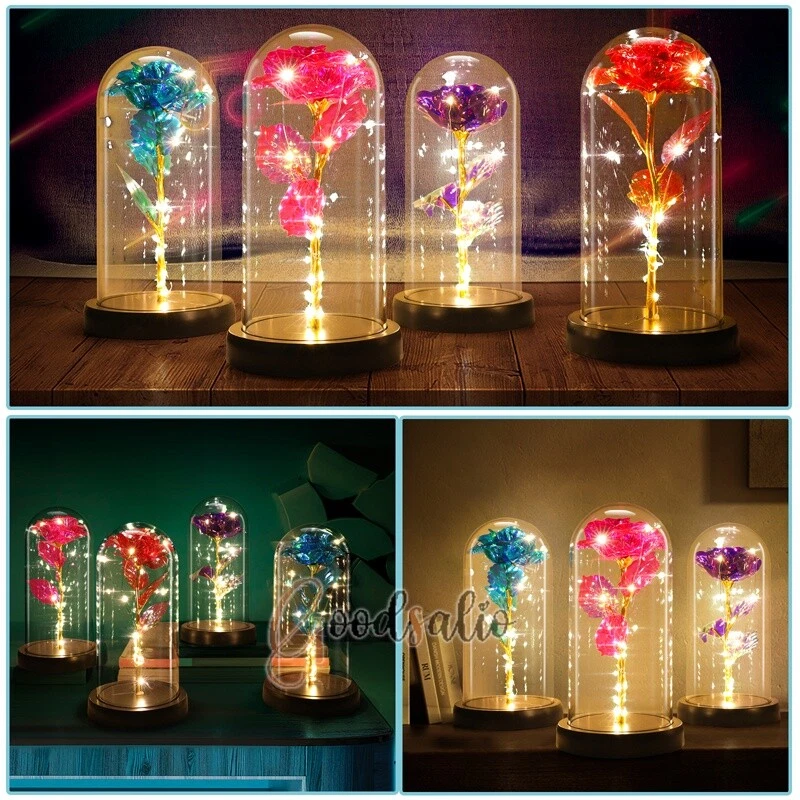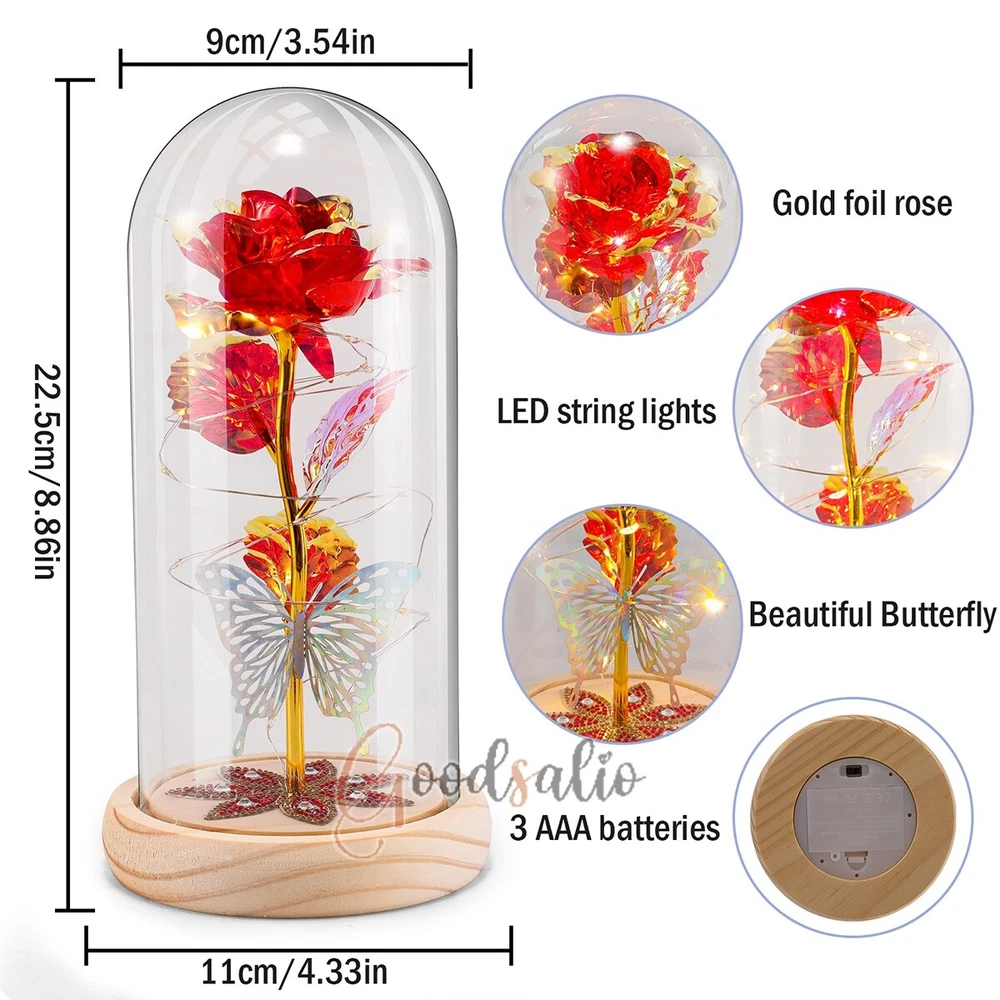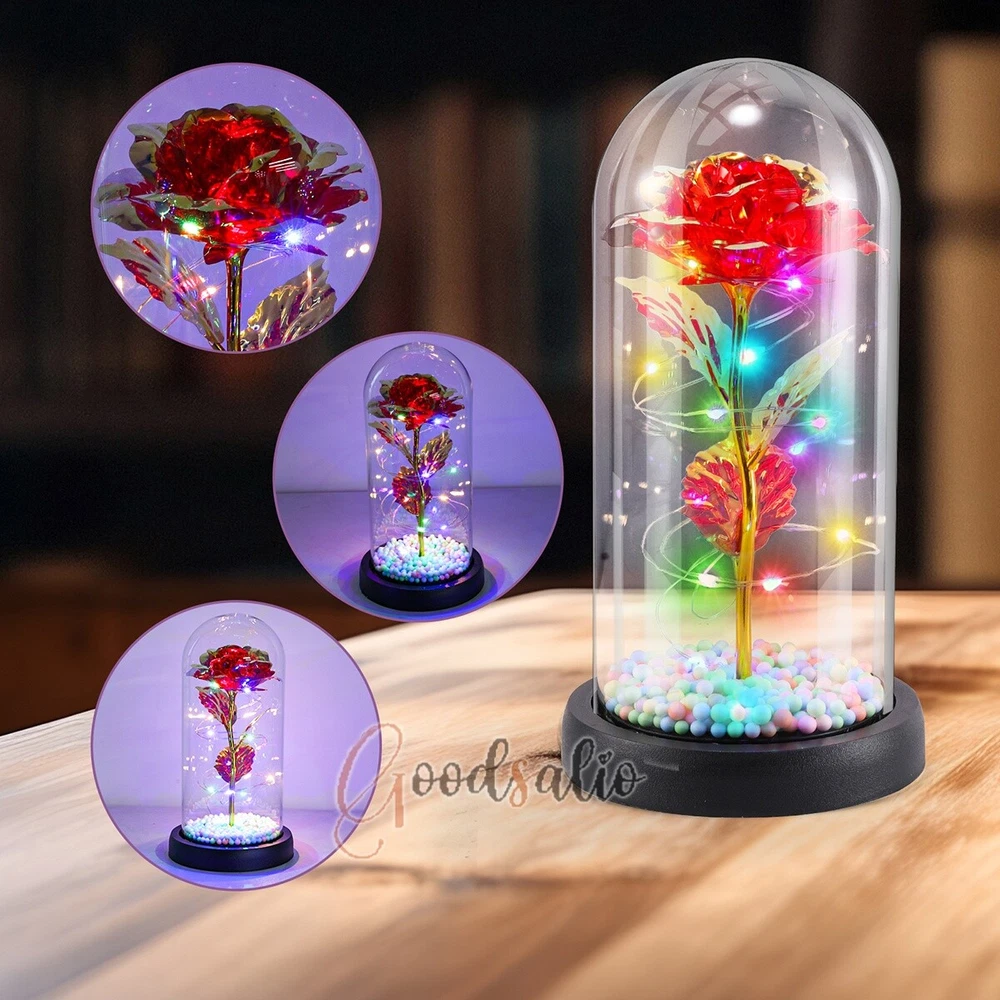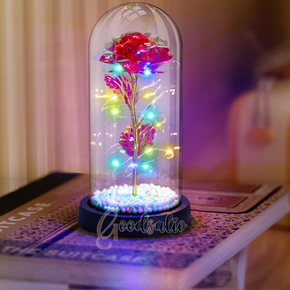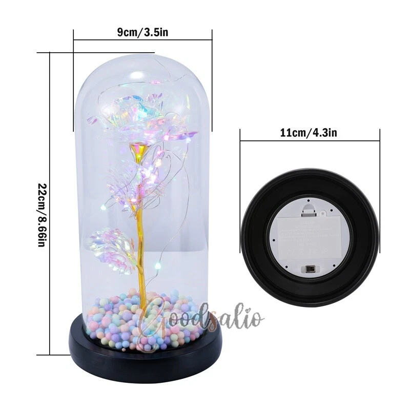 Rosa Roja En El Domo De Cristal luz LED con cubierta de vidrio Valentine's Day ★SPECIAL TIPS: √ Ship within 24 hours Via USPS from NJ ,USA √ 100% New & Excellent Quality √ Professional Customer Service √ Strictly QC, Each set was fully tested before shipping √ Offer delivery with Tracking Number If not 100% satisfied with our products, no-questions asked, we offer 30-day free return & money back. TypeA: Feature: -- Rose Flower: This colorful foil gold rose flower is made of high-quality plastic with a stable and smooth surface, the roses and petals displayed look very real, and it is also covered with a transparent dome that protects the rose flower and makes it timeless. -- LED Rose: The rose is wrapped around the colorful LED light strip, powered by 3 AAA batteries (not included). When turned on at night, it will light up with colorful constant lights, creating a romantic atmosphere for your home and bedroom at night. -- Romantic Symbol: The built-in kissing toy for little boys and girls is very cute. The rose will bring you infinite love and beauty. It not only symbolizes eternal love, but also a symbol of good wishes. -- Wide Application: Not only can be used as a decoration in the living room or bedroom, but also as a gift for relatives or lovers, very suitable for home decoration, holiday gifts, etc. Specification: Flower color: colorful/Red Light color: multicolor Material: plastic Lighting mode: always on LED lights: 20 pcs Battery type: 1.5V*AAA battery (not included) Usage: Suitable for home decoration, holiday gifts, etc. Product size: 21.5 (height)*11 (bottom diameter)*9 (thickness) cm/8.46*4.3*3.5inch Package includes: 1*Rose Flower Night Light 1*Packing Box Feature: -- Rose Flower: Made of high-quality plastic, which makes the rose and petals look very real, and also covered with a transparent dome, which can protect the rose flower and enjoy the beauty of the rose in 360°. -- Romantic Symbol: This is a beautiful LED light rose, which means enthusiasm and romance, not only eternal love, but also a symbol of good wishes. -- LED Roses: Roses wrapped around the LED light strip, powered by batteries, can be used for home decoration or create a romantic atmosphere during the day and night. -- Wide Application: Not only can be used as a living room or bedroom decoration, but also can be used as a gift for relatives or friends, very suitable for home decoration, holiday gifts, etc. Specification: Flower color: Red/Pink/Blue/Purple Light color: warm white Material: plastic Lighting mode: always on LED lights: 15pcs Uses: suitable for home decoration, holiday gifts, etc. Battery Type: 1.5V*AAA battery (not included) Product size: 20.5 (height) *11 (bottom diameter) *9cm/8.07*4.3*3.5inch Package includes: 1*Rose Flower Lamp 1*Packing Box Features: *Unique new design - Beauty and The Beast Rose Kit, was inspired by the movie "Beauty and the Beast" - a beautiful true love story. The tiny LED string lights are embedded in the petals, the warm white light illuminates the entire dome. *Durable,Safety and Heat-resistant Dome-Safety and light Dome cover allows LED light to shine more brilliantly in our high borosilicate heat-resistant glass than other covers, resists yellowing & discoloration. *Warm colored LED strings- LED string is made with a fine bendable copper wire that create any shape you want. *Charming decor for Indoor house,living room,bedroom,hotel,bars,to create romantic atmosphere. *Rose is the symbol of LOVE & BEAUTY,ROMANCE & PASSION,BEST WISHES,so it is the Ideal Gift for Valentine's Day, Mothers Day,Anniversary,Wedding, Engagement, Birthday. *Turn on the switch under the base,you will see the eternal beautiful flowers especially at night. *Lighting mode-Steady on Specifications: Materials: Glass Dome+ LED Lights + Silk Rose Rose Color:Red LED quantity:20LED Lighting color:Warm white Power source:3*AAA Batteries(not included) Dome diameter:9cm Base diameter:11cm thickness:2cm Overal height:22cm LED string lights length:100cm LEDs interval:5cm Package includes: Rose LED Lights*1(3*AAA Batteries not included) Features: 1.100% brand new and high quality! 2. Valentine's Day, Mother's Day, the best gift for Christmas. 3. Rose has always been a symbol of beauty, love and appreciation. 4. 99% gold foil leaves, peduncle with polyethylene 24K gold plating. 5. Gift package, well and safe. 6. A perfect gift for your spouse wife girlfriend to show your sincere love. A best gift for your mom to say" Thank you" and "You're loved always." Great gifts for anniversary, birthday, Christmas, Valentine's Day, Mother's Day, wedding. Specification: Weight:8.94g Note: Due to different lighting and shooting conditions, the color of the image may differ from the actual product. Please refer to the actual product. Package include: 1*rose 1*box 1*love base Feature -- Decorative Gift: This rose flower lamp is a romantic gift for your girlfriend on Valentine's Day or birthday, and can also be used as a room or bedroom decoration. -- High-quality Materials: The base of the glass cover adopts a wood grain base, which is durable, not easy to damage, with complex texture, stable and smooth surface, and no burrs. -- Transparent Glass: The glass cover of the rose lamp is made of transparent glass, which allows you to enjoy the beauty of the roses at 360 degrees. It is delicate and romantic, and is also easy to display and store. -- Roses and Butterflies: Roses are designed with simulation. Roses and butterflies in the rose lamp bloom in the glass cover, never fade and representing eternal love. Specifications: Color: Colorful platinum/Blue/Red Material: Plastic + Glass Cover Light color: Warm Color Lighting mode: always on Battery: 3 AAA batteries (not included) Uses: decoration, birthday gifts, holiday gifts Product size: 22.5*11*9cm/8.86*4.33*3.54inch Package includes: 1*Rose Light 1*String Lights 1*Gift Box Feature: -- Rose Flower: This colorful foil gold rose flower is made of high-quality p
