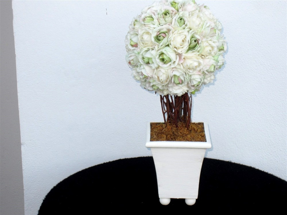Rose Flower Topiary Tree in Wooden Planter Home Decor Colors: Off White, green and Pink Faux Silk Roses Tree is in a Wooden Planter Measures: 15 1/2 inches High 8 1/2 inches Wide This is a very unique Tabletop Topiary Tree Goes with so many colors In Very good condition Please see Photos for more Description COMES FROM A SMOKE FREE HOME Any questions please feel free to ask me. Thanks for looking COME AND SEE MY other items Powered by SixBit's eCommerce Solution