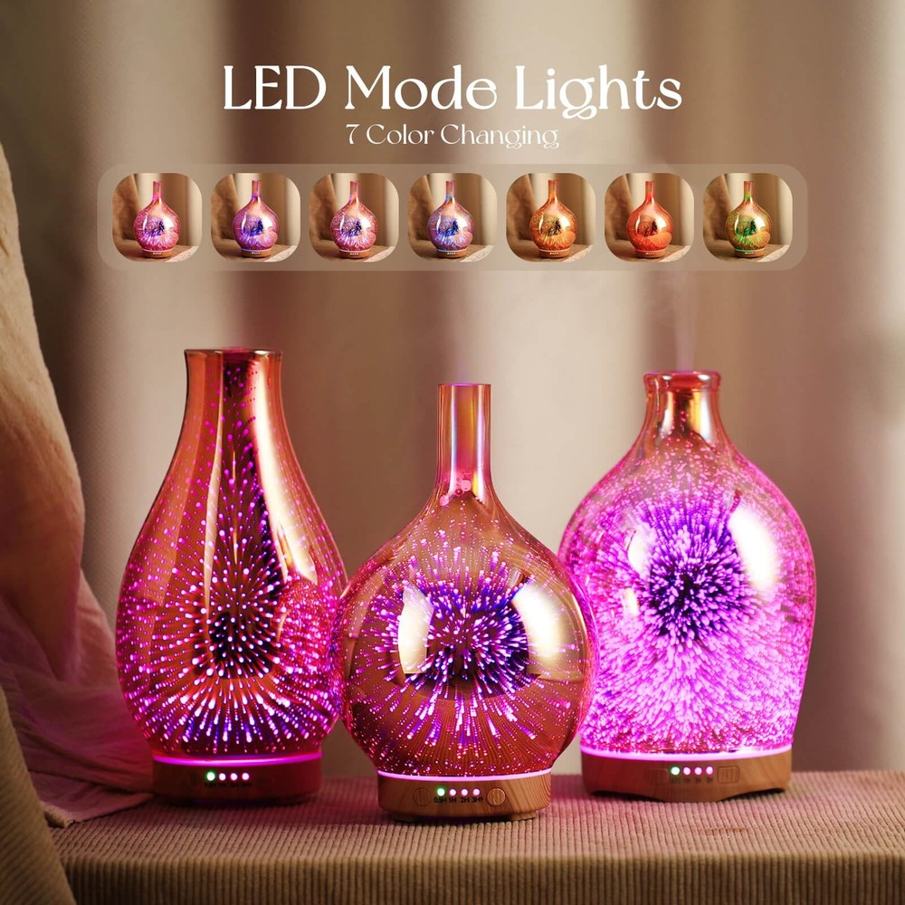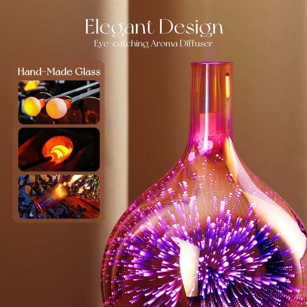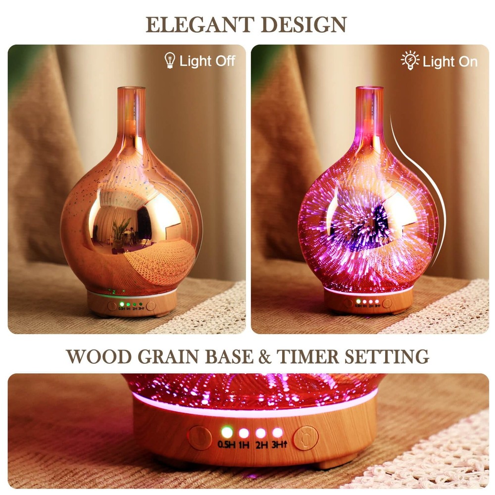 Product Description: Our essential oil diffuser is an elegant ornament at home, bedroom, living room, children's room, study room, office, and yoga room. Ultrasonic Aroma Diffuser Benefits: moisturize skin, refresh indoor air, therapeutic benefits, relieve tiredness, get better sleep.Specification: Main material: 3D glass cover, BPA-free plastic base.Product Size: 6” x 9”.Product Weight: 1.7 lb.Capacity: 150ml.150ml 3D Glass Diffuser Mist Mode: Continuous mist mode and time setting (0.5 H, 1 H, 2 H, 3H, more than 3H continuous misting mode) 150ml Essential Oil Diffusers Runtime: 6H. 3D Firework Effect Oil Diffuser Light Mode: Select the gradual light mode: when you turn on the diffuser, the light is default gradual. Then, press the "light" button, you can choose the fixed lights(seven colors optional). Input: 100-240V 24Hz. Standard: US Plug. Aromatherapy Diffuser Safe Waterless Auto-off Design: prevents it from overheating when runs out of water, which assures safety for you and your family. Perfect to set and go to sleep without worry. Package Includes: 150ml 3D glass essential oil diffuser, a DC power adapter, and an instruction. Notes & Tips: 1. Do not invert the base when residual water or moisture.2.Please add water below Max line, otherwise will cause a small mist or no mist outlet.3.Make sure the lid(cover) is properly in place to prevent water leakage.4. Need regular cleaning of the white round atomizer with a soft cloth (at the bottom of the water tank)5.Please pour out the rest water and let the water tank clear and dry when you are not using it. 6.Please read the instructions carefully before use. HANDMADE GLASS DIFFUSER - Our 150ml aroma diffusers are 5.5'' in diameter and 9.5'' in height. They are handblown glass so that each glass globe is unique. 150ml essential oil diffuser lasts for 6 hours and has a good output of mist. Fits a room not larger than 15*15(ft). You can place in any area and relax. UNIQUE ART DECORATIVE DESIGN - Our 150ml glass essential oil diffuser has a firework 3D effect glass cover and wood grain decorative base. It is very suitable for your bedroom, living room, children's room, study room, office, and yoga room. AMAZING AND CHARMING LIGHT - The LED lights can be set to 7 different soothing and mesmerizing colors. Press the “LIGHT” button to adjust the light color you prefer (fix/change color). In addition, you can use the mist and light modes individually or together. ULTRASONIC HUMIDIFIER - This Essential Oil Humidifier is using a special craft and upgraded ultrasonic technology. You can add essential oils as an aromatherapy diffuser. It can release nano-scale cold mist which ensures that the quality and effectiveness of the essential oils remain optimal. MIST MODES - This 150ml capacity oil diffuser comes with continuous spray modes which can run around 6 hours. HIGH QUALITY AND SAFETY - BPA-free material with hand-blown glass globe. After you drop several essential oils that will release cool mist to fill everywhere. WATERLESS AUTO-OFF - As a safe waterless auto-off design that prevents it from overheating when runs out of water, which assures safety for you and your family. Perfect to set and go to sleep without worry. EASY TO USE - The 150ml glass diffuser comes with a 150ml essential oil diffuser, a DC power adapter, and an instruction. It is very easy to use and clean. CREATIVE AND PRACTICAL GIFT IDEA - Our 150ml large capacity diffuser is a wonderful gift choice for birthdays, anniversaries, mother's day, Valentine’s Day, weddings, graduation, Thanksgiving, Christmas to families, friends, teachers, lovers, and colleagues. 100% SATISFACTION GUARANTEE - We have great faith in our glass essential oil diffusers. We offer a 12-month warranty and lifetime technical support for our diffusers. Your satisfaction is our first goal!