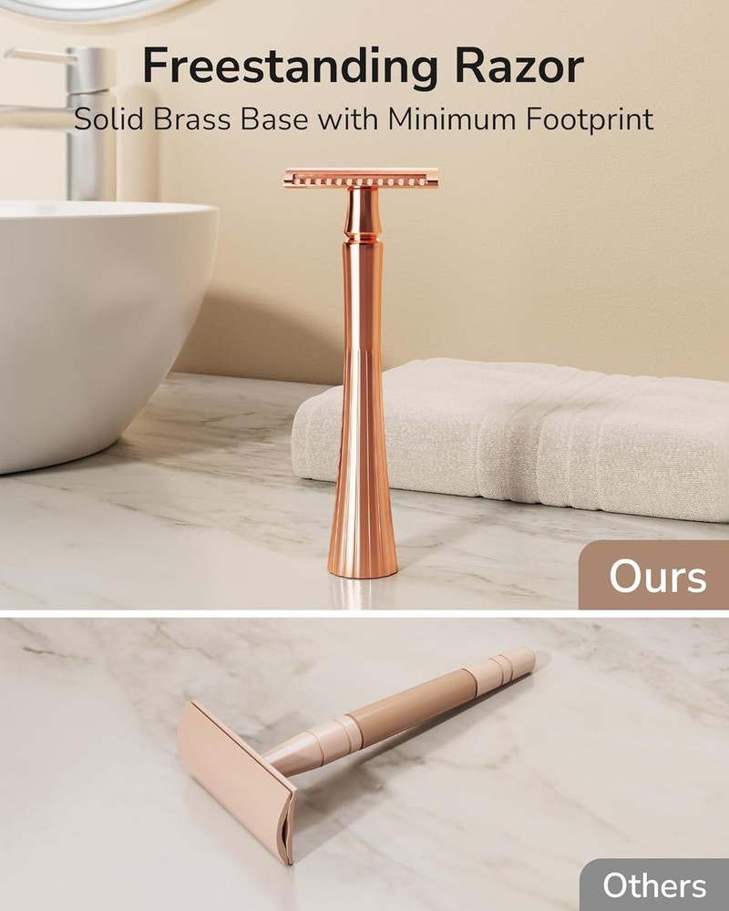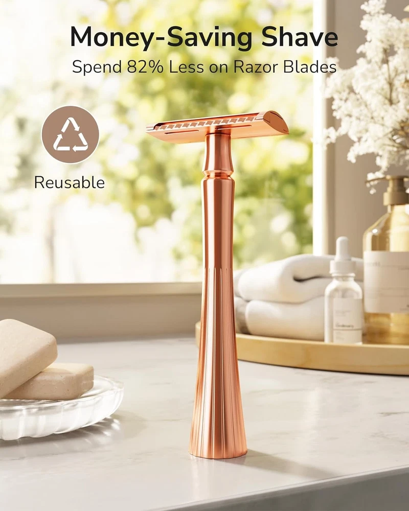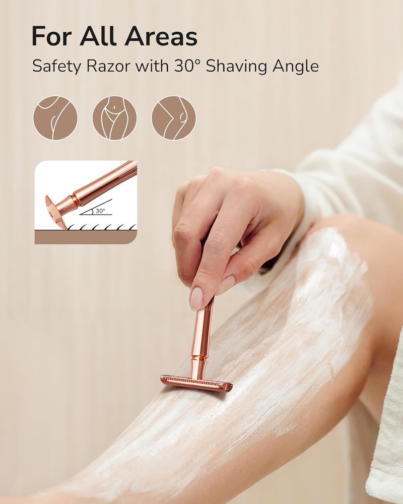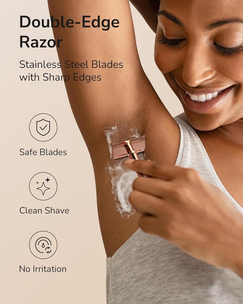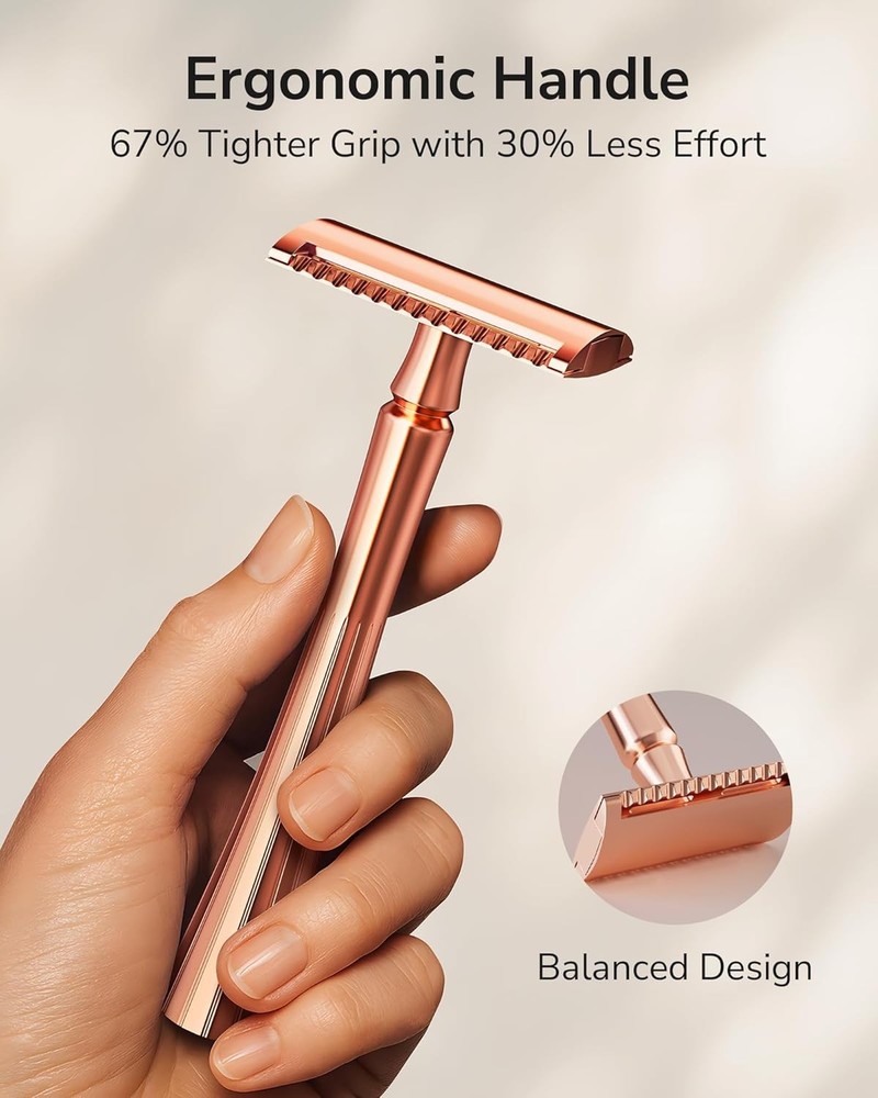 Double Edge Safety Razor, Single Blade Razors for Rose Gold Razor Product Details Package Dimensions : 5.67 x 2.32 x 1.26 inches; 4.16 ounces Manufacturer : ULG Country of Origin : China Brand: ULG Number of Blades: 5 Unit Count: 1.0 Count Special Feature: Double Edge, Non-Slip, Reusable, Travel Size, Washable Skin Type: Oily, Combination, Sensitive, Dry, Normal PRECISION SHAVING FOR ALL AREAS: Designed for a smooth, irritation-free shave, the ULG double-edge razor uses sharp stainless steel blades and a 30° shaving angle, ideal for face, legs, underarms, and bikini lines. It glides gently for a close, clean result every time. ELEGANT & ERGONOMIC DESIGN: Crafted with a sleek, rose gold finish, the balanced non-slip handle offers 67% tighter grip and 30% less effort while shaving. Its weight and shape help increase maneuverability, giving you better control and comfort for daily shaving. SAFE & SKIN-FRIENDLY RAZOR: Say goodbye to dull, unsafe disposable razors. ULG’s safety razor is ultra sharp for all body hairs, perfect for sensitive skin. The stainless steel blades cut cleanly to prevent nicks, bumps, and razor burn, reducing the threat of ingrown hairs. COMPACT & FREESTANDING BASE: The solid brass base lets this razor stand upright, saving space and keeping your razor clean. Unlike others that lay down and expose the blades to wet counter, this freestanding razor awaits your grab and use in the bathroom or on the go. COST-EFFECTIVE REFILLABLE RAZOR: Each razor comes with 5 double-edge razor blades, and they are easy to find replacements. You'll spend up to 82% less on blades compared to disposable razors. It's a smart, money-saving switch that increases shaving performance and saves the environment.