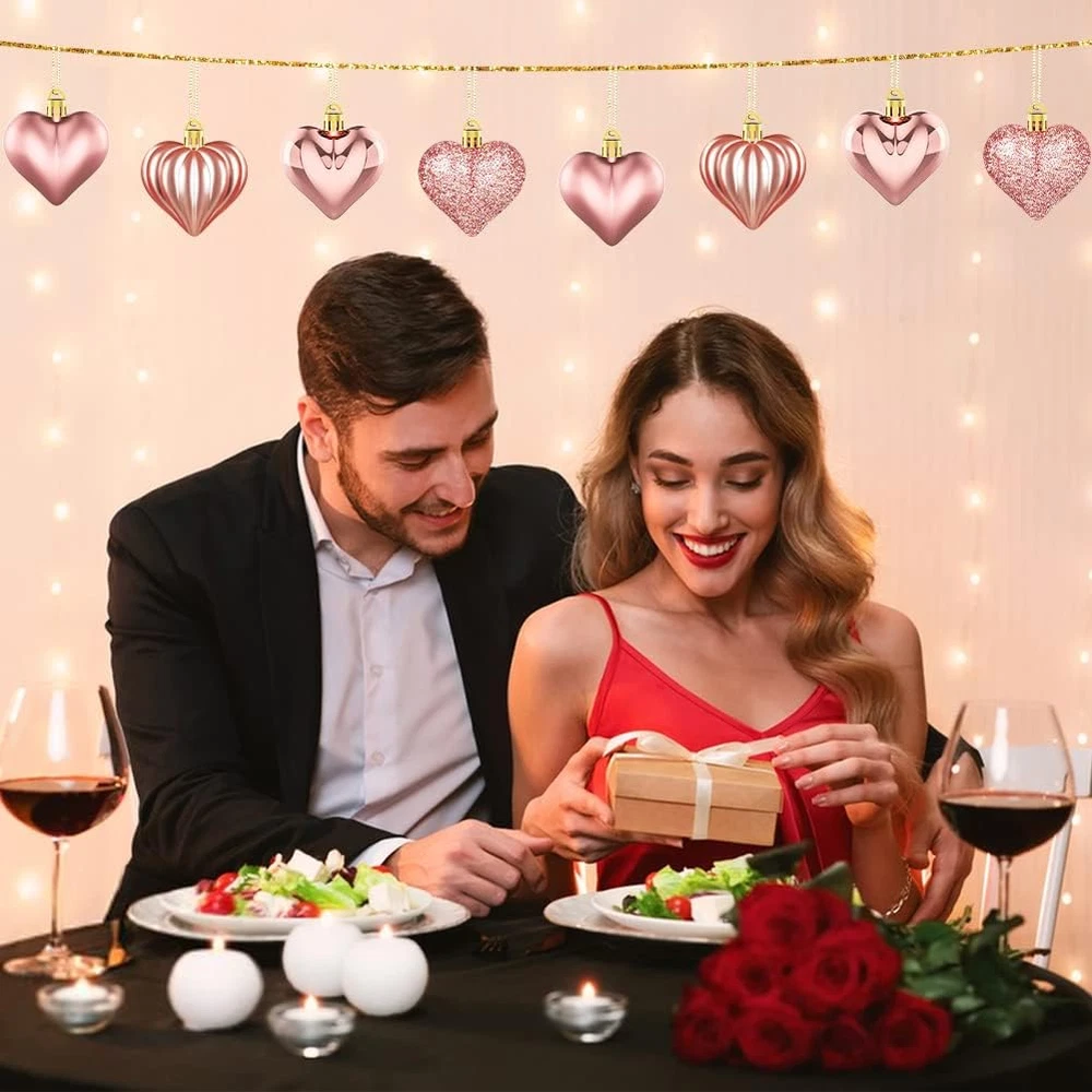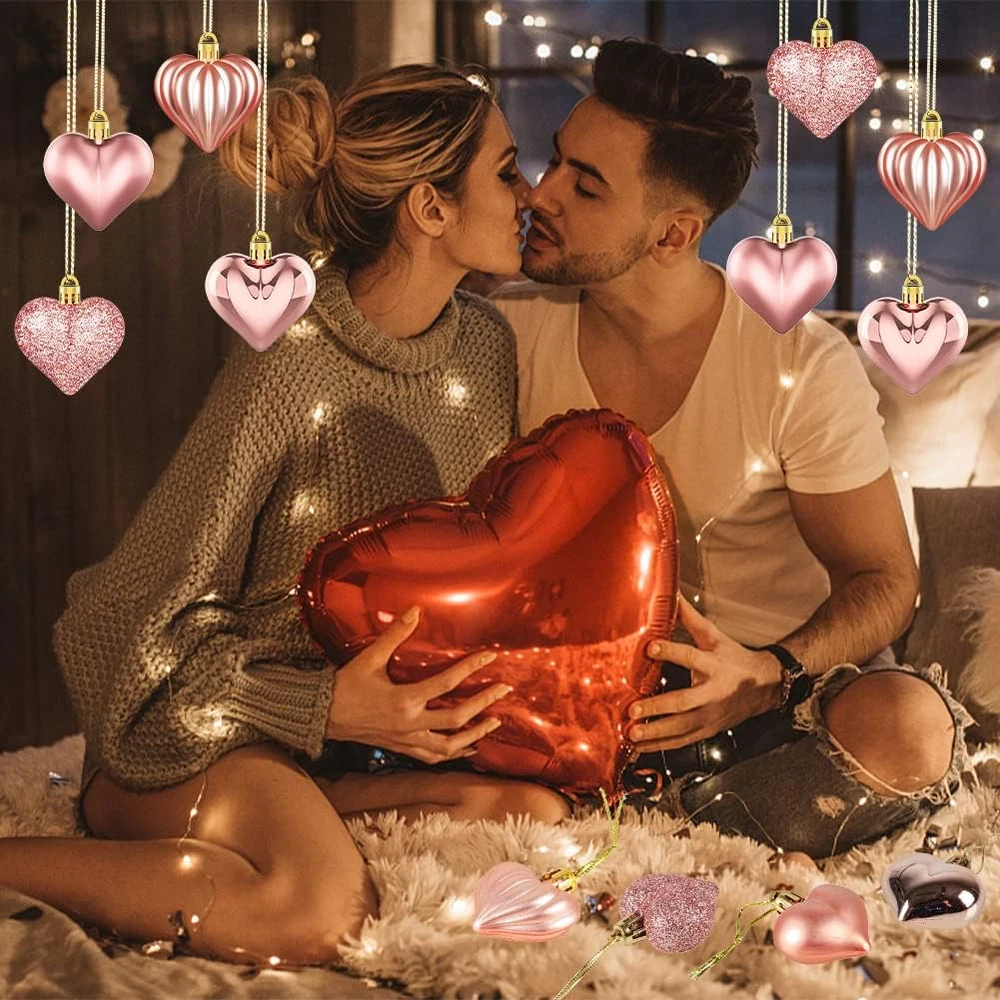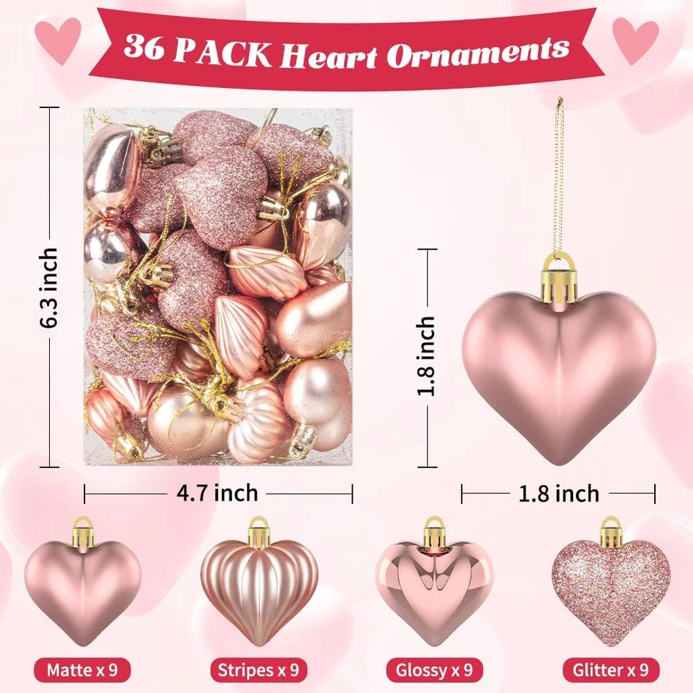 【Romantic Valentine's Day Heart Ornaments】Our Valentine's day heart baubles kit comes with 36 pieces of heart-shaped baubles Valentines ornaments,and these heart shaped baubles come with glossy, matte, glitter and striped surfaces, in a total of 4 different styles. Enough quantity in assorted styles which is perfectly add more romantic and sweet atmosphere on valentine's day 【Ideal Valentine's Day decorations】The Valentine's Day Heart Shaped Ornaments are designed with heart shaped, they are very vivid and delicate in appearance that will make your home decorations more eye-catching. These Valentines heart shape baubles are ideal decorations for Valentine's day that can create a warm and romantic atmosphere for your loved one 【Premium Quality Material】These Valentines day decor are made of high-quality plastic material, not easy to fade and not easy to break, sturdy and durable. Each heart ornaments for Valentine tree measures about 4.5cm/1.8inch, right in size. The Valentine's baubles can be used for a long time 【Easy to hang】Each piece of Valentine's day heart decorations has a golden threads on the top, which is convenient to hang and not easy to fall off. They will add the decorative effect for your home, Christmas tree, branches, wine bottles, windows and door handles,table or other place you like. Add more sweet touch in your home decor 【Widely Application】These Valentines day hanging decorations are perfect for Valentine's day decoration, anniversary, weddings, engagement and most occasions. You can hung on the love tree, or added to wine bottles to add luster to Valentine's Day, your lover, girl friend or wife are very enjoy the delicate decorations Product Description