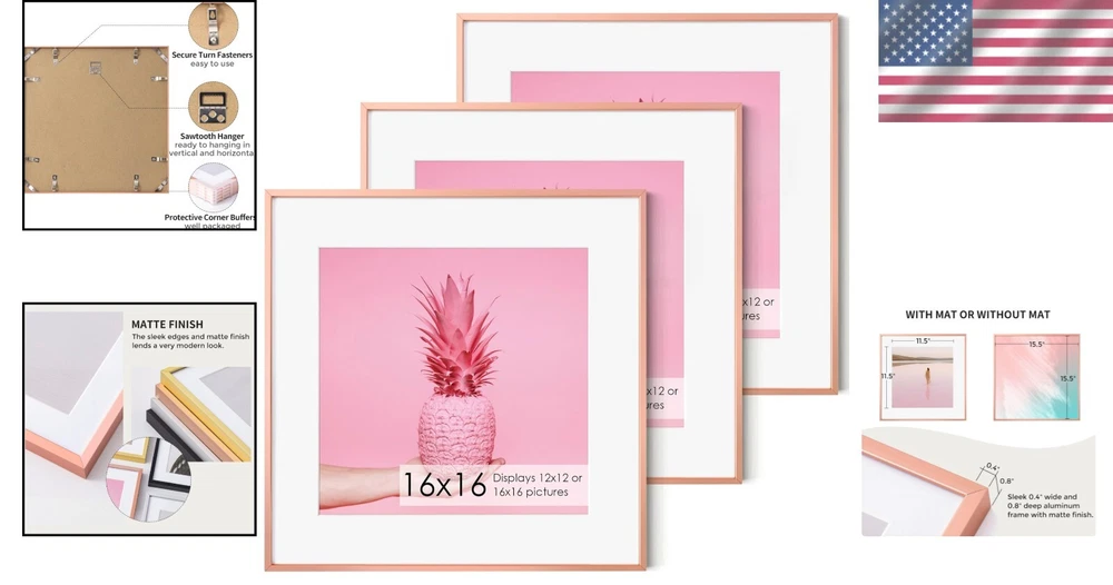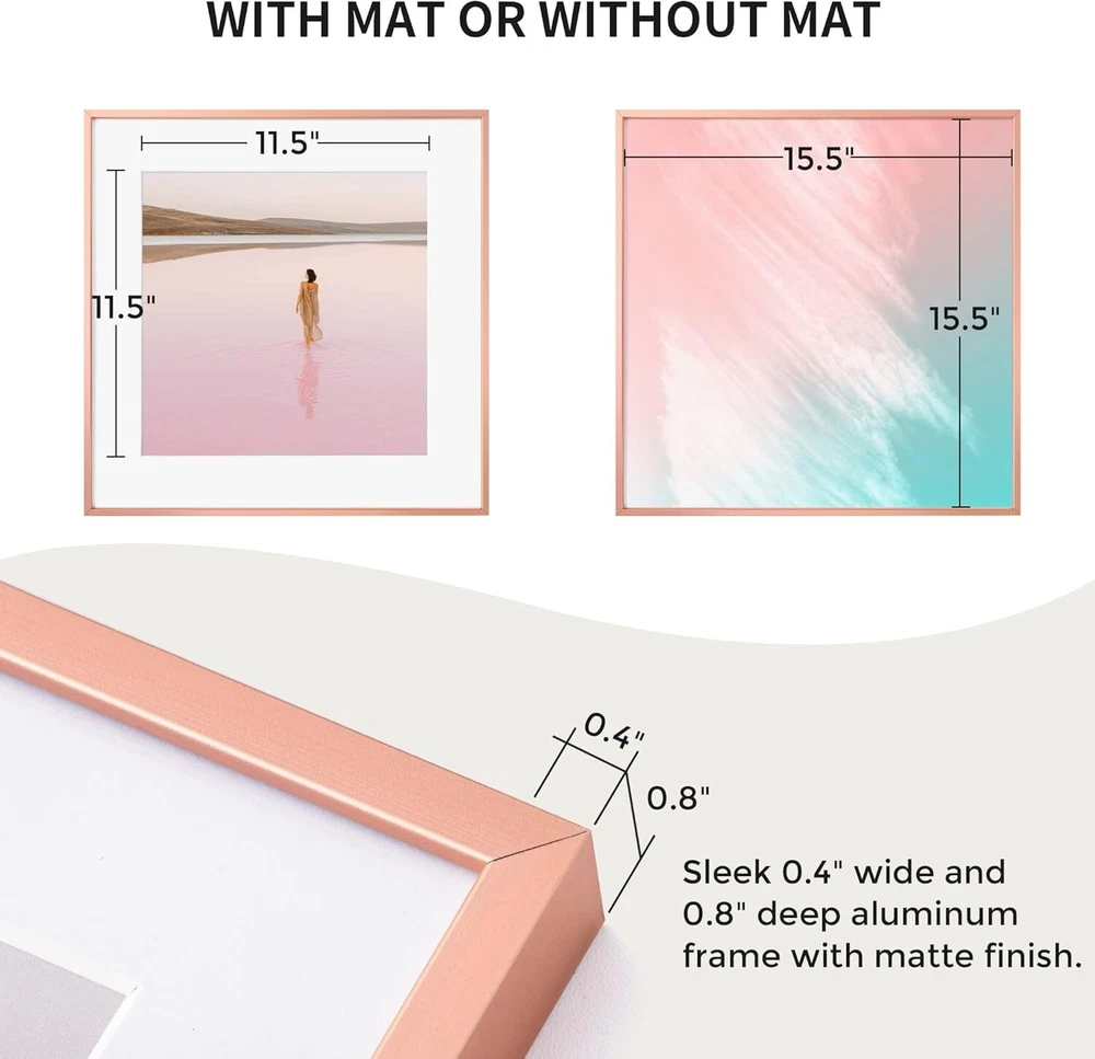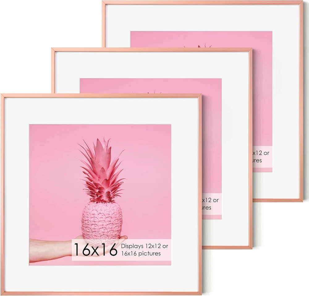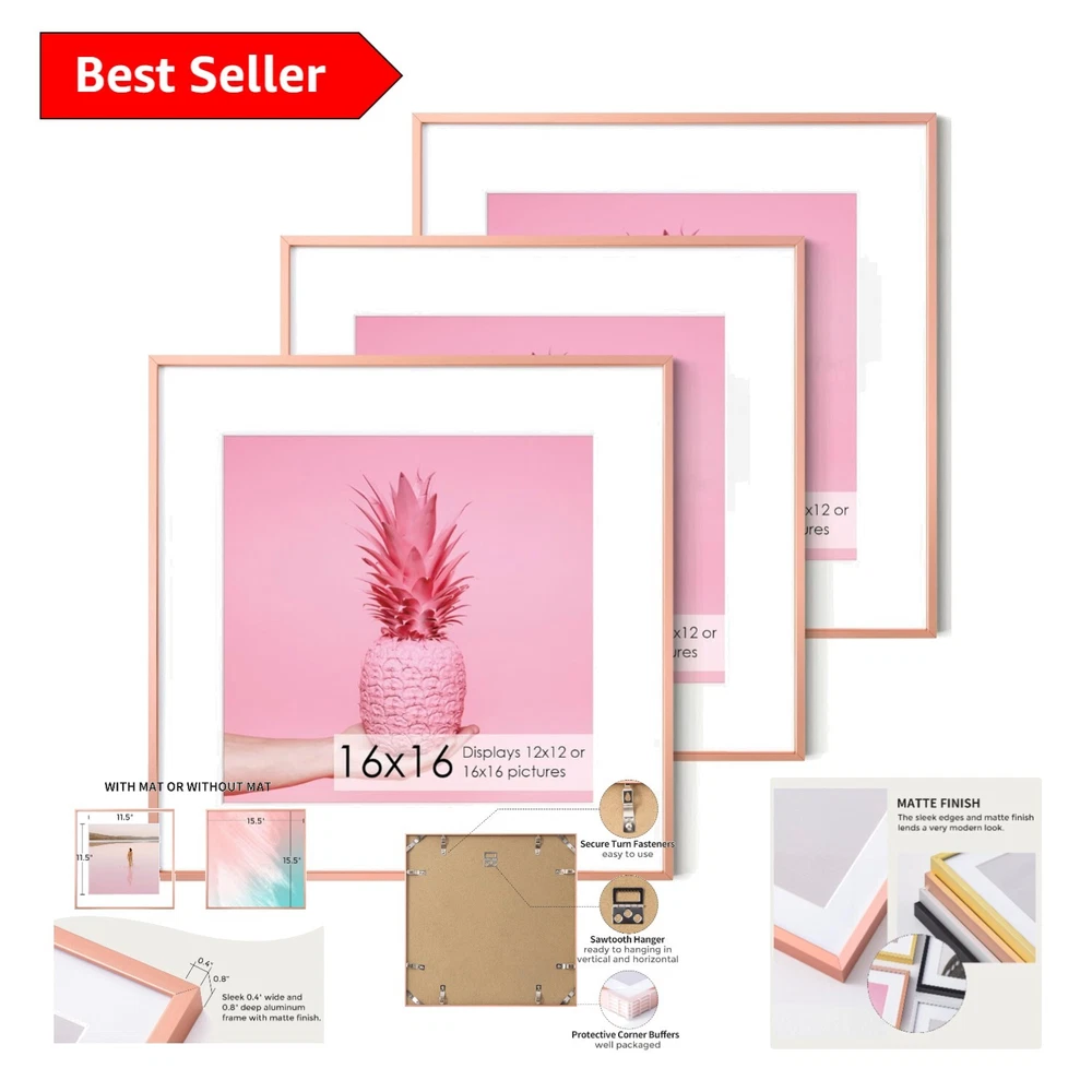 Rose Gold Metal Picture Frame 16x16 with 12x12 Mat - Set of 3 Elegant Displays