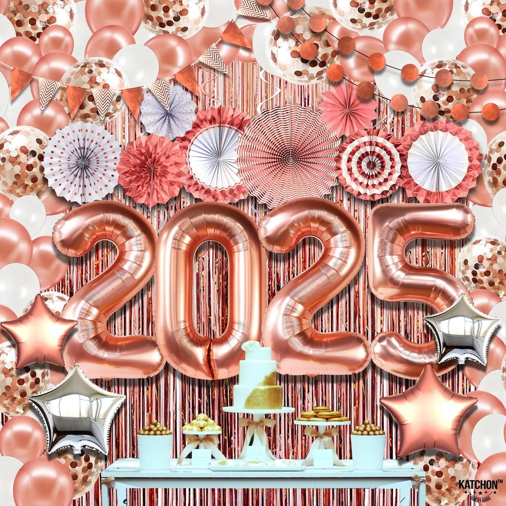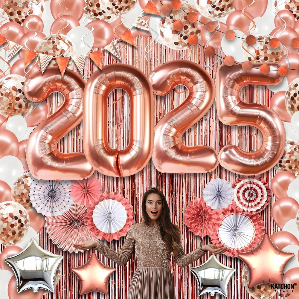 HUGE PACK OF 149 | ALL IN ROSE GOLD 2025 ARCH SET - Save your time with our this rose gold new years decorations 2025 that is a complete package that includes everything from 2025 balloons numbers to foil fringes. This happy new year decorations 2025 rose gold will be unique factor to your new year decorations. This huge 2025 rose gold balloons numbers set are best for new years decorations, senior night decorations 2025 or even for graduation decorations 2025. GIANT 40 INCH : 2025 BALLOON WITH ROSE GOLD FRINGE AND ASSORTED PAPER FANS - This 2025 new years eve party supplies rose gold set includes all from 40-inch rose gold 2025 balloons, rose gold fringe curtain (pack of 3), 8 assorted paper fans, rose gold/white/confetti balloons (pack of 110), 4 silver/rose gold star balloons, 12 silver, and rose gold swirls, 2 garlands (6.5ft), Plus, other supporting accessories like balloon strip, glue dots etc. DECORATE WITH 40 INCH 2025 BALLOON NUMBER - Elevate your nye decorations 2025 rose gold kit with mesmerizing huge 40 inch 2025 Balloon Backdrop set. Dive into the joy of new year with premium new years eve party supplies 2025 and a captivating rose gold streamer backdrop. Make every moment shine with our curated decoracion de año nuevo 2025 which includes rose gold star balloon, paper fans, shinny swirls, latex and confetti balloons etc. HELIUM SUPPORTED | HIGH QUALITY | REUSABLE - Unleash the with our exceptional new years eve party supplies 2025 pink. Crafted for durability and elegance, our high-quality and sturdy new years balloons 2025 set, includes a dazzling rose gold streamers and a reusable huge nye balloons 2025 garland kit that are helium supported. Make a memorable rose gold new year decorations 2025. Let the countdown begin in style with our new years decorations 2025 balloons. ON-DEMAND SOCIAL BACKDROP PARTY – Create a bright New year 2025 decorations. This stunning rose gold new years decorations 2025 balloons set will surely get the attention of everybody in your rosegold party decoration. You can also use this new years decorations 2025 backdrop for next year new year decorations, graduation decorations 2025, senior night decorations, prom decorations and it will create an unforgettable night of your life. Powered by BRND.ME.