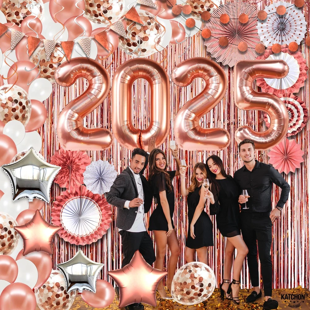 HUGE PACK OF 149 | ALL IN ROSE GOLD 2025 ARCH SET - Save your time with our this rose gold new years decorations 2025 that is a complete package that includes everything from 2025 balloons numbers to foil fringes. This happy new year decorations 2025 rose gold will be unique factor to your new year decorations. This huge 2025 rose gold balloons numbers set are best for new years decorations, senior night decorations 2025 or even for graduation decorations 2025. GIANT 40 INCH : 2025 BALLOON WITH ROSE GOLD FRINGE AND ASSORTED PAPER FANS - This 2025 new years eve party supplies rose gold set includes all from 40-inch rose gold 2025 balloons, rose gold fringe curtain (pack of 3), 8 assorted paper fans, rose gold/white/confetti balloons (pack of 110), 4 silver/rose gold star balloons, 12 silver, and rose gold swirls, 2 garlands (6.5ft), Plus, other supporting accessories like balloon strip, glue dots etc. DECORATE WITH 40 INCH 2025 BALLOON NUMBER - Elevate your nye decorations 2025 rose gold kit with mesmerizing huge 40 inch 2025 Balloon Backdrop set. Dive into the joy of new year with premium new years eve party supplies 2025 and a captivating rose gold streamer backdrop. Make every moment shine with our curated decoracion de año nuevo 2025 which includes rose gold star balloon, paper fans, shinny swirls, latex and confetti balloons etc. HELIUM SUPPORTED | HIGH QUALITY | REUSABLE - Unleash the with our exceptional new years eve party supplies 2025 pink. Crafted for durability and elegance, our high-quality and sturdy new years balloons 2025 set, includes a dazzling rose gold streamers and a reusable huge nye balloons 2025 garland kit that are helium supported. Make a memorable rose gold new year decorations 2025. Let the countdown begin in style with our new years decorations 2025 balloons. ON-DEMAND SOCIAL BACKDROP PARTY – Create a bright New year 2025 decorations. This stunning rose gold new years decorations 2025 balloons set will surely get the attention of everybody in your rosegold party decoration. You can also use this new years decorations 2025 backdrop for next year new year decorations, graduation decorations 2025, senior night decorations, prom decorations and it will create an unforgettable night of your life.