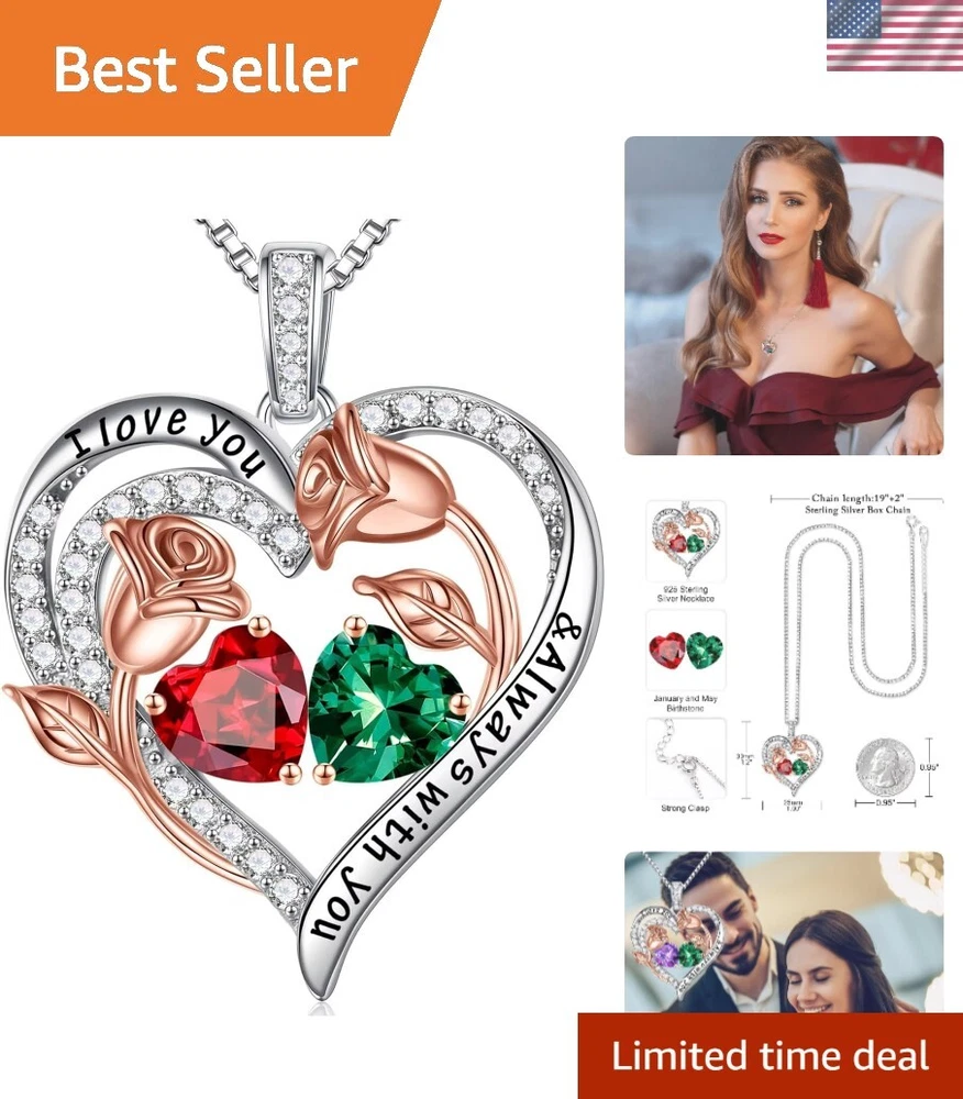 Rose Heart Necklaces for Women - 925 Sterling Silver Rose Heart Birthstone Necklace Birthday Gifts for Women Anniversary Christmas Jewelry Gifts for Her Wife Mom Daughter ALL RIGHTS RESERVED, PLEASE DO NOT COPY. (版权所有,请勿抄袭) GIFTS FOR WOMEN: Our double birthstone pendants are available in 78 styles. You can give your wife, mom, daughter, aunt, sister or grandma a big surprise on Mother's Day, Birthday, Christmas, Valentine's Day or other special occasions. Our elaborate double birthstone pendant, one representing your birth and one representing hers. When she wear this heart necklace, she will genuinely happy for this. MATERIALS: The box chain and double heart pendant are both made of 925 Sterling Silver. High quality platinum plating stuff that will not turn your skin to green, red or itchy. The box chain is strong enough and will not break. SIZE: 19 inches + 2 inches (Adjustable) Chain. This length works on practically anyone. Our rose flower necklace highlight understated elegance and refined femininity. The double heart pendant is bigger than normal, it's an excellent gift choice for women daily wearing home or office. MEANING: The heart pendant engraved with the words "I love you & Always with you" symbolizes your forever love for the special women in your life. Of course, you can also customize a necklace for your parents and grandparents, choose their respective of the birthstones, as a record of their love between them, your family will love this special gift. Comes with a beautiful PU jewelry box. AFTER SALES SERVICE: Any question about your Rose Heart Birthstone Necklace, please contact me and we will answer your question within 24 hours and give you a satisfactory answer. Product details Material Sterling Silver Metal type Sterling Silver Clasp type Spring Ring Chain type Box Gem type Created Emerald Item type name Pendant Necklaces About this item ALL RIGHTS RESERVED, PLEASE DO NOT COPY. (版权所有,请勿抄袭) GIFTS FOR WOMEN: Our double birthstone pendants are available in 78 styles. You can give your wife, mom, daughter, aunt, sister or grandma a big surprise on Mother's Day, Birthday, Christmas, Valentine's Day or other special occasions. Our elaborate double birthstone pendant, one representing your birth and one representing hers. When she wear this heart necklace, she will genuinely happy for this. MATERIALS: The box chain and double heart pendant are both made of 925 Sterling Silver. High quality platinum plating stuff that will not turn your skin to green, red or itchy. The box chain is strong enough and will not break. SIZE: 19 inches + 2 inches (Adjustable) Chain. This length works on practically anyone. Our rose flower necklace highlight understated elegance and refined femininity. The double heart pendant is bigger than normal, it's an excellent gift choice for women daily wearing home or office. MEANING: The heart pendant engraved with the words "I love you & Always with you" symbolizes your forever love for the special women in your life. Of course, you can also customize a necklace for your parents and grandparents, choose their respective of the birthstones, as a record of their love between them, your family will love this special gift. Comes with a beautiful PU jewelry box. AFTER SALES SERVICE: Any question about your Rose Heart Birthstone Necklace, please contact me and we will answer your question within 24 hours and give you a satisfactory answer. See more About this item