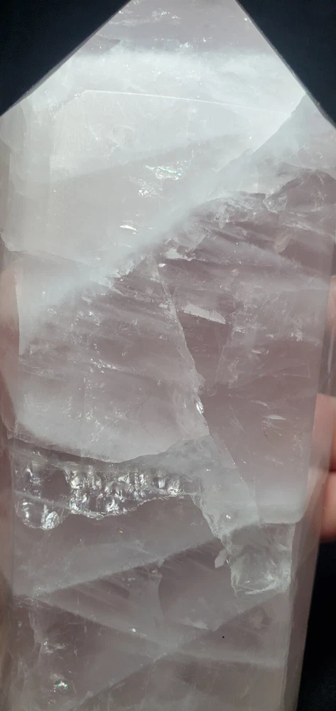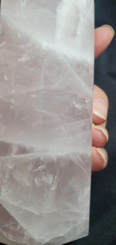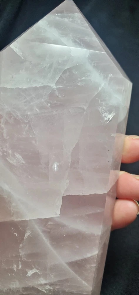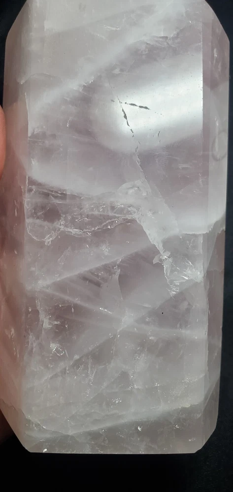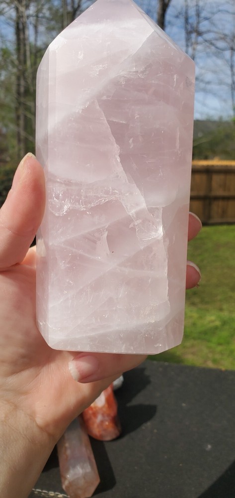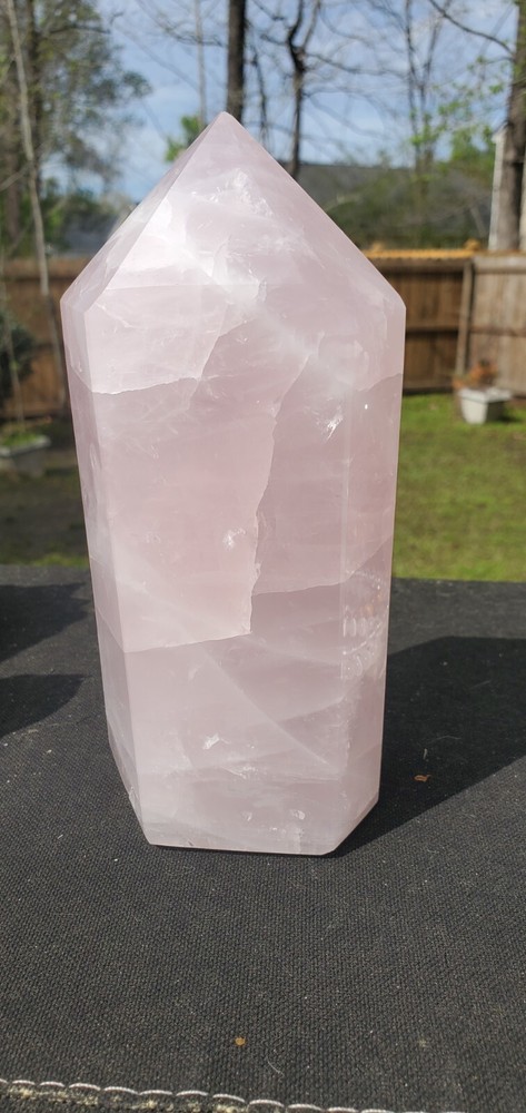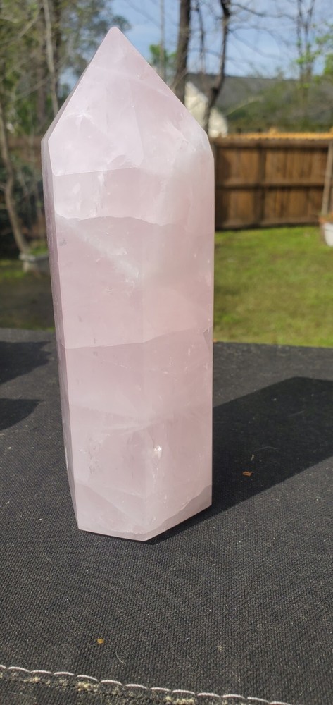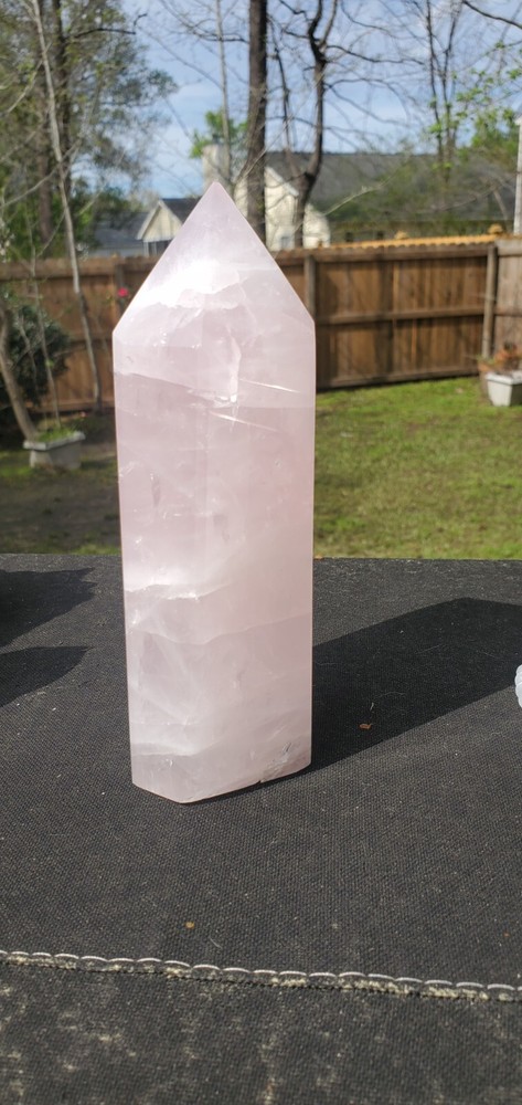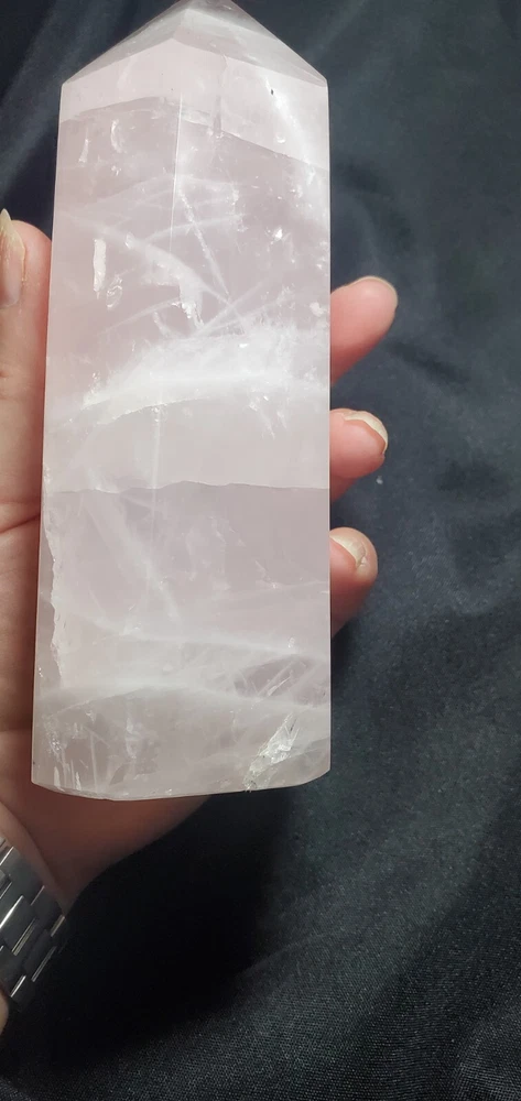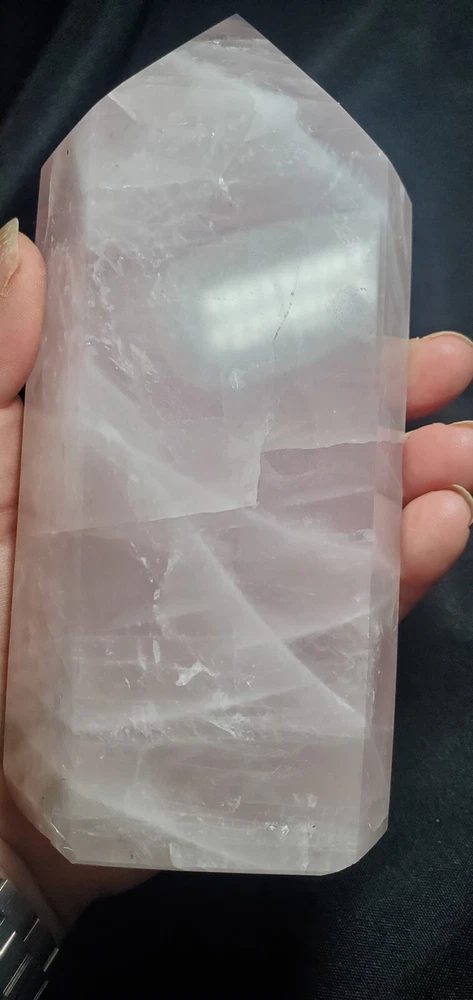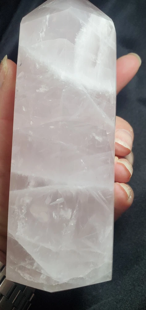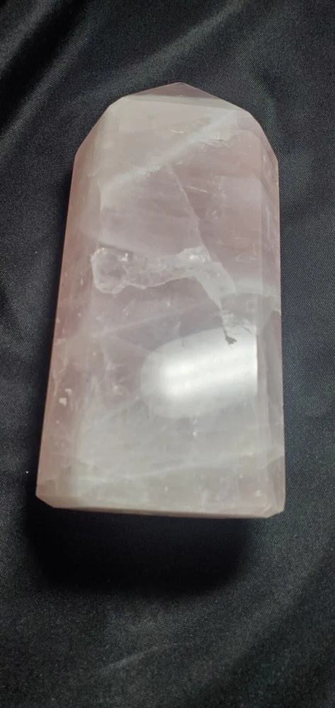 This Rose Quartz Crystal Polished Tower weighs 1085 grams and measures 6 1/4 x 3 inches. The crystal has a natural point shape and a beautiful pink color that corresponds to the Heart chakra. It has been polished to enhance its natural beauty. Please refer to the description for the size, as guessing it by the photos may be inaccurate. This item is sold by a US based seller and was manufactured in the United States. It is a great addition to any crystal collection and can be used for meditation, healing, or simply as a decorative piece.