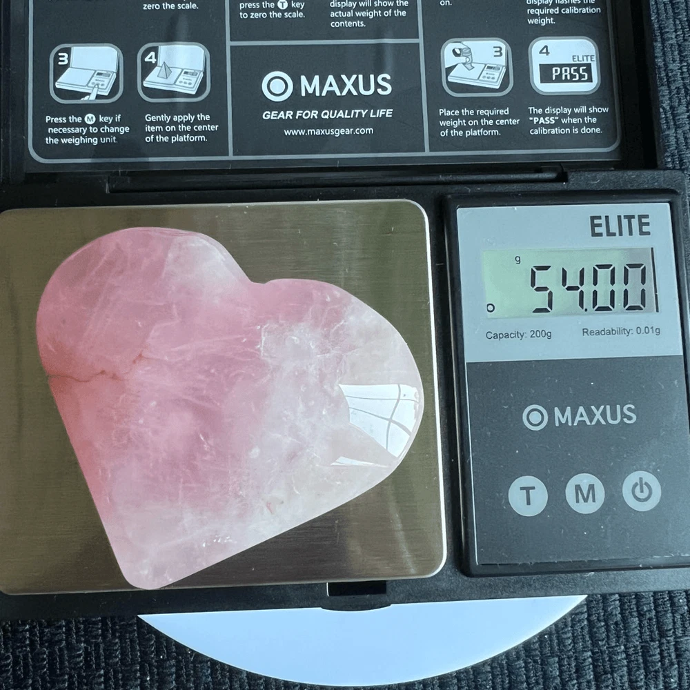 Rose Quartz Heart Carving Meditation Healing Stone (#1) A rose quartz heart carving is a delicate gemstone sculpture, intricately crafted from the soothing pink-hued mineral, rose quartz. Its smooth surface and heart shape symbolize love and compassion. Rose quartz is renowned for its emotional healing properties, fostering self-love, harmony, and deepening relationships. Believed to enhance empathy and promote feelings of peace, this gentle crystal is cherished for its calming energy and ability to open the heart chakra, encouraging unconditional love and emotional healing in its beholder. Approximate Measurements 54.0 grams 1.80” x 2.4” x 0.77” Please note natural stones are one of a kind and tend to have imperfections. Certian Lighting may alter the crystal’s color display in photos. Smoke Free | Pet Free Environment
