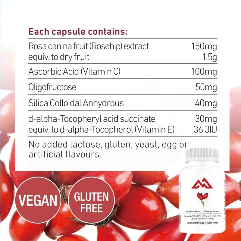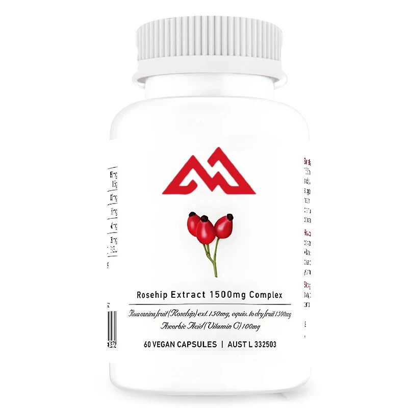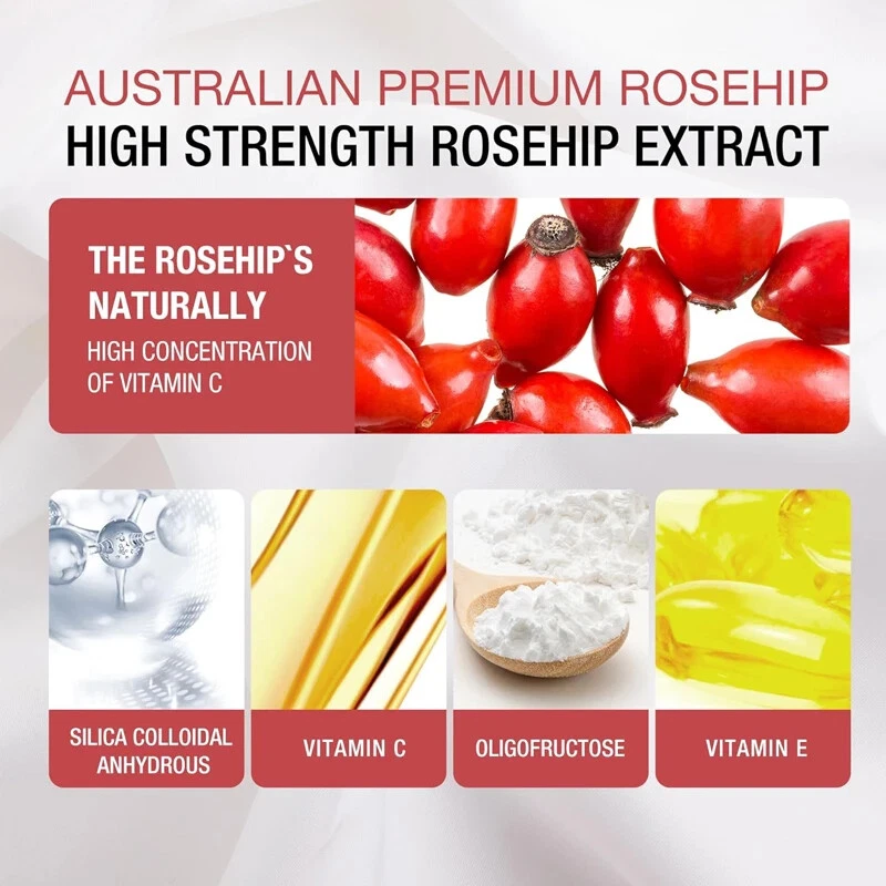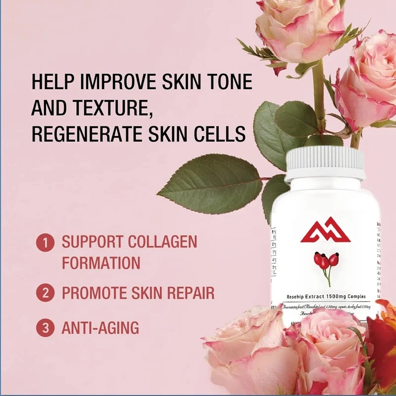 Improving skin, hair, and nails: High vitamin C content can promote the production of collagen and elastin, resulting in smoother and more uniform skin tone. Vitamin E keeps the skin hydrated, soft, and elastic, making the complexion youthful. Silicon dioxide is a key component of collagen and also delivers important nutrients to surrounding tissues of the body, such as the skin, hair, and nails, giving them strength and vitality. Reduce signs of damage: The vitamins C, E, and silica in the rosehip extract complex stimulate connective tissue and aid in wound healing. Rose fruit has a much higher antioxidant content than cranberries, blueberries, and other fruits. The powerful antioxidants in rose fruit can also prevent skin damage, such as spots and pigmentation caused by environmental factors. Through this method, rosehip extract can help the skin maintain its natural color tone. Tightening, radiant, and skin protective: The addition of silica is a key feature of this powerful formula, designed to provide optimal skin support. One of the largest components of collagen is silica, so the stress and tension of daily life can cause harm to us. Silica helps rebuild and regenerate collagen, making skin softer and younger. Suggested intake: Take 1-2 capsules per day or follow the instructions of a healthcare professional.