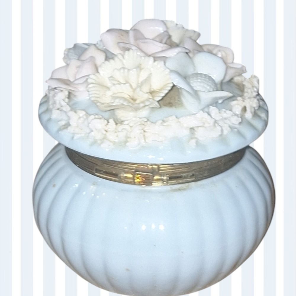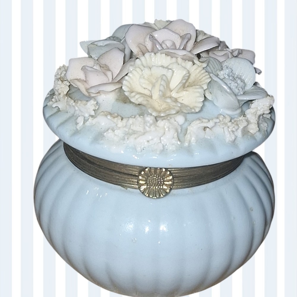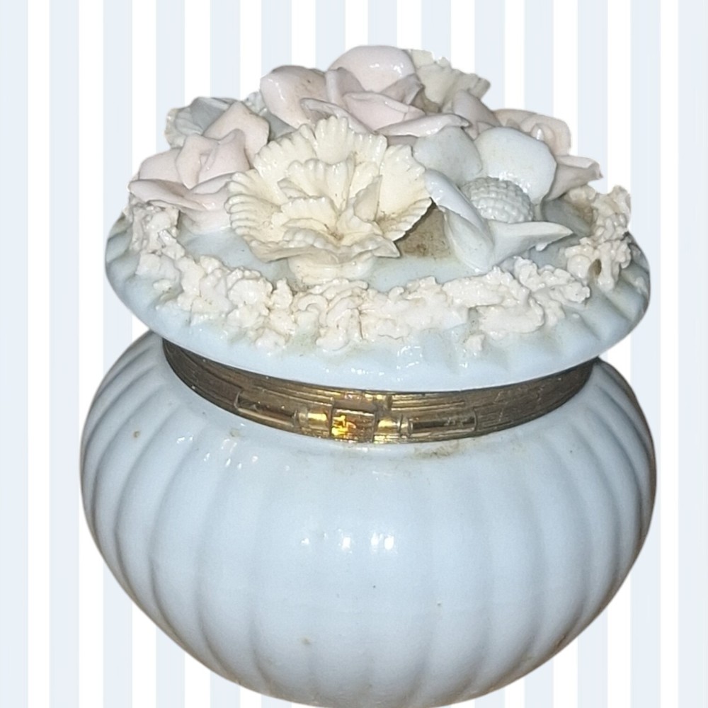Shape: Round Finish: Glossy Type: Trinket Box Color: White Pattern: Roses Size: Small Features: Boxed Brand: Unbranded Material: Porcelain Subject: Boxing