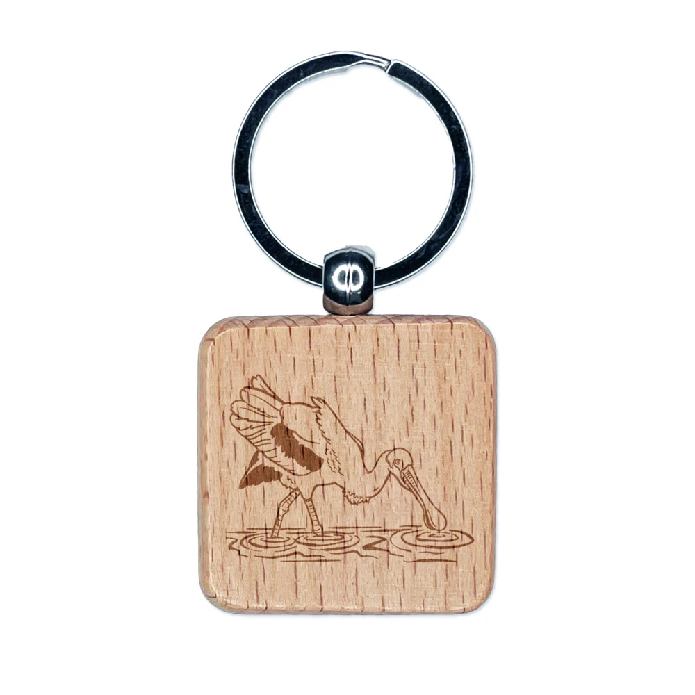 Roseate Spoonbill Wading in Water Bird Engraved Wood Square Keychain Tag Charm